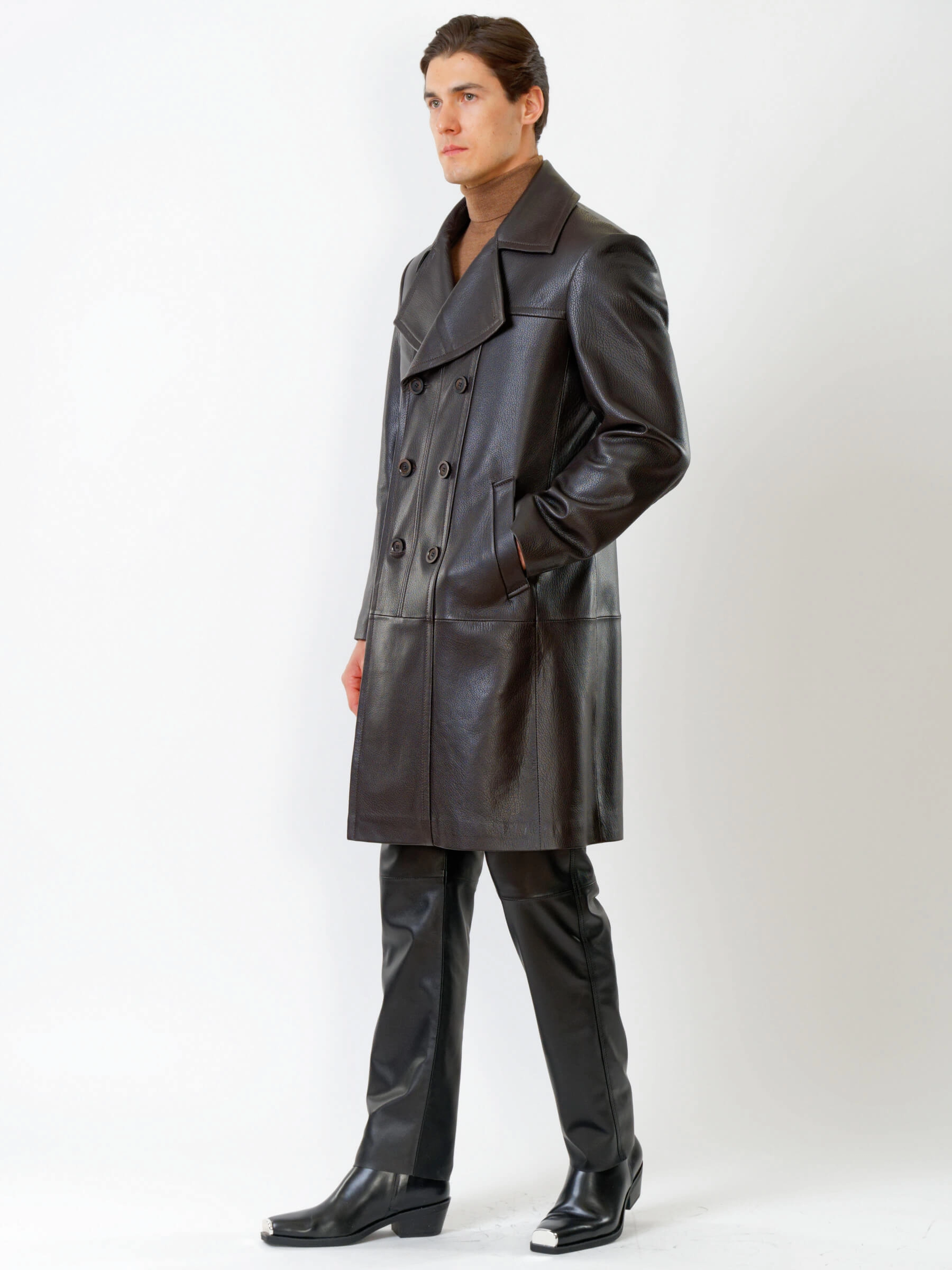 Товар двубортный мужской кожаный плащ премиум класса чикаго, коричневый, размер 46, артикул 28801 выполнен из натуральной кожи с застежкой пуговицы. Рассчитан на сезон: демисезон. Длина изделия 110 см, силуэт полуприлегающий.