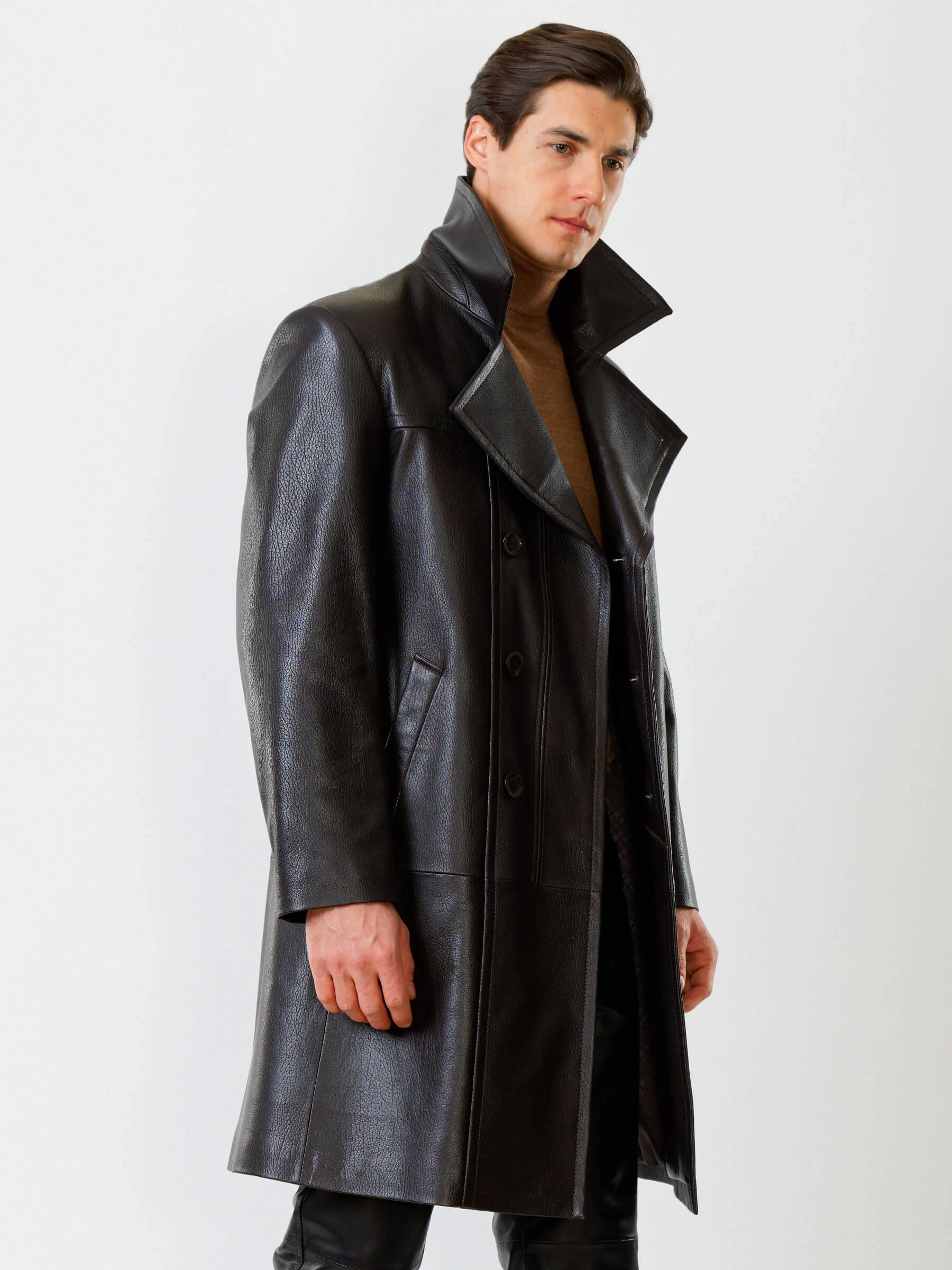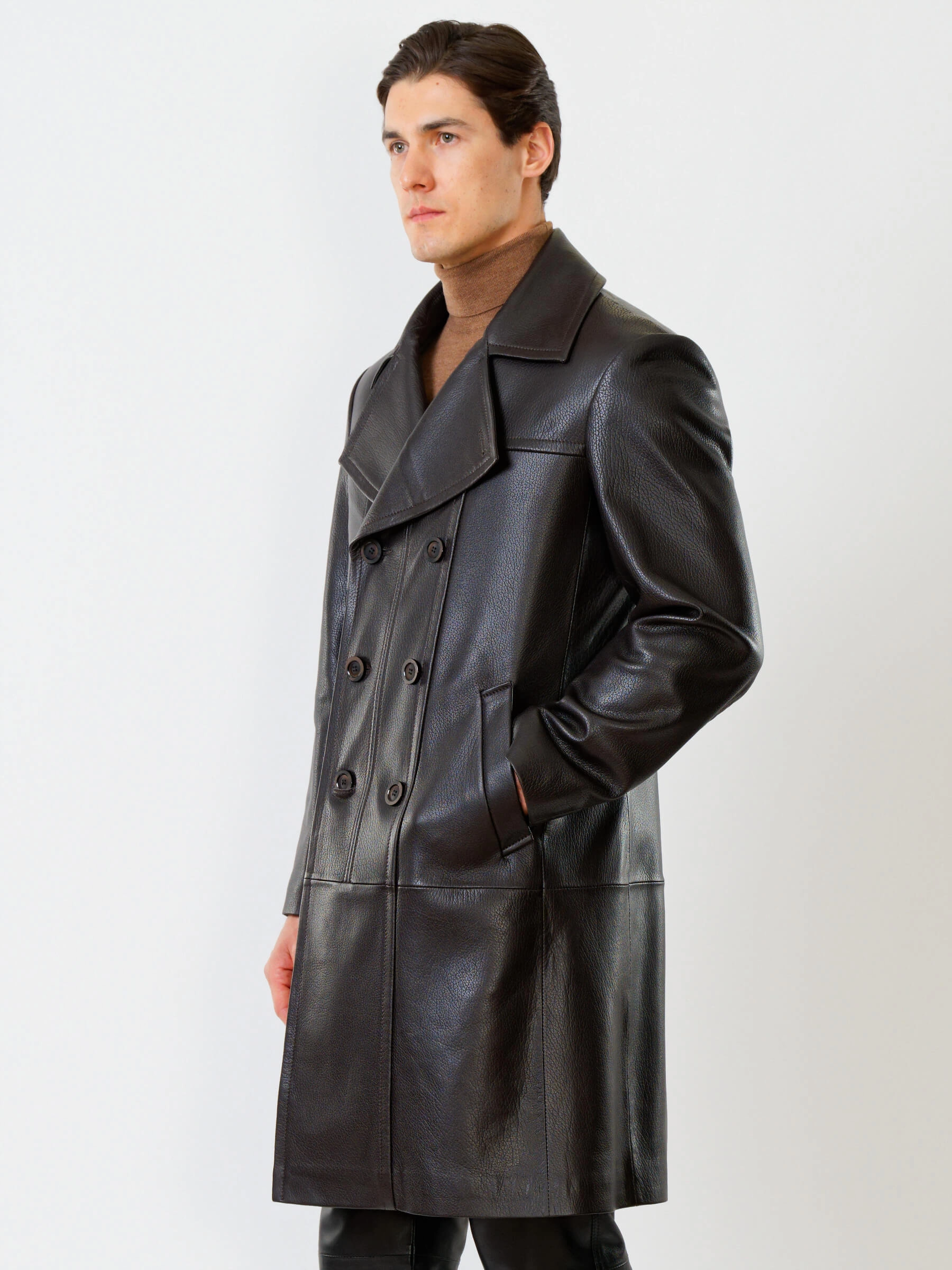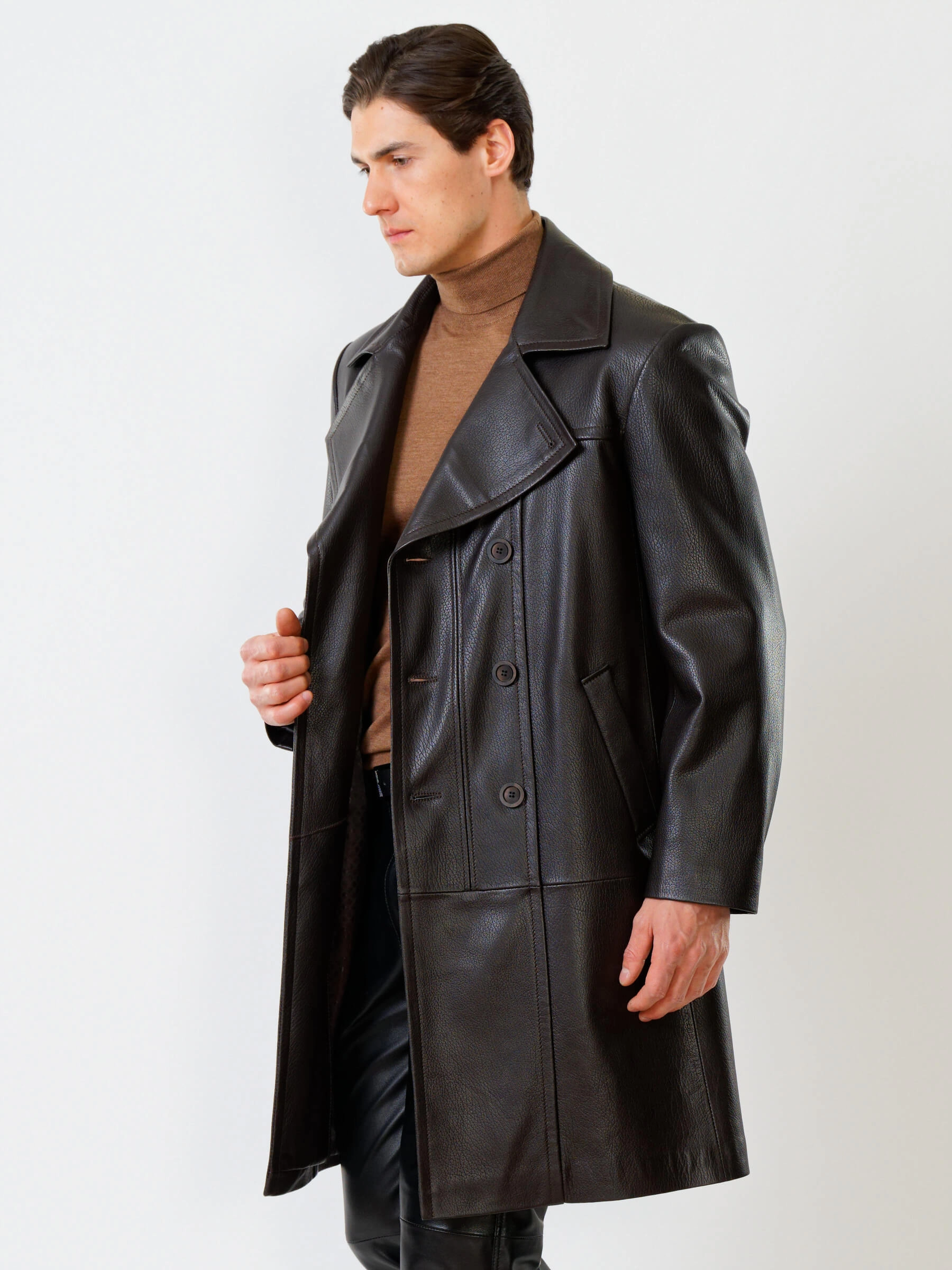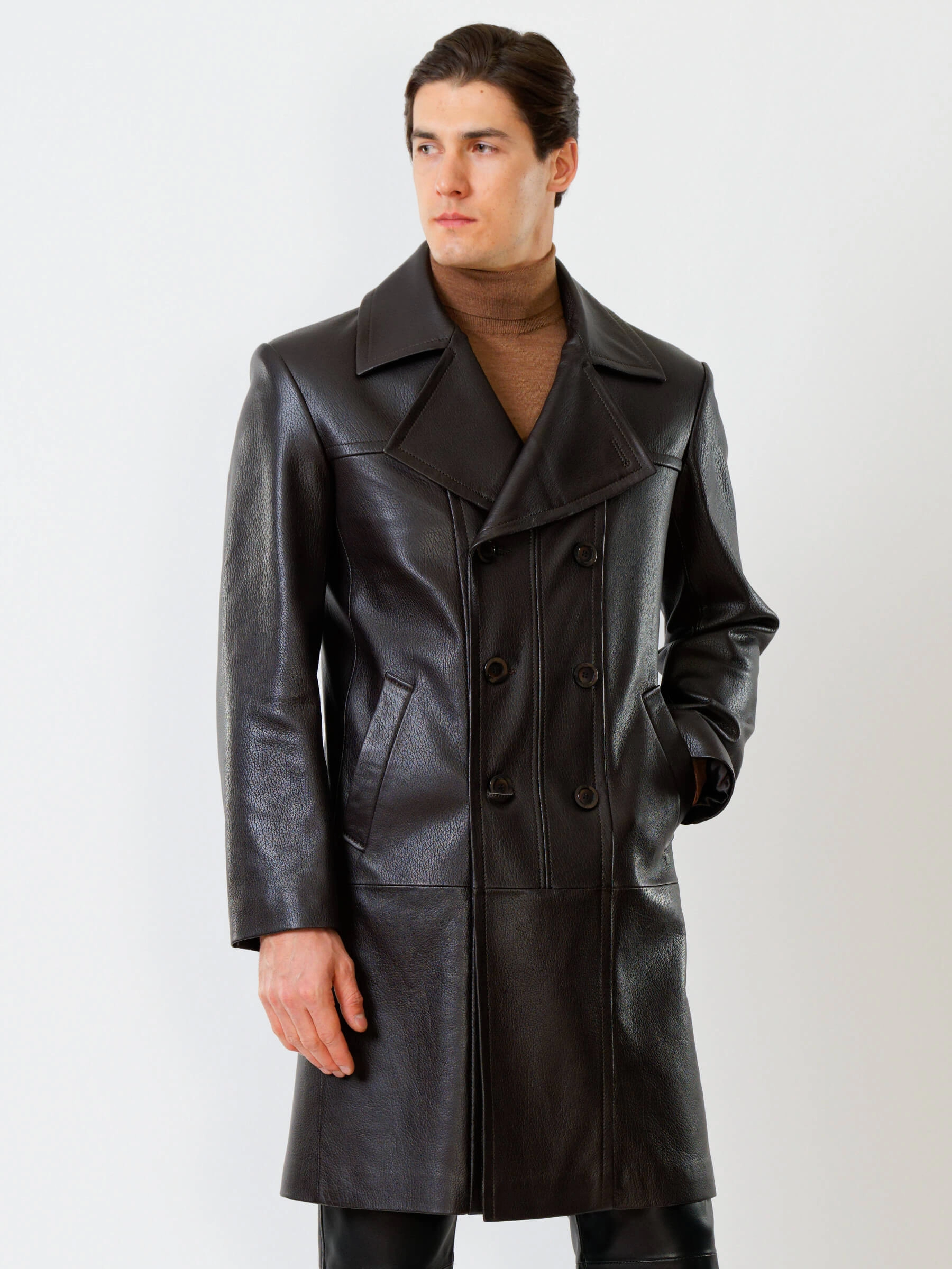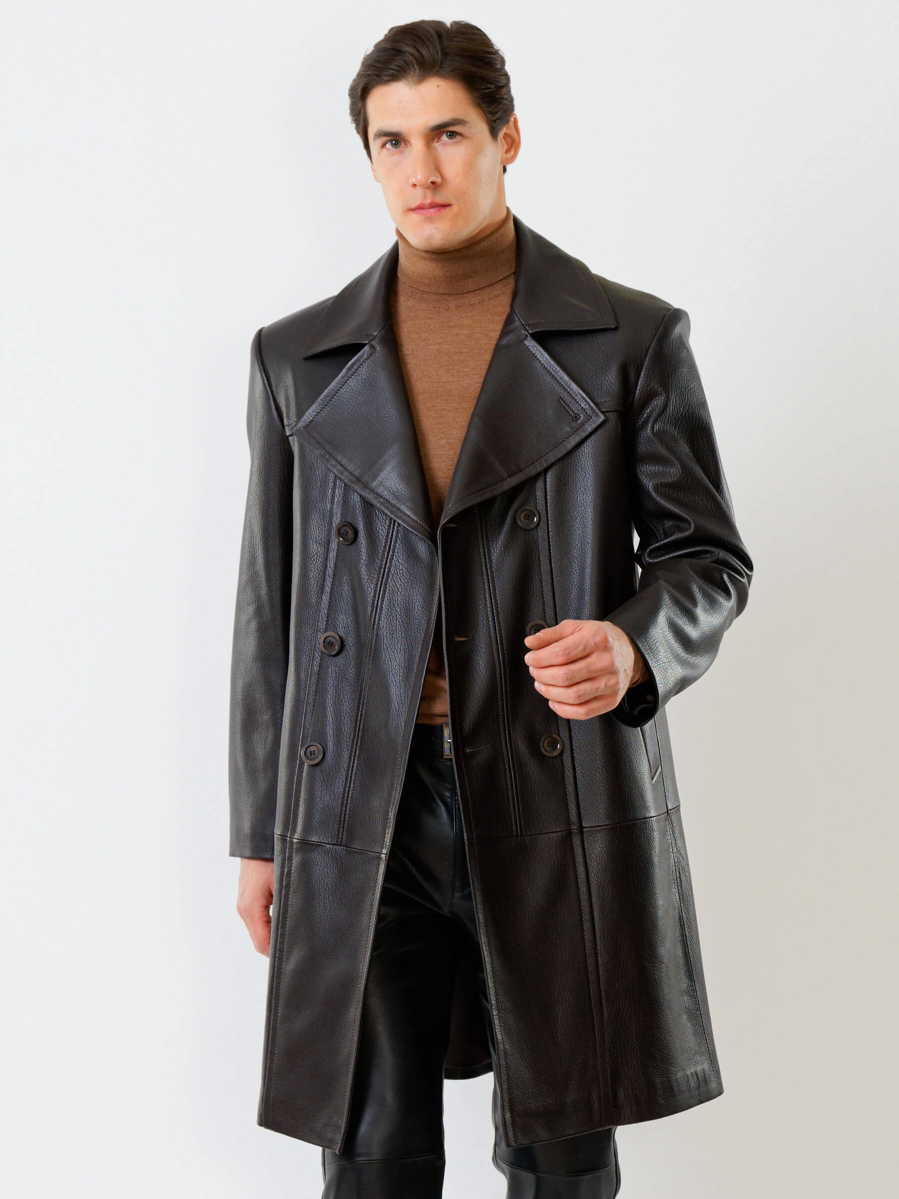 Двубортный кожаный плащ полуприлегающего силуэта с широкими лацканами и высокой шлицей- однозначно для тех, кто привык сочетать стиль и комфорт одновременно. Изделие выполнили из мягкой мелкозернистой кожи премиум класса. Безупречная посадка по фигуре. Предусмотрены боковые и внутренние застёгивающиеся карманы для документов. Прекрасное сочетание как со свободной одеждой, так и со строгим деловым костюмом.