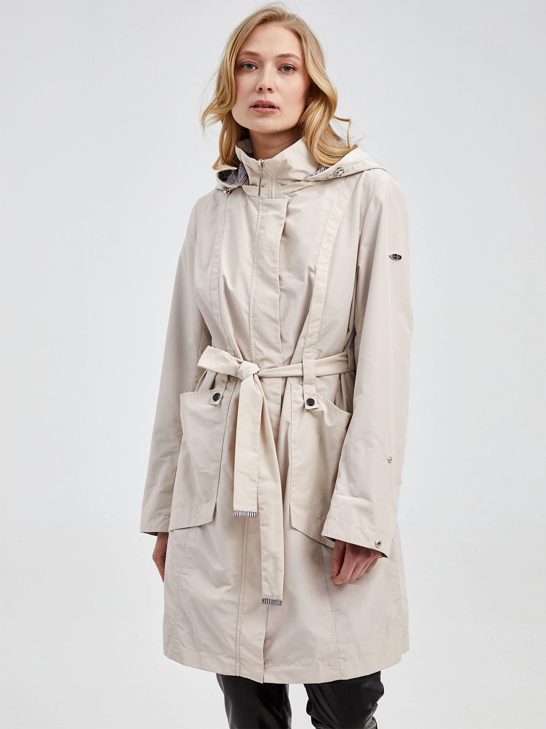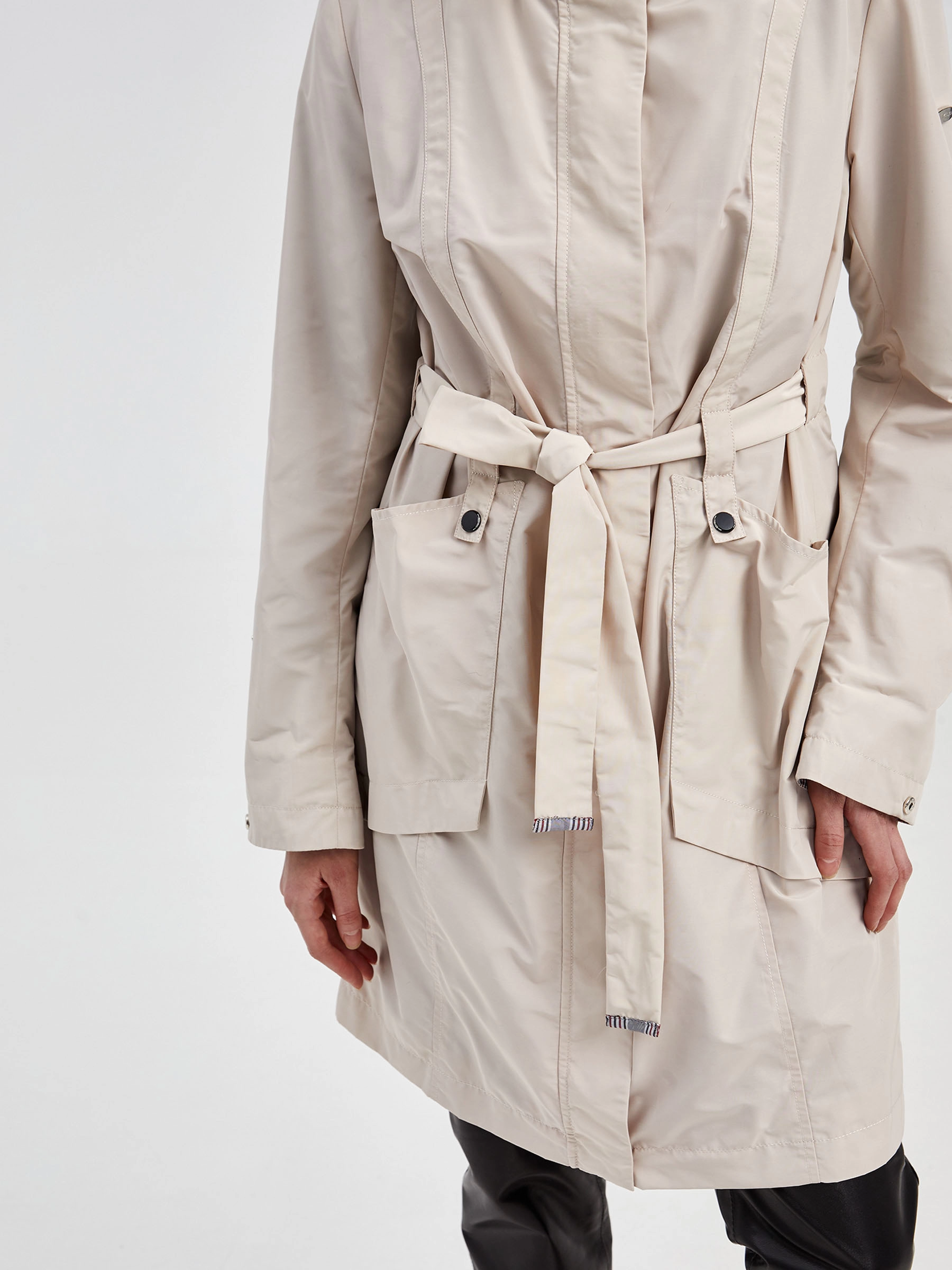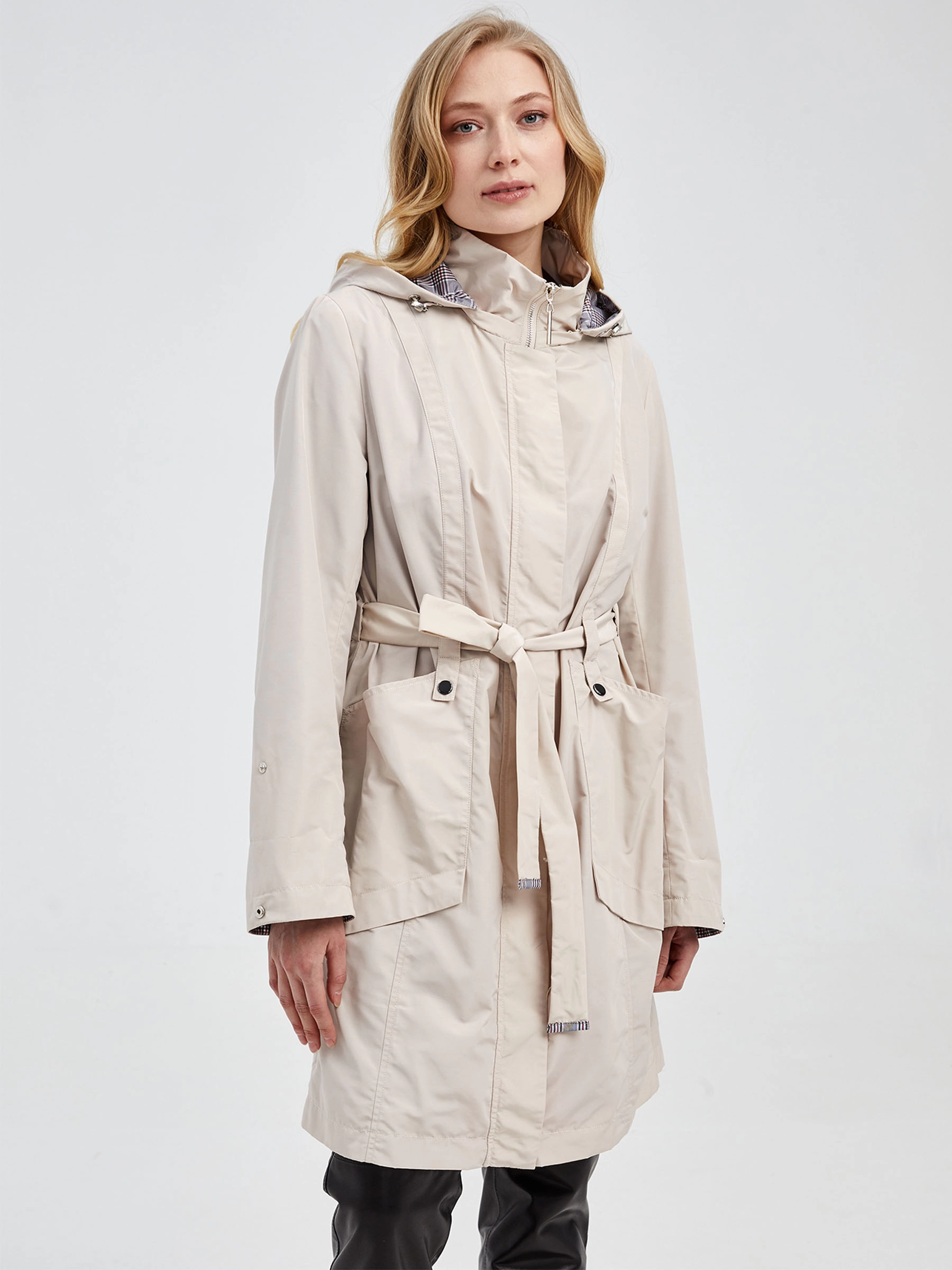 Текстильный женский плащ — актуальное и выигрышное приобретение для демисезонного гардероба. Модель приталенного силуэта длиной 90 см с втачными рукавами, аккуратным воротником-стойкой и удобным съемным капюшоном. Длинный пояс эффектно подчеркивает линию талии, создавая женственный силуэт. Застежка на молнию с ветрозащитным клапаном на кнопках обеспечивает надежный комфорт в ветреную погоду, а практичные накладные карманы по бокам дополняют функциональность образа. Подкладка выполнена из 100% полиэстера. Этот универсальный повседневный плащ идеально сочетается с джинсами, платьями или юбками, добавляя образу динамичный акцент и становясь отличным выбором для городских прогулок.