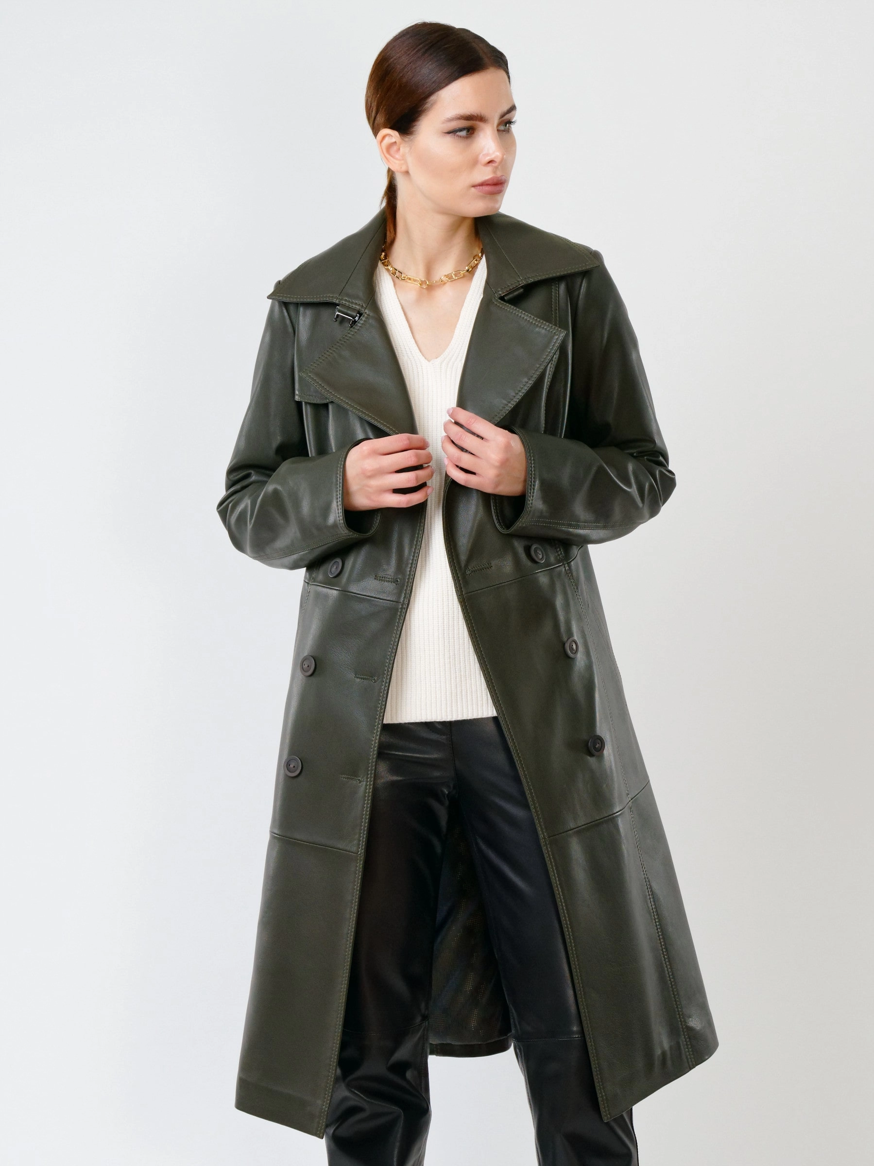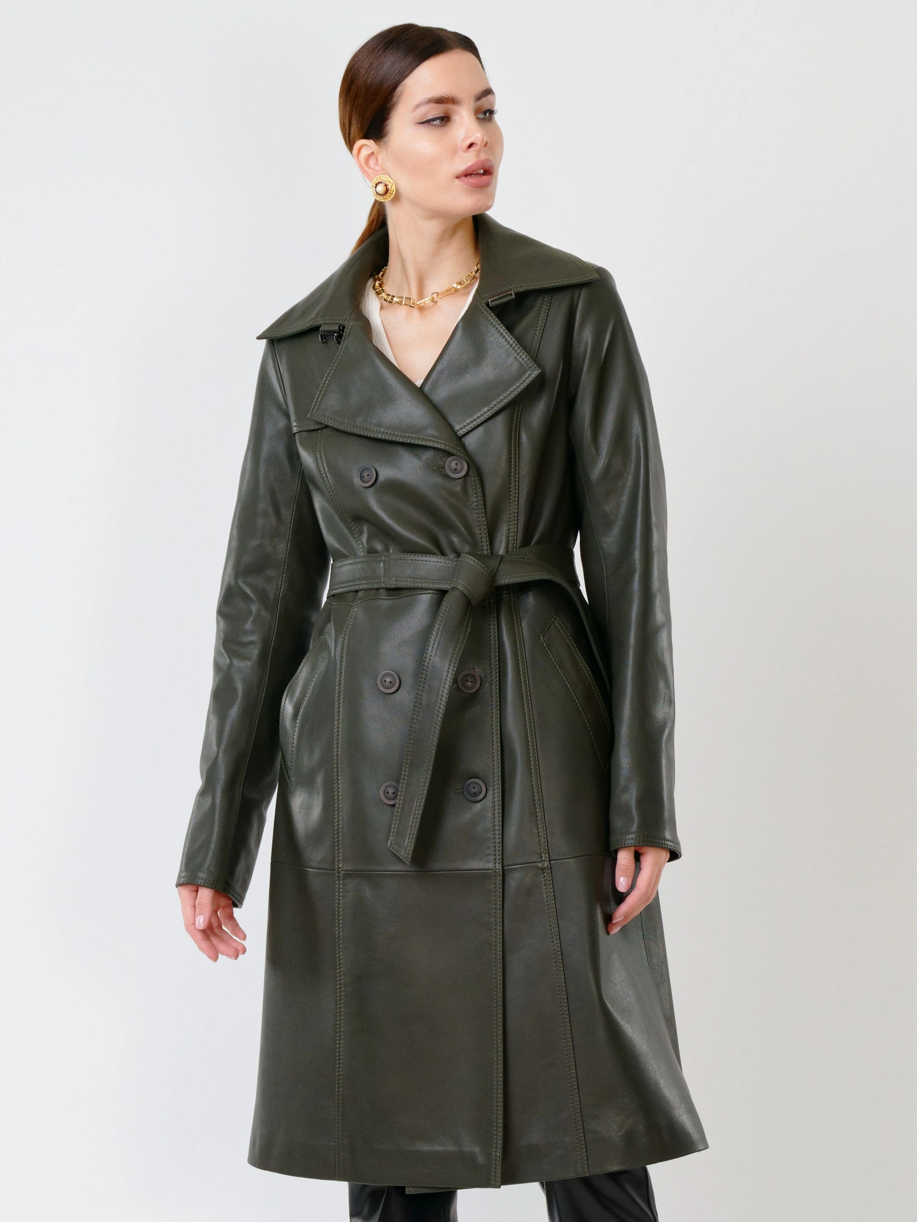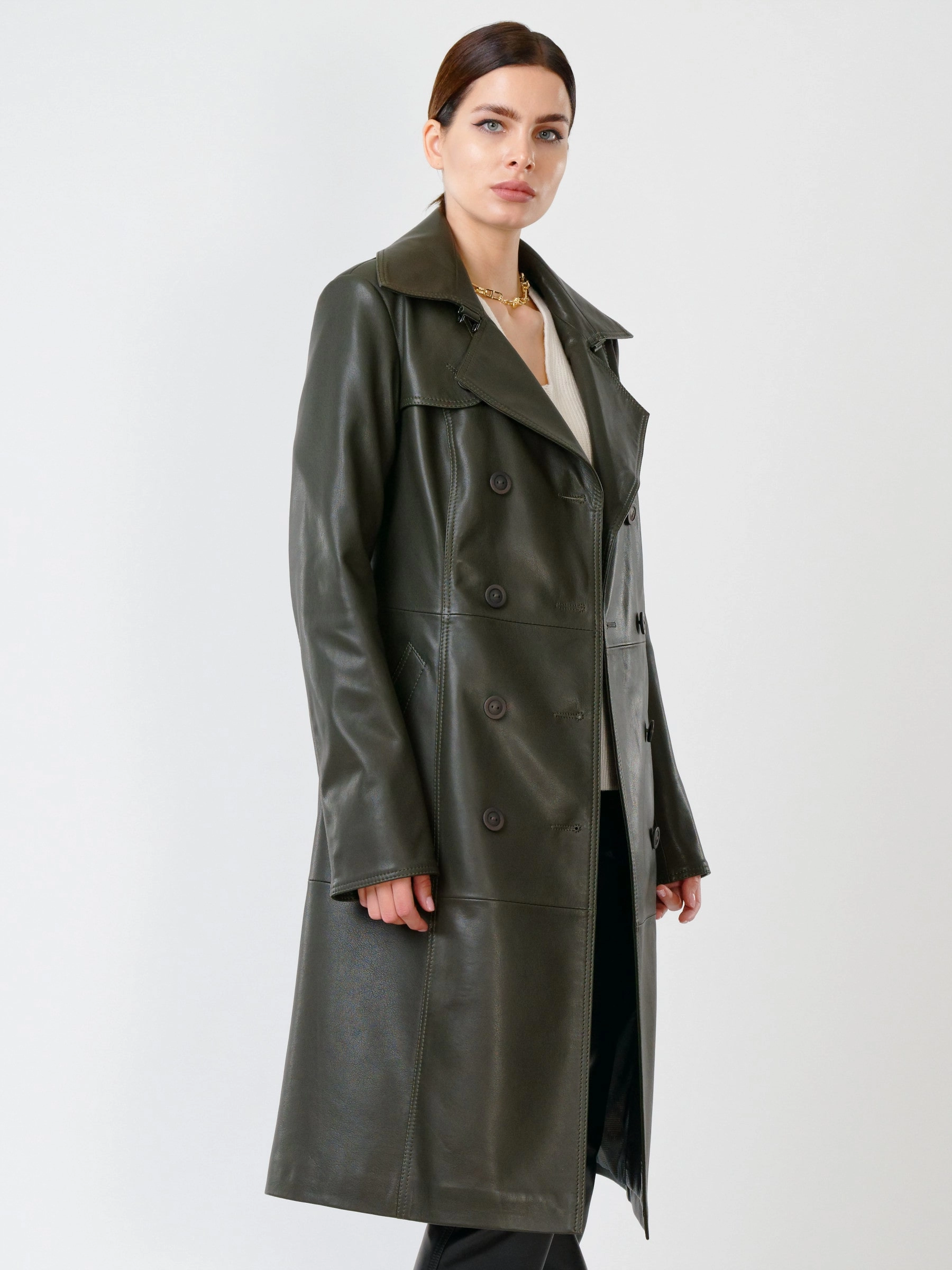 Кожаный двубортный женский плащ с поясом 3003, оливковый, размер 48, артикул 15640