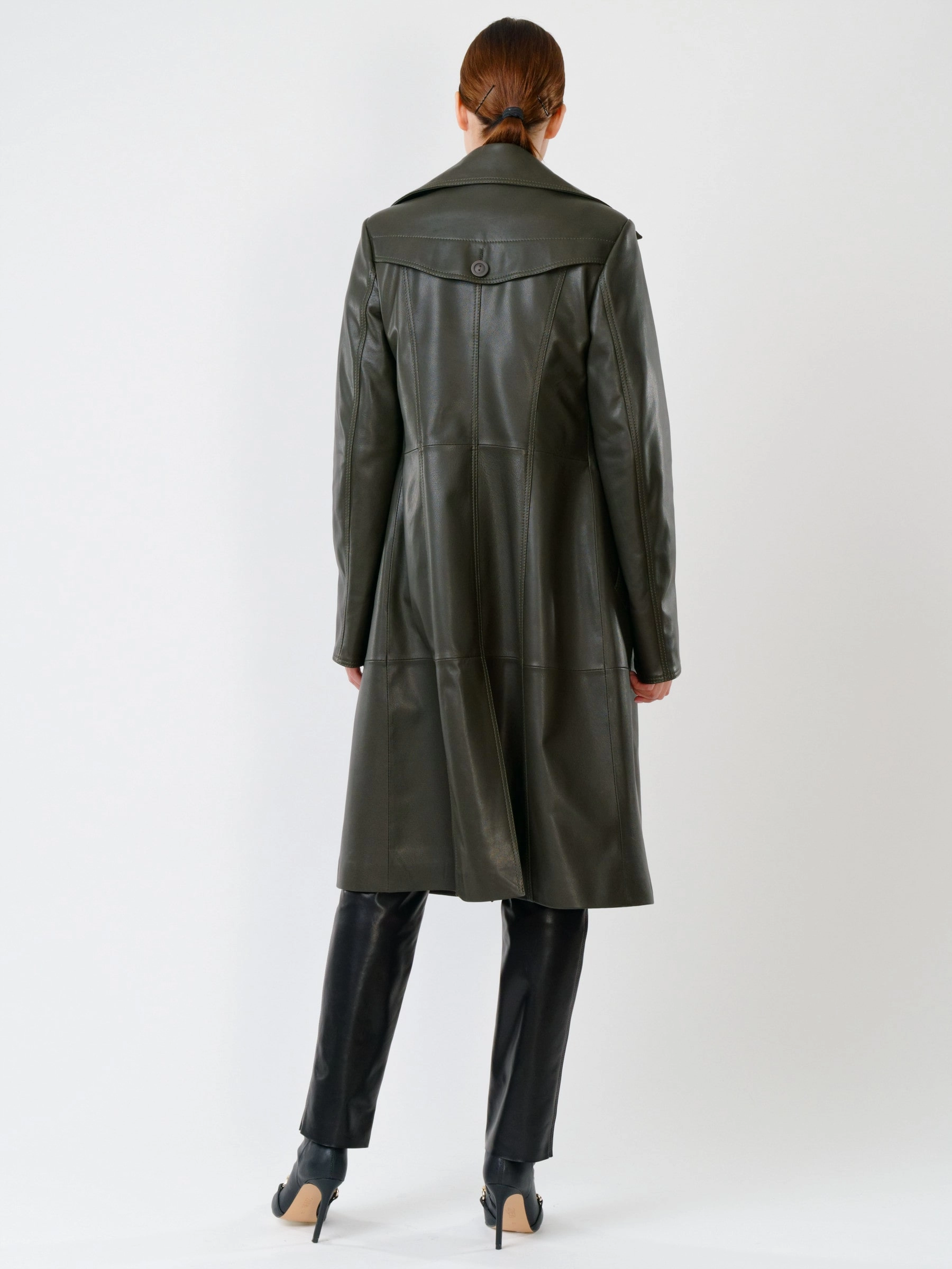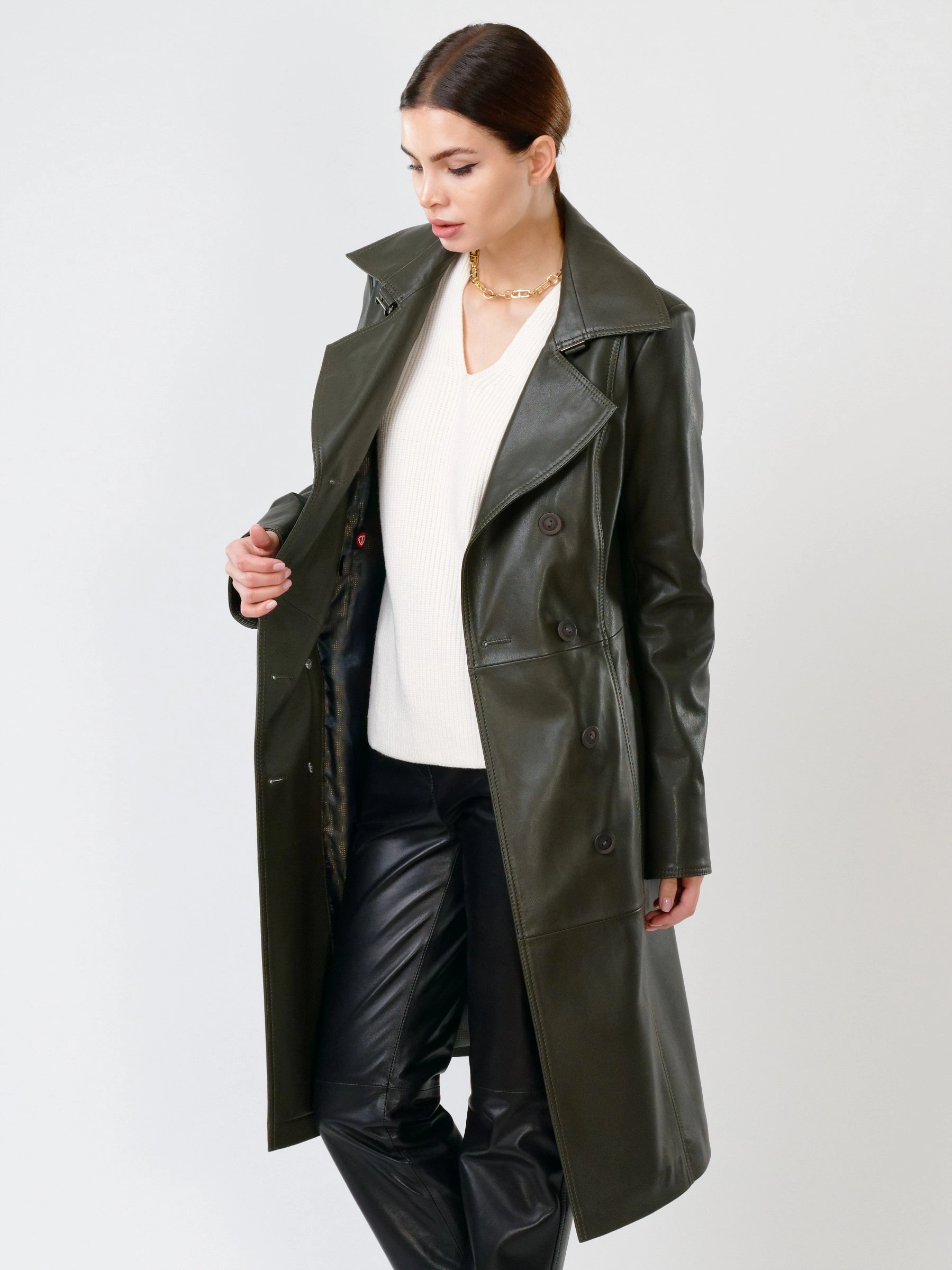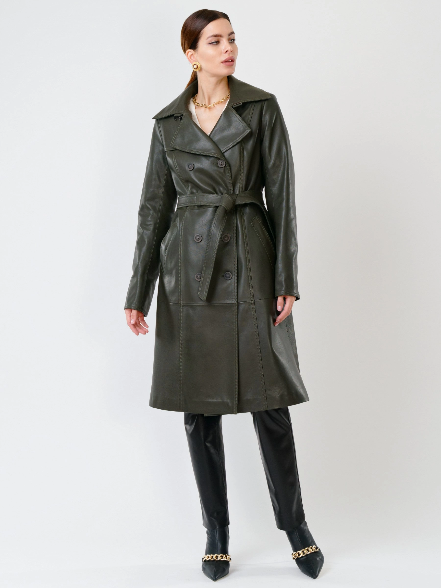 Кожаный двубортный женский плащ с поясом 3003, оливковый, размер 48, артикул 15640
