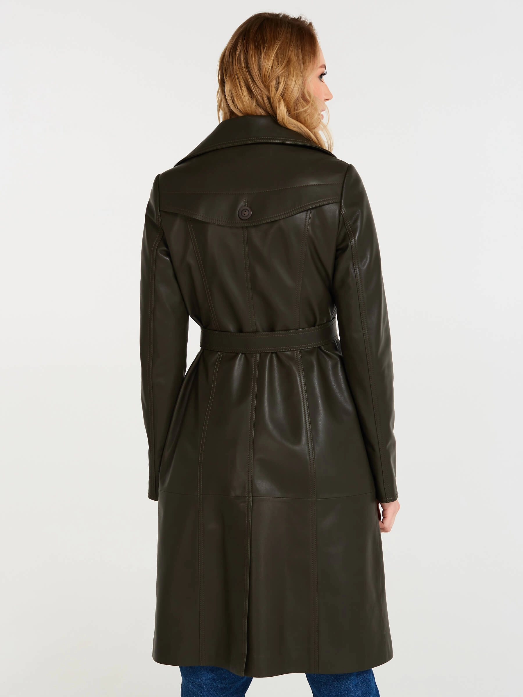 Кожаный двубортный женский плащ с поясом 3003, оливковый, размер 48, артикул 60551