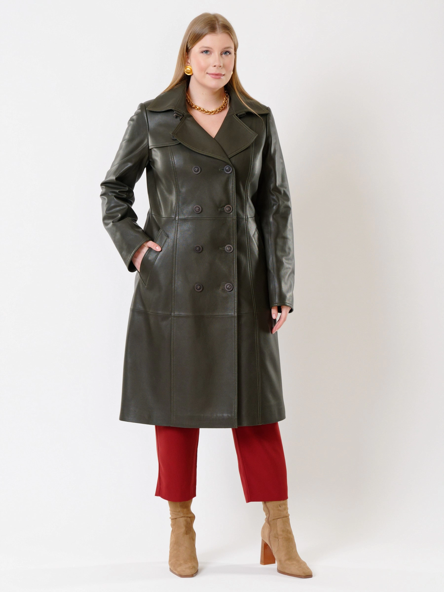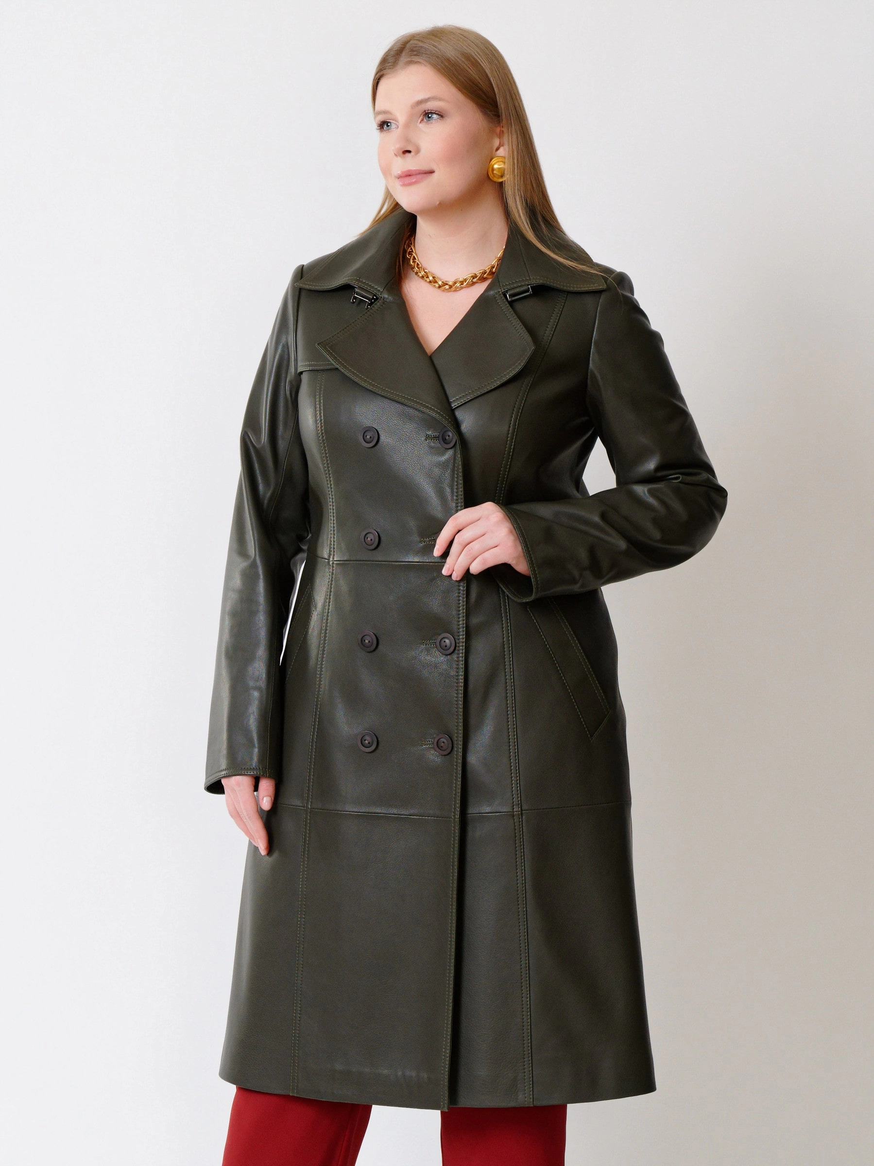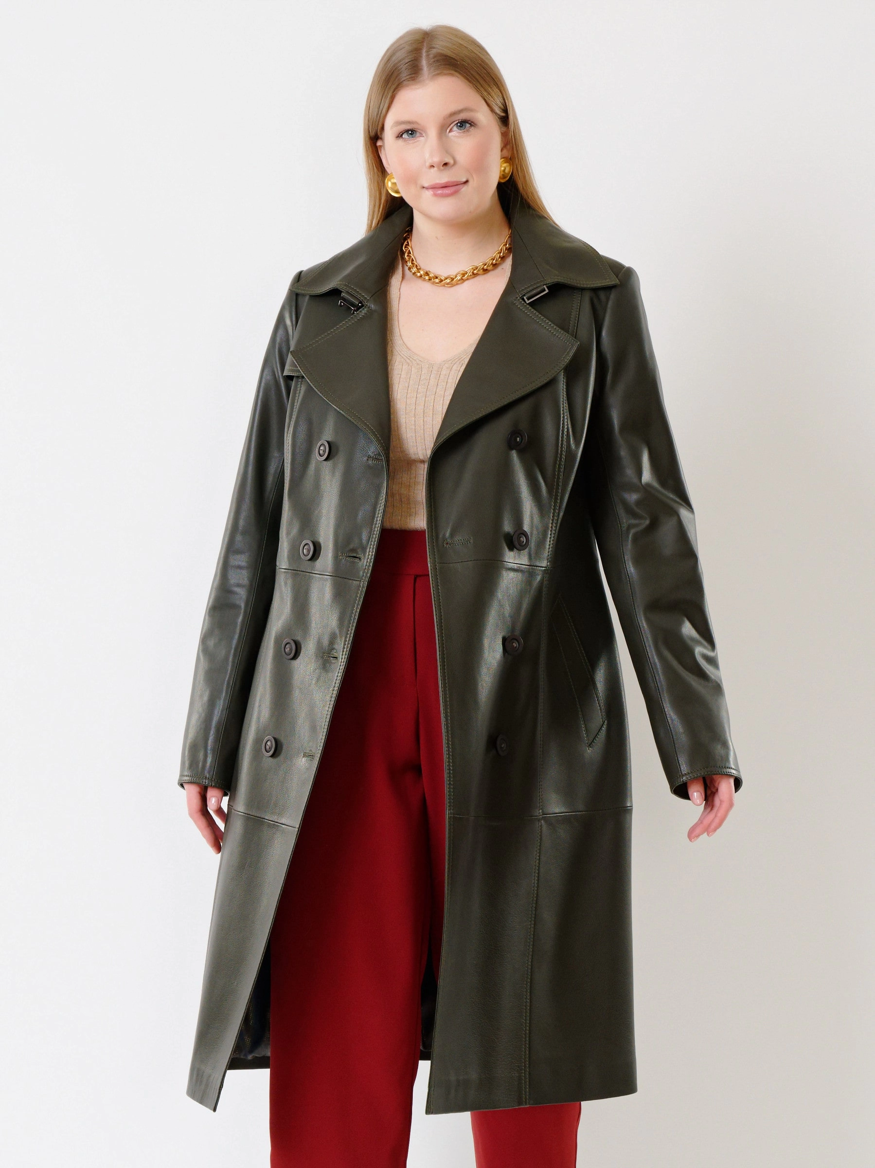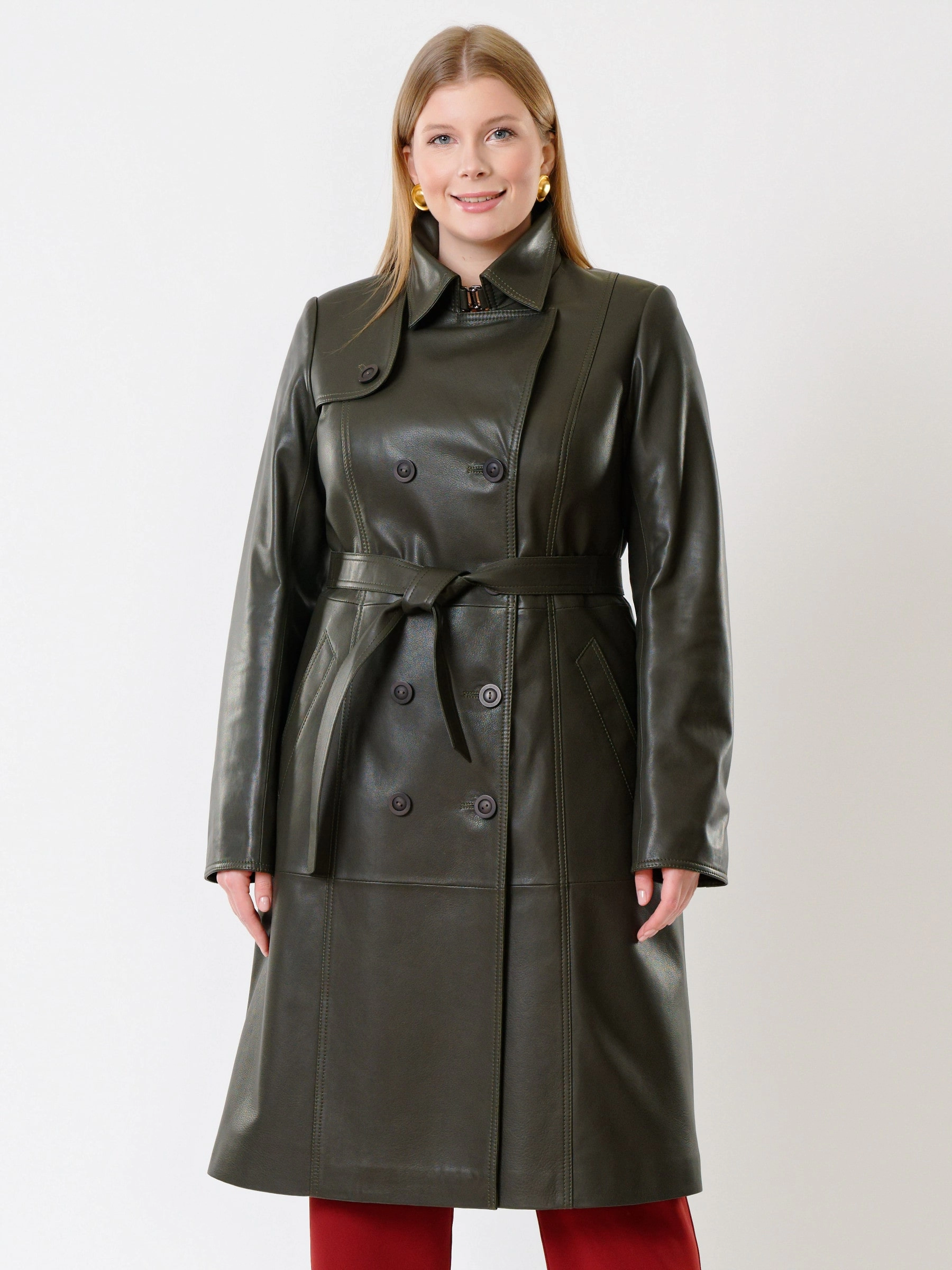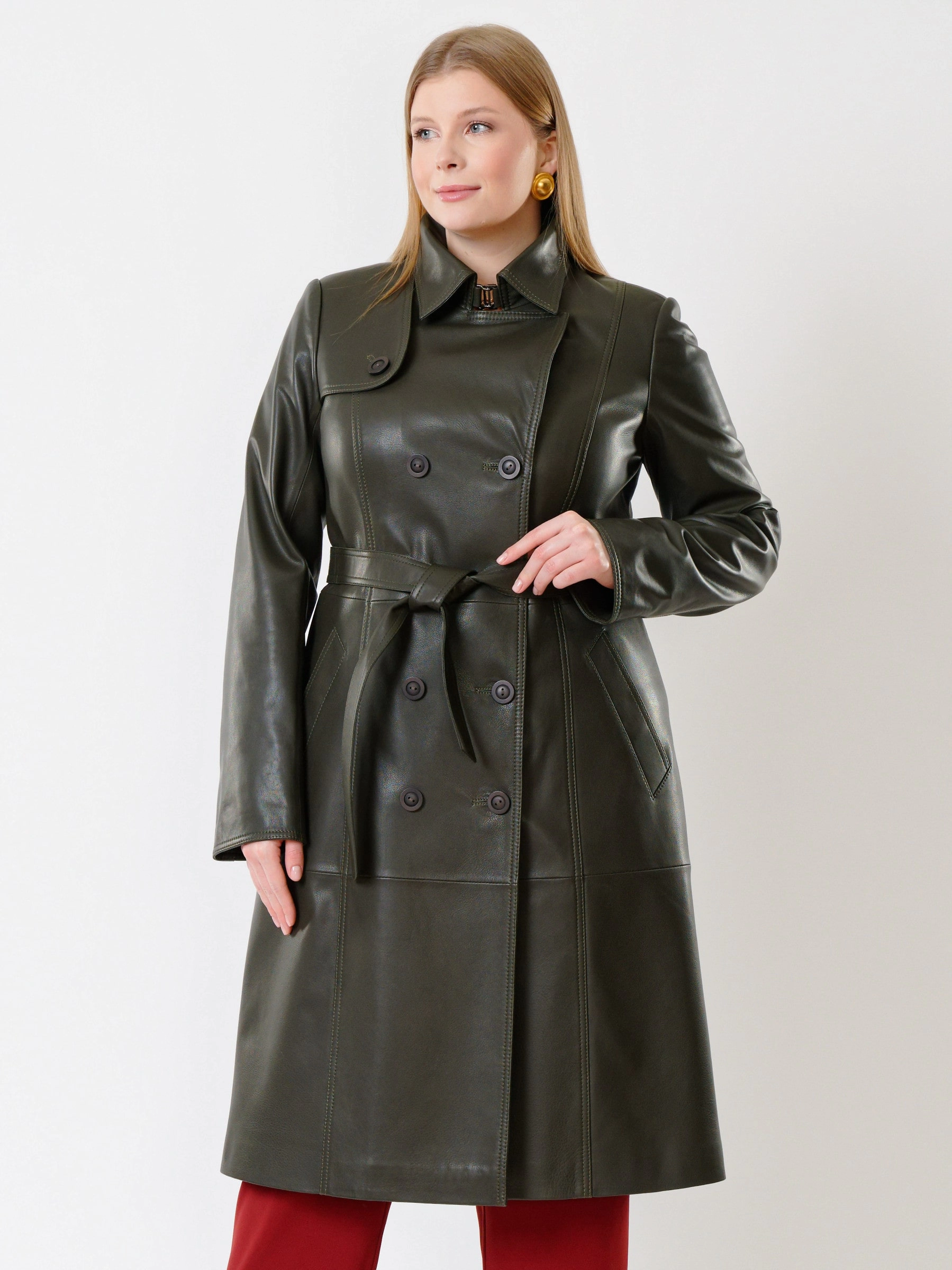 Кожаный двубортный женский плащ с поясом 3003, оливковый, размер 48, артикул 91374