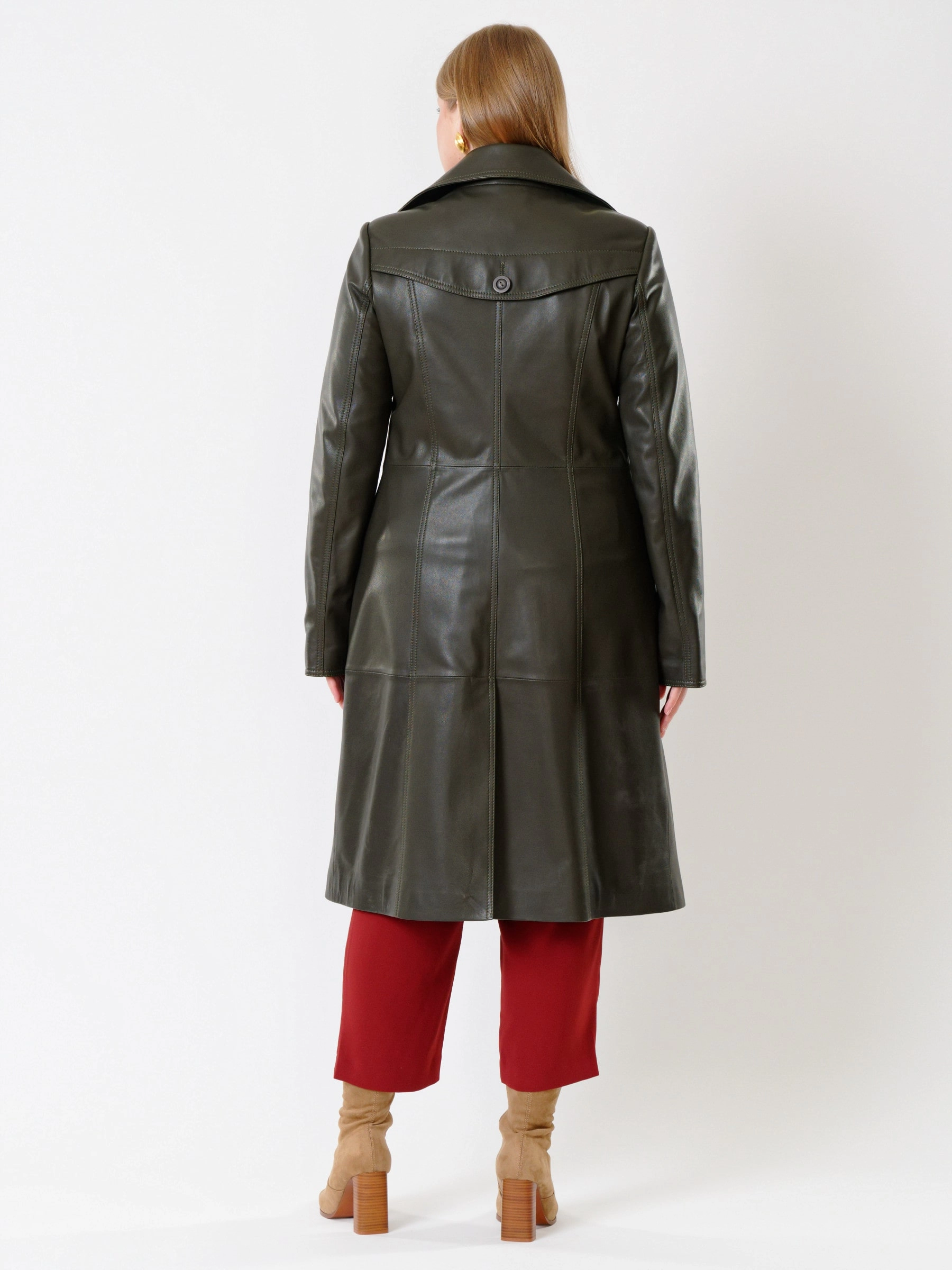 Элегантный кожаный плащ на пуговицах! Изготовленный из роскошной натуральной кожи нежнейшей выделки, двубортный тренч полуприлегающего силуэта обеспечивает идеальную посадку. Его отличает классический английский воротник на стойке и кожаный пояс, который подчеркнёт талию. Функциональность дополняют врезные карманы, втачные рукава с регулируемыми манжетами-отворотами и аккуратная шлица сзади. Этот универсальный повседневный плащ станет непререкаемым фаворитом вашего гардероба, великолепно сочетаясь с платьями, брючными костюмами или джинсами и дополняясь кожаными аксессуарами.