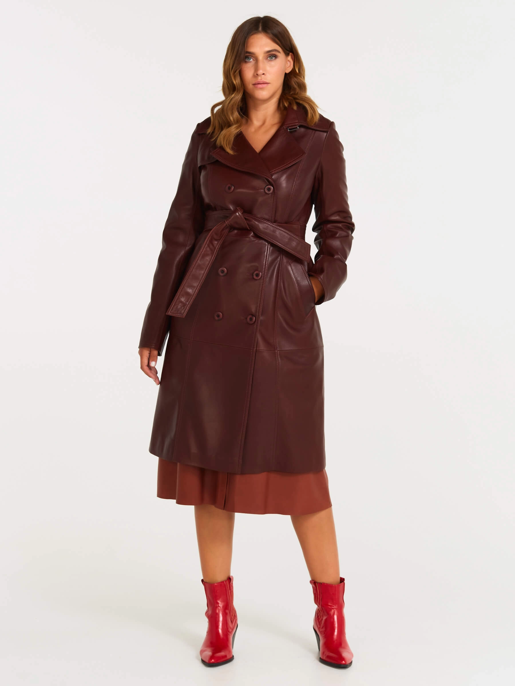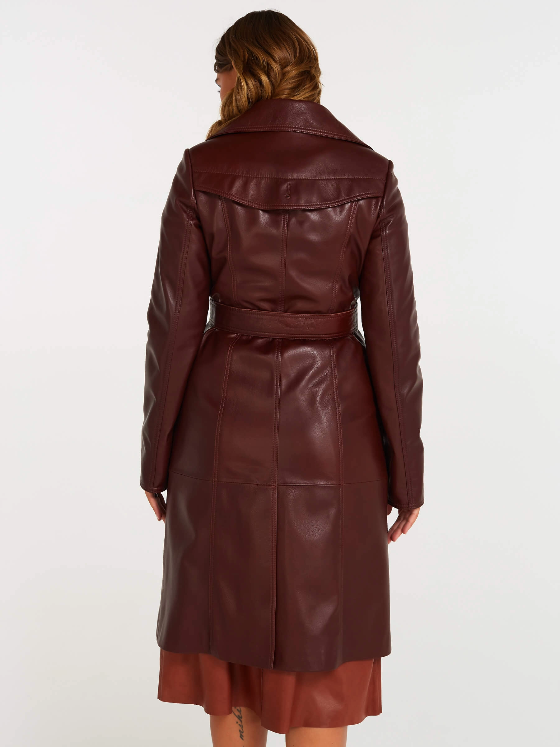 Кожаный двубортный женский плащ с поясом 3003, ореховый, размер 48, артикул 60584