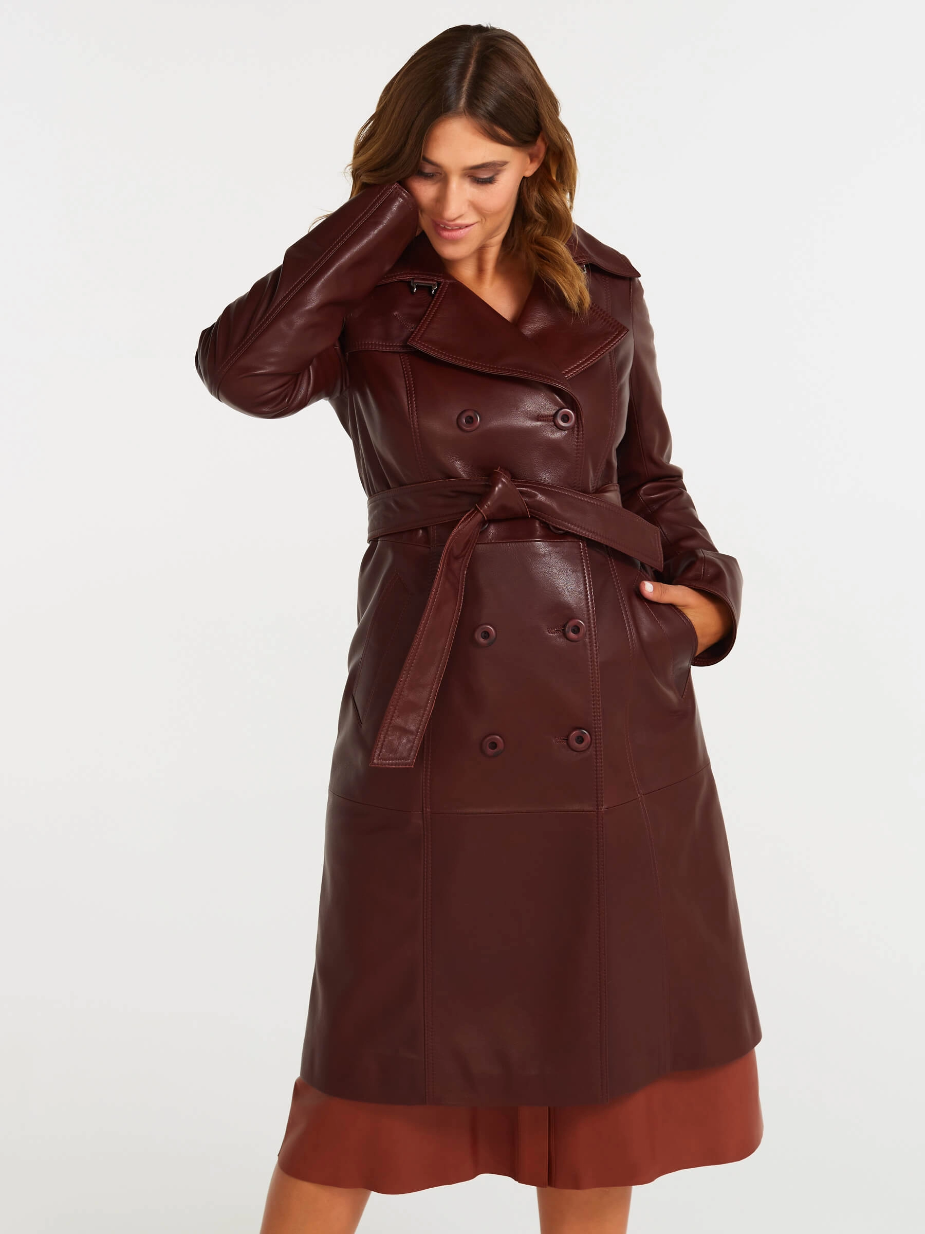 Товар кожаный двубортный женский плащ с поясом 3003, ореховый, размер 48, артикул 60584 выполнен из натуральной кожи с застежкой пуговицы. Рассчитан на сезон: демисезон. Длина изделия 108 см, силуэт полуприлегающий.