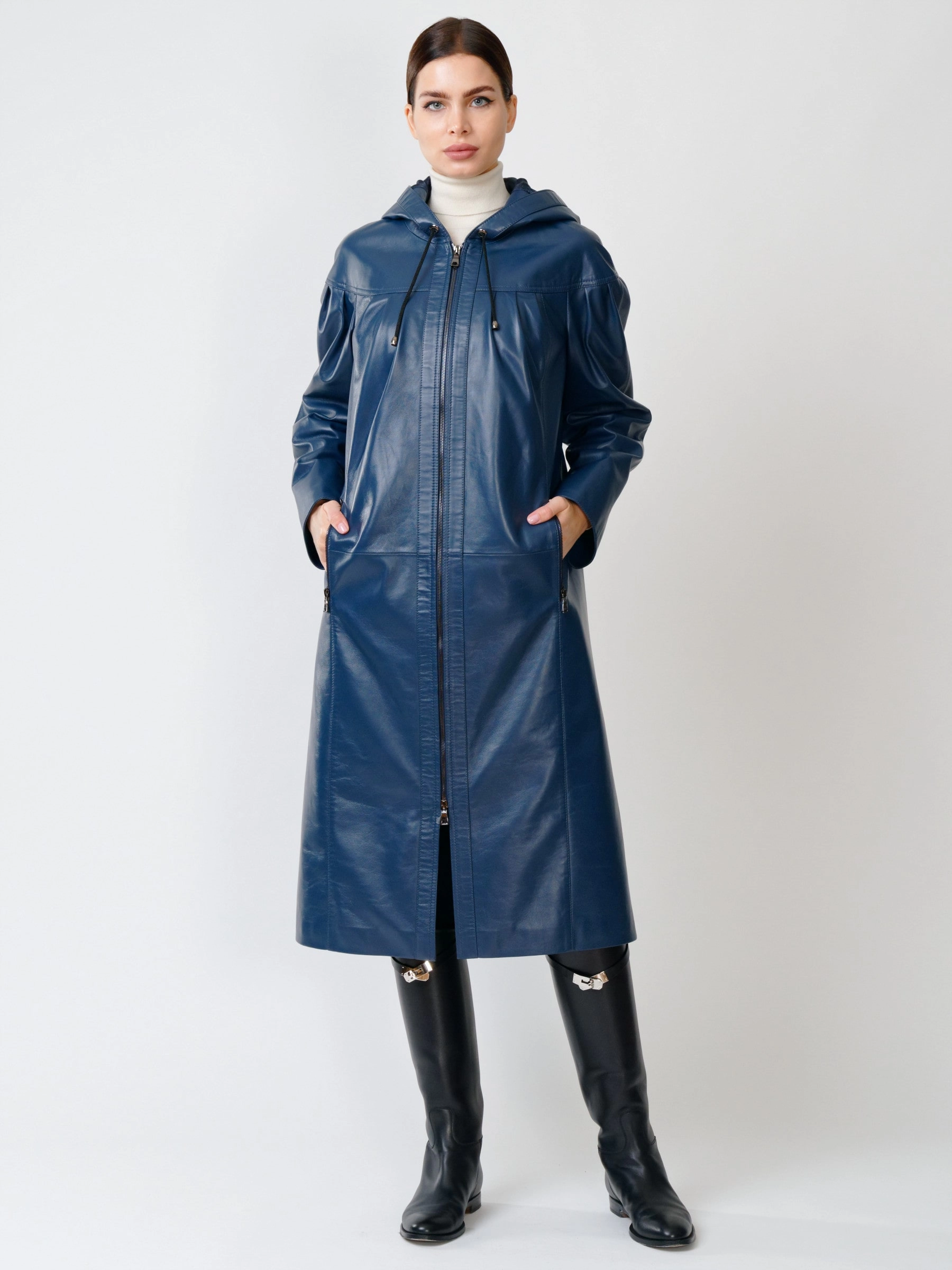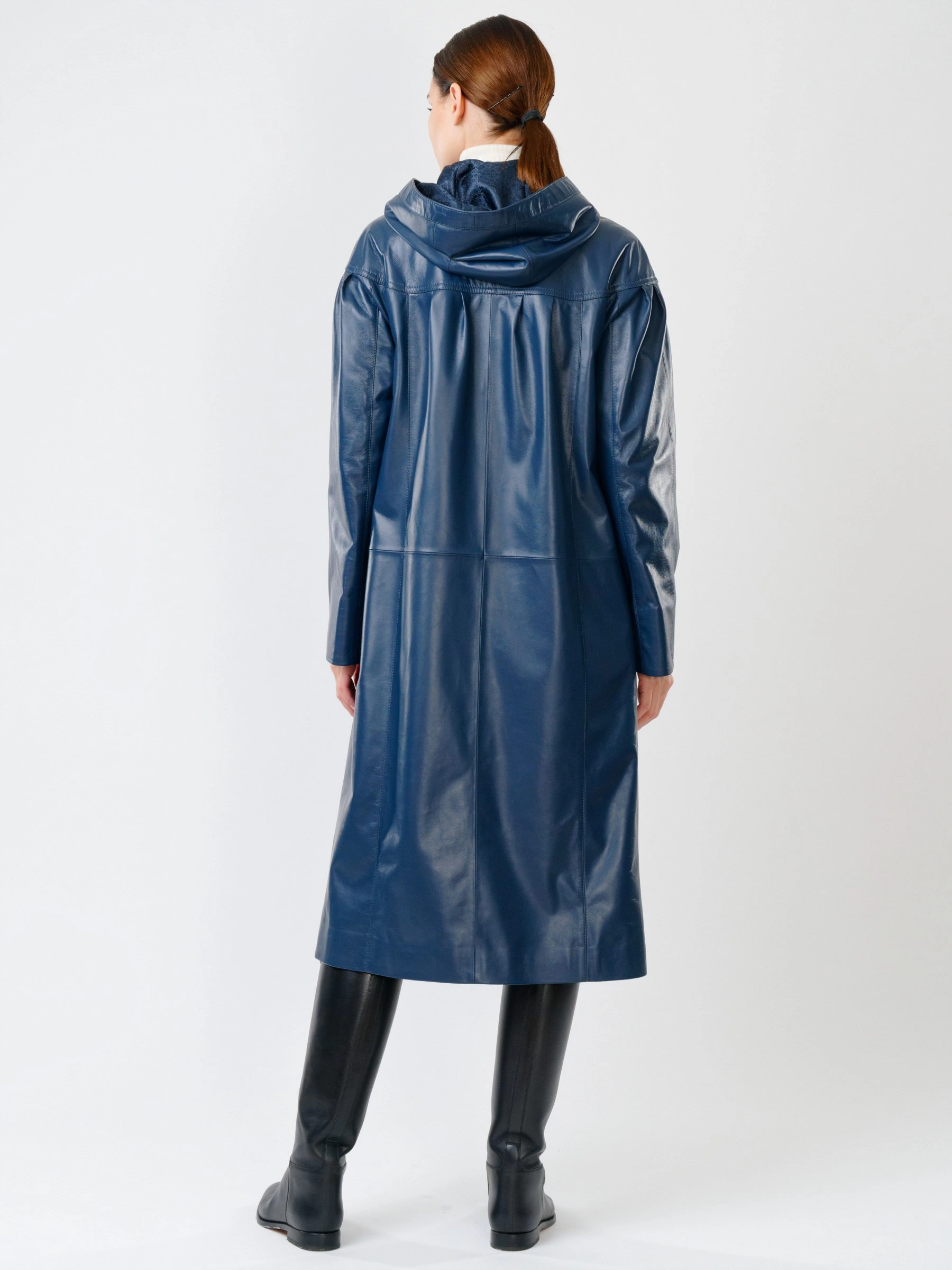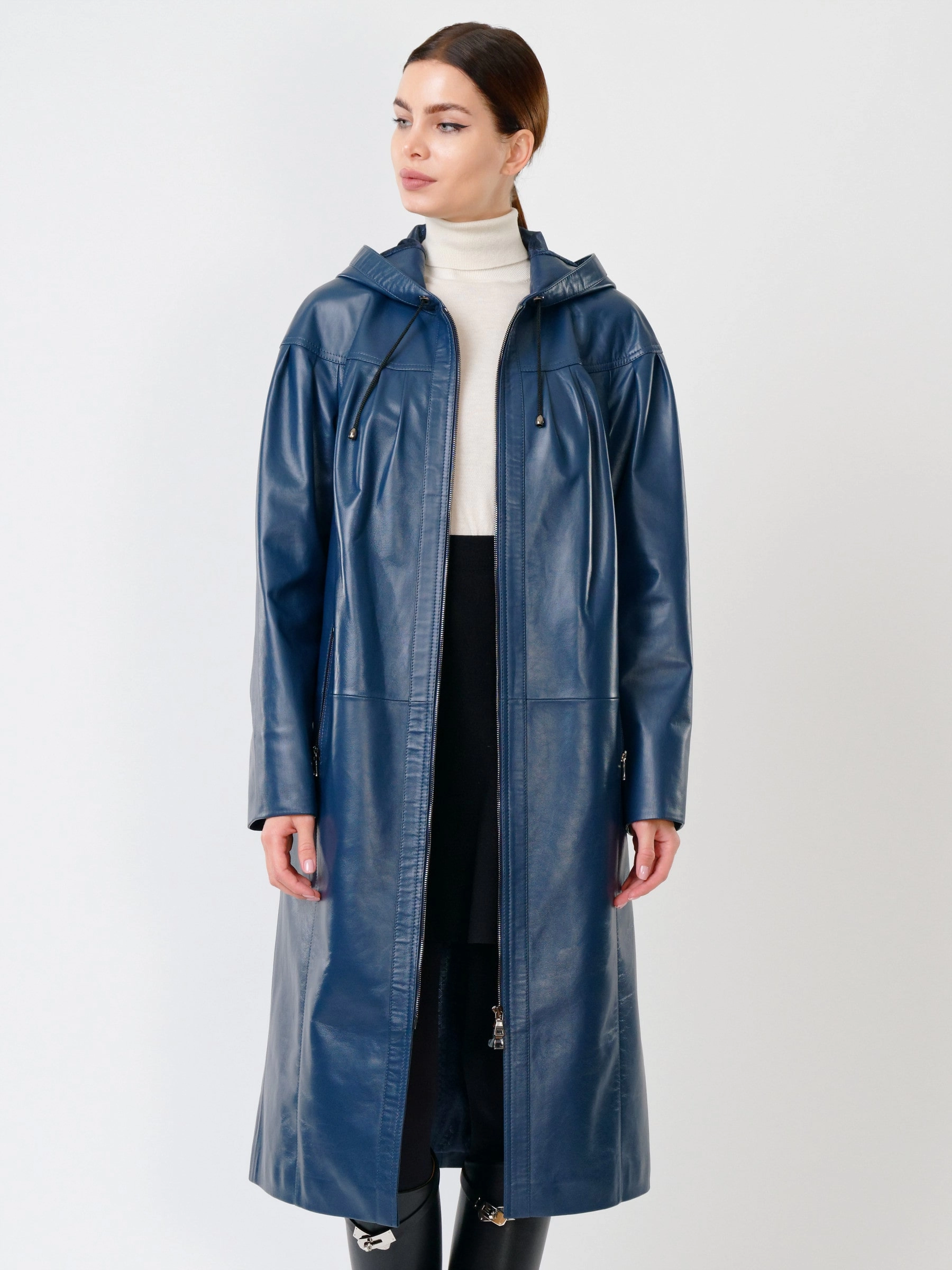 Кожаный длинный женский плащ с капюшоном 3009, синий, размер 48, артикул 90770
