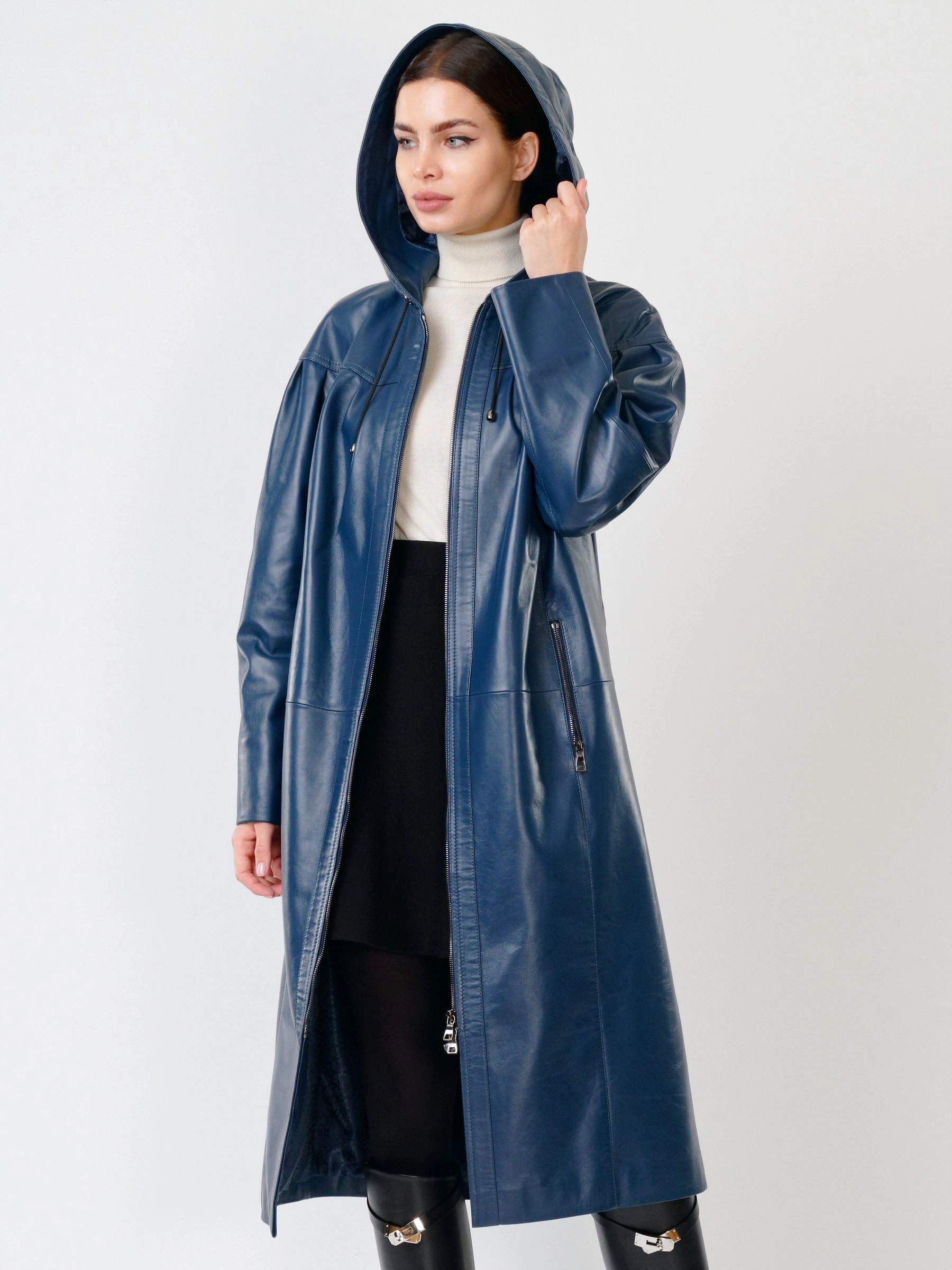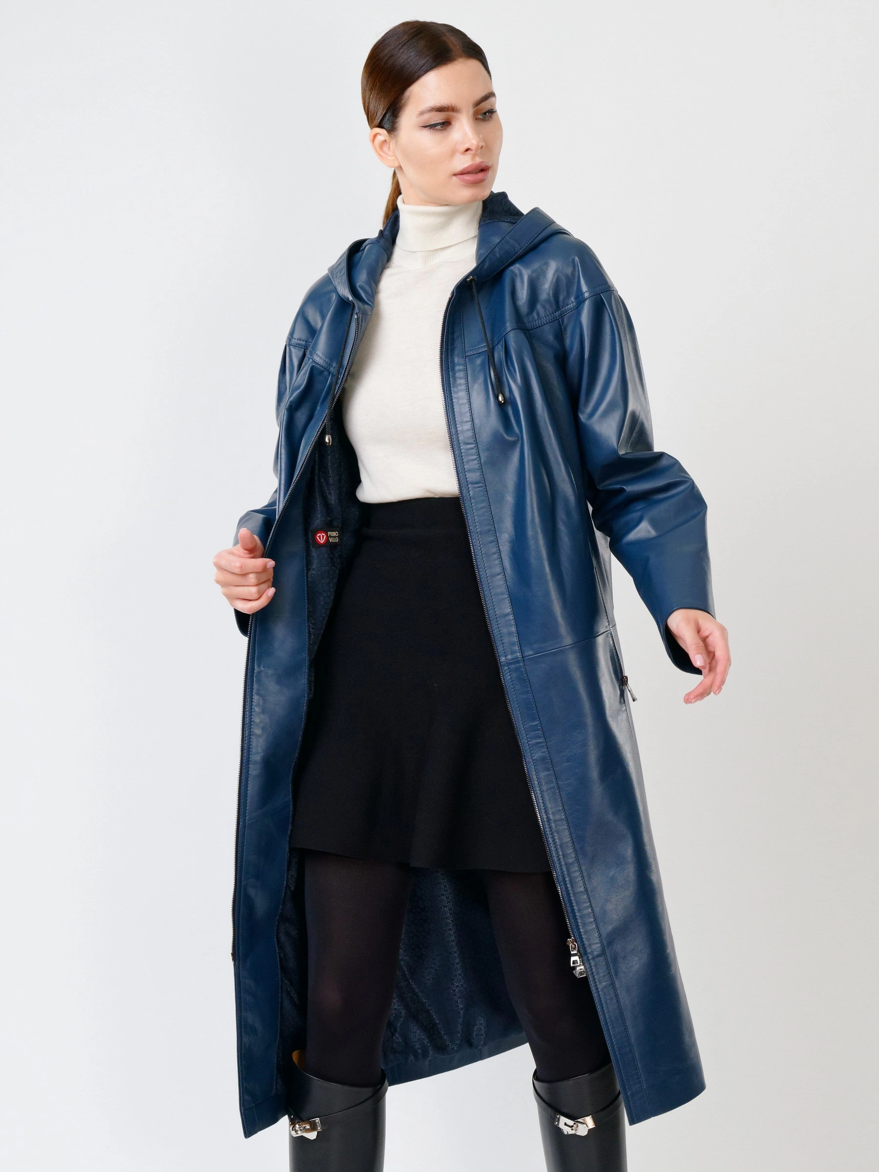 Товар кожаный длинный женский плащ с капюшоном 3009, синий, размер 48, артикул 90770 выполнен из натуральной кожи с застежкой молния. Рассчитан на сезон: демисезон. Длина изделия 113 см, силуэт свободный.
