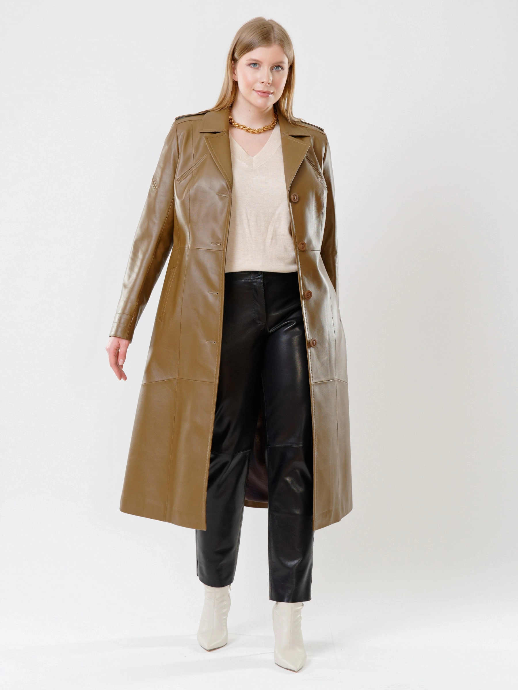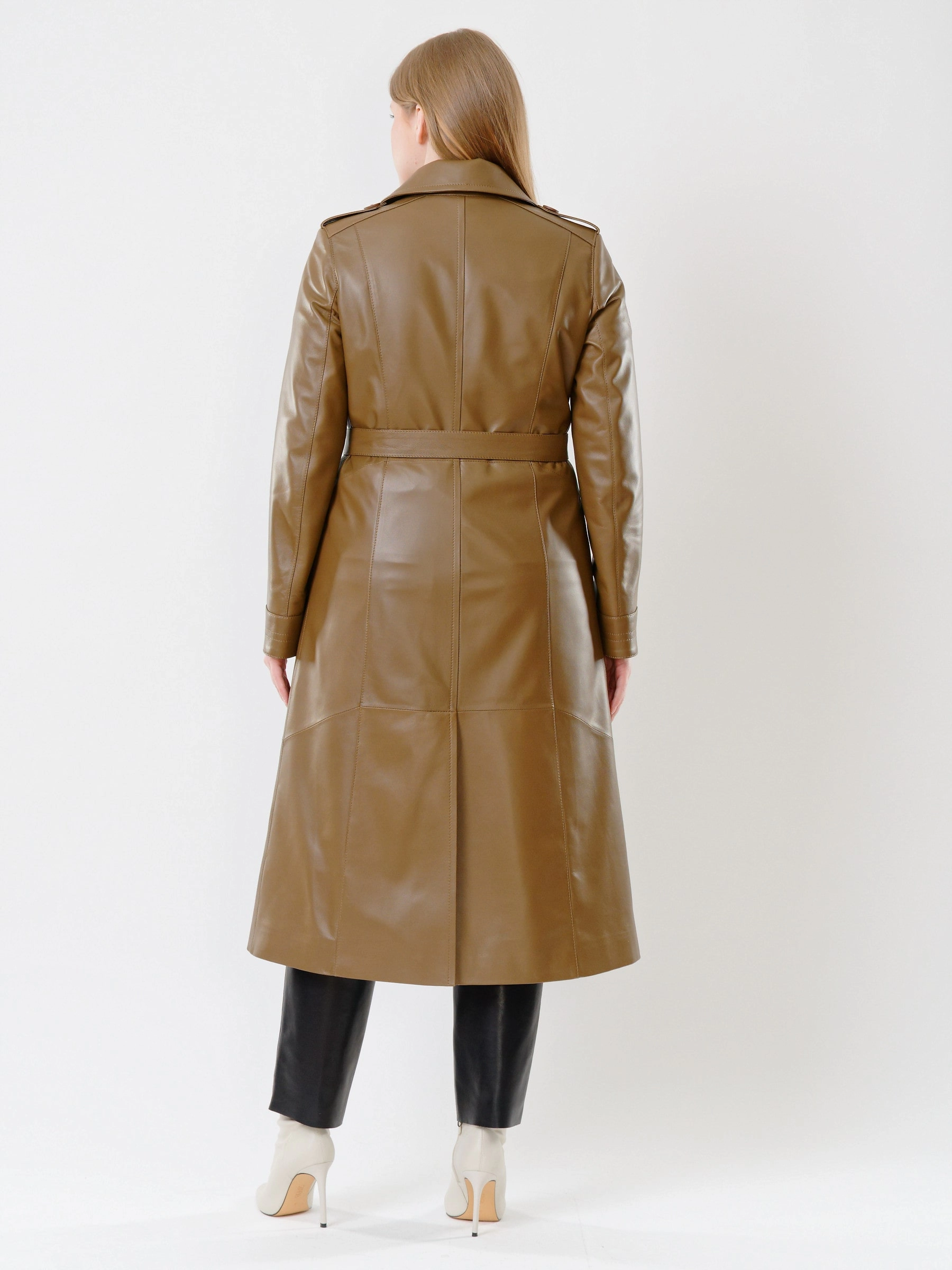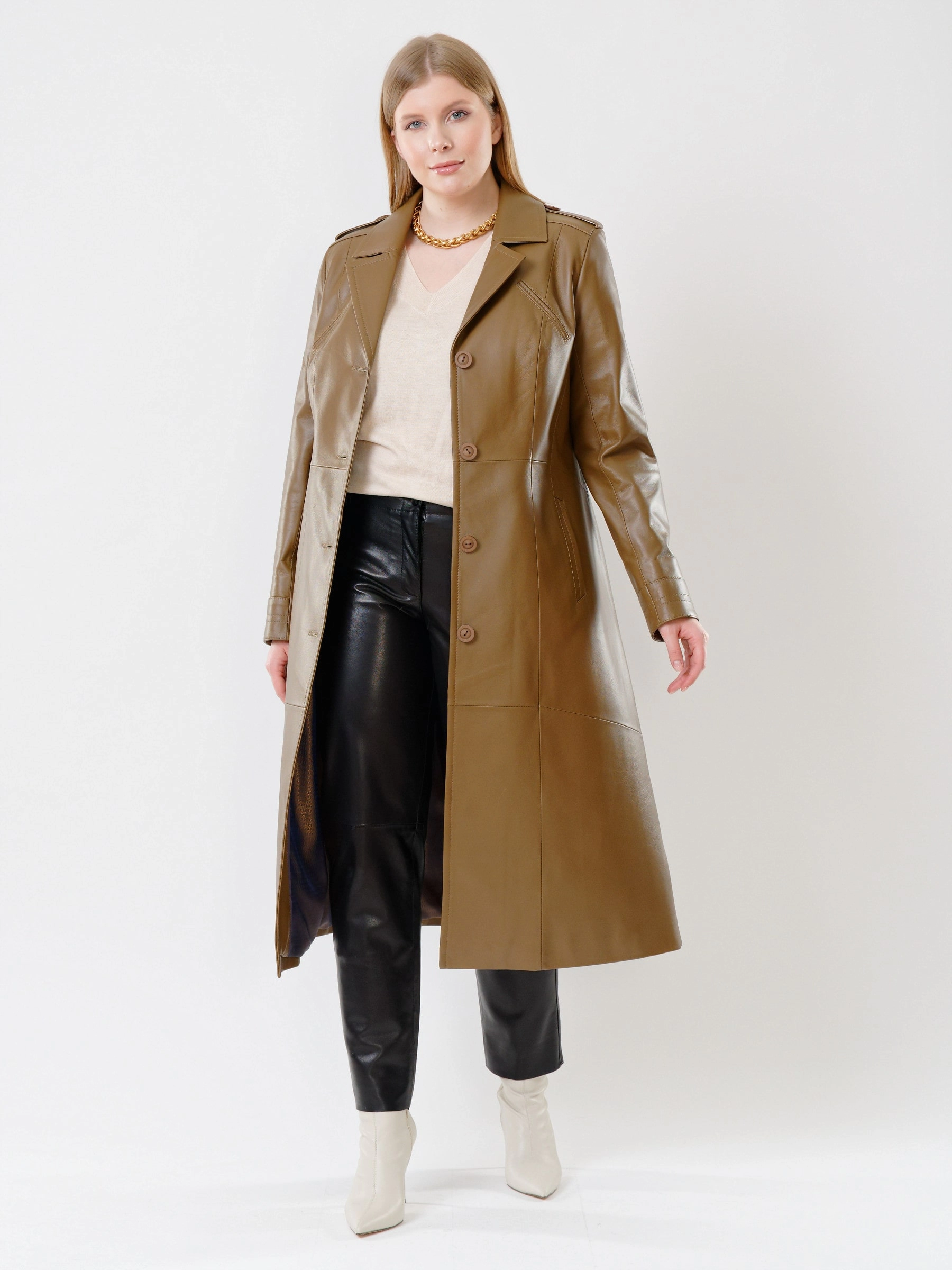 Длинный плащ из натуральной кожи на пуговицах в уставном стиле милитари: полуприлегающий силуэт длиной 116 см с английским воротником, втачными рукавами, погонами и регулируемым поясом подчеркивает строгий силуэт. Функциональные детали — глубокие боковые карманы и задняя шлица — отсылают к военному крою, а премиальная кожа придает образу статусность. Стилист советует: носите с водолазкой, прямыми брюками и армейскими ботинками или с тонким свитером, юбкой-карандаш и грубыми берцами для контраста.