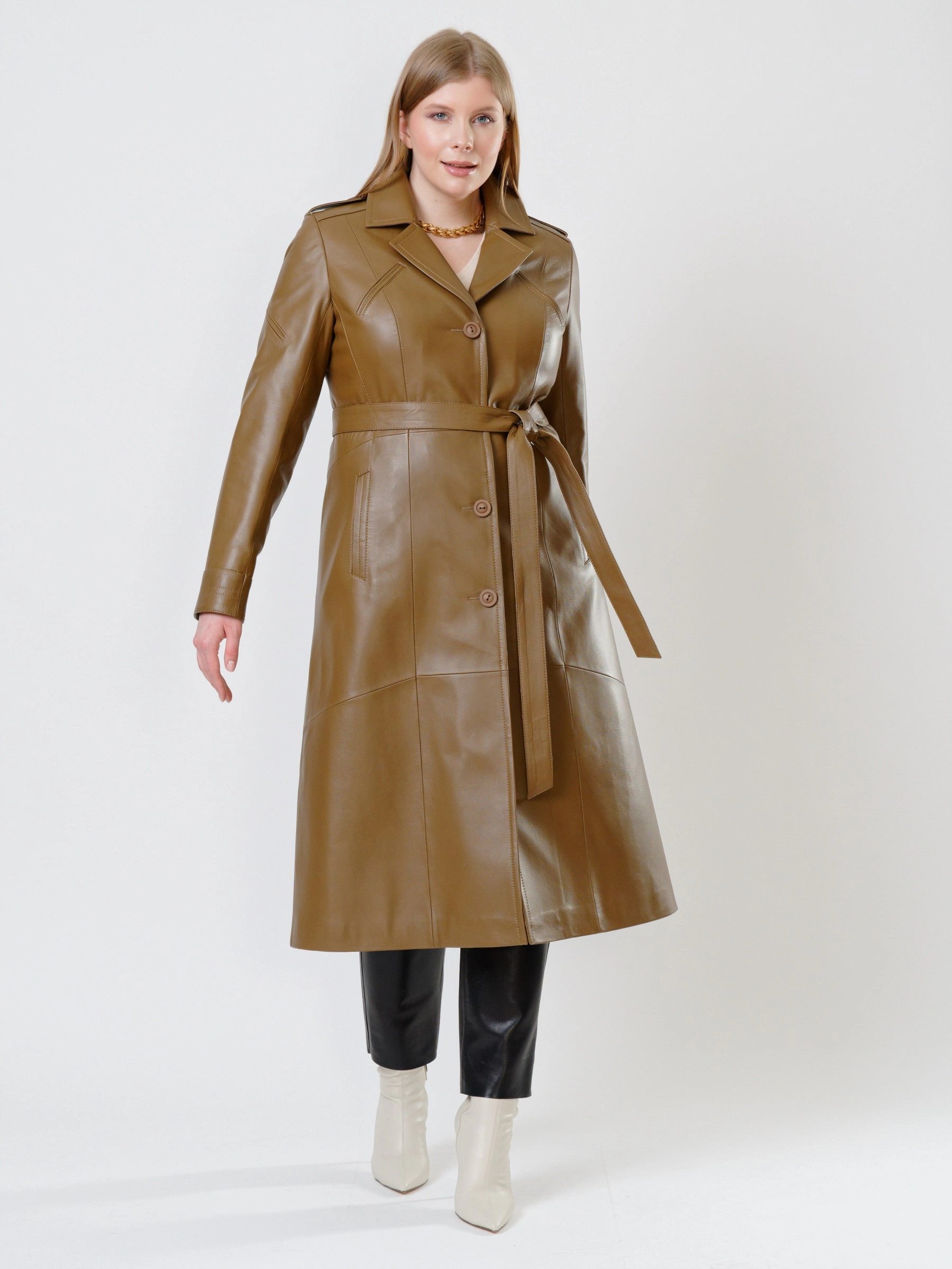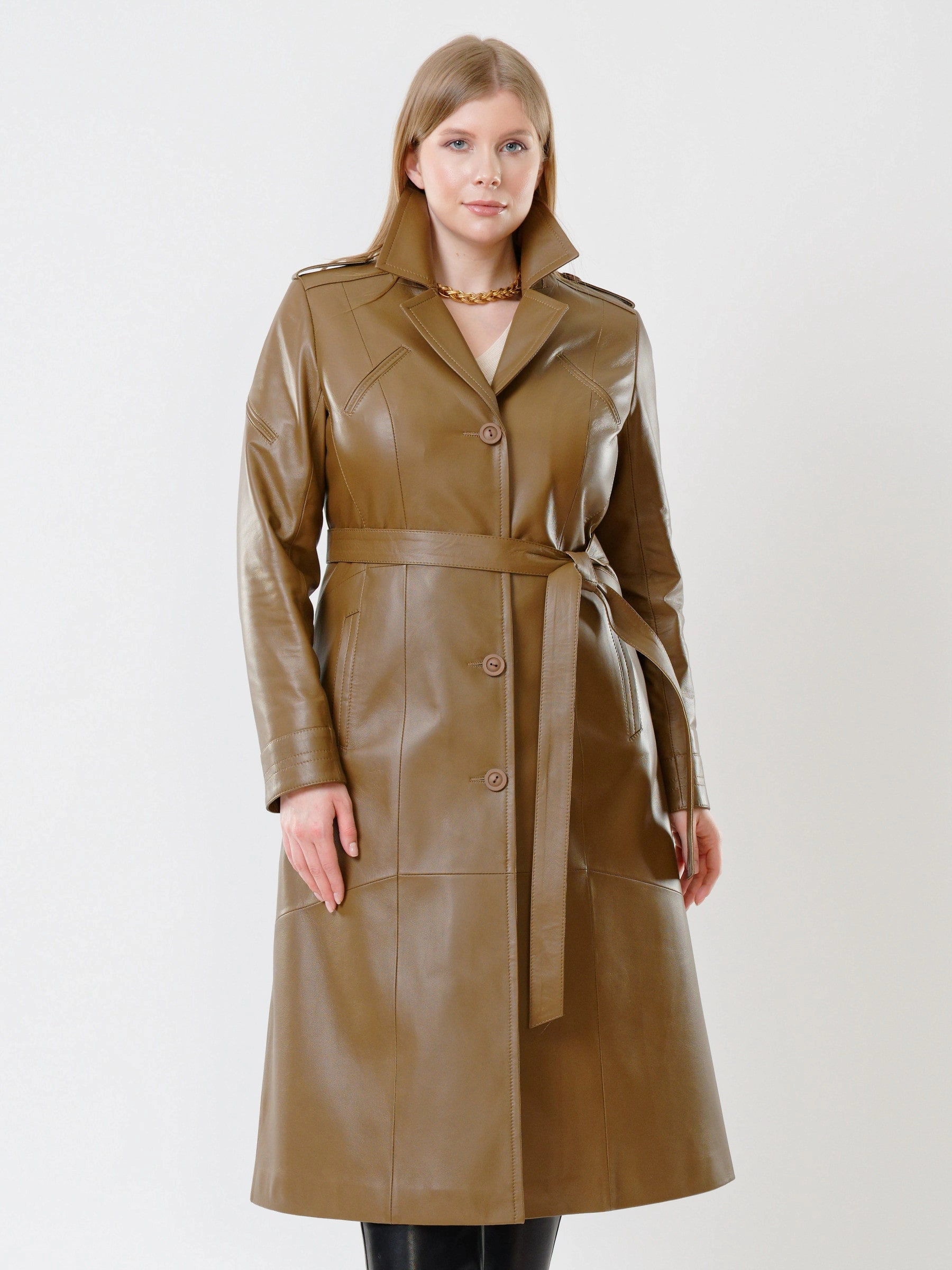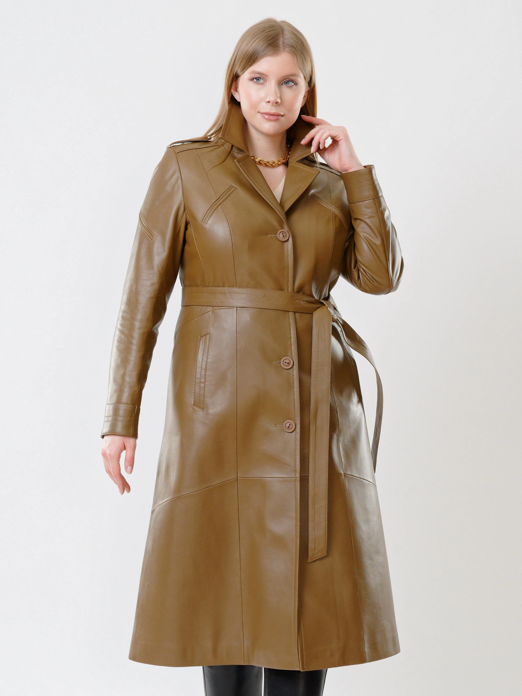 Товар классический кожаный женский плащ с поясом 3010, серо-коричневый, размер 48, артикул 91470 выполнен из натуральной кожи с застежкой пуговицы. Рассчитан на сезон: демисезон. Длина изделия 116 см, силуэт полуприлегающий.