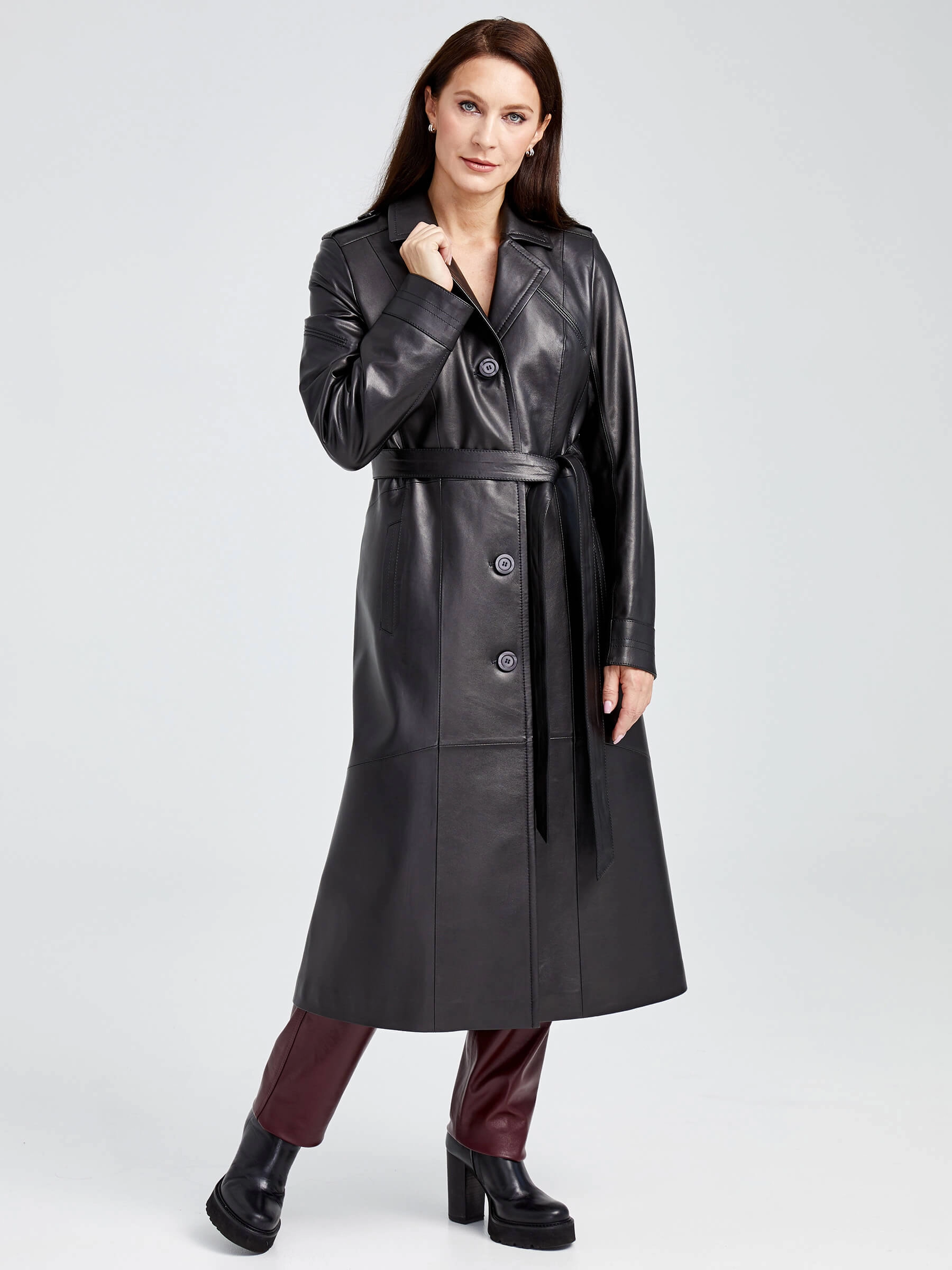 Товар классический кожаный женский плащ с поясом 3010, черный, размер 46, артикул 91641 выполнен из натуральной кожи с застежкой пуговицы. Рассчитан на сезон: демисезон. Длина изделия 116 см, силуэт полуприлегающий.