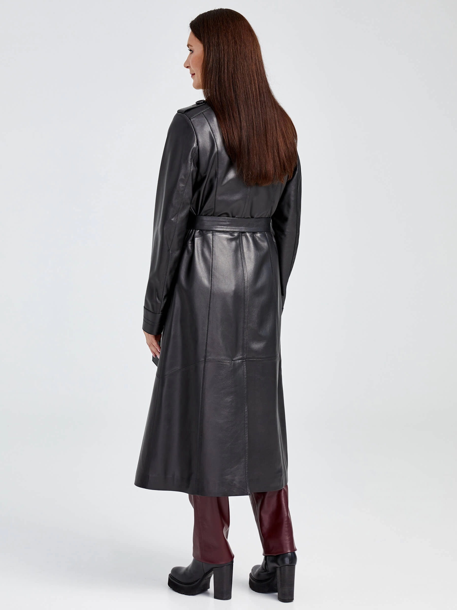 Длинный плащ из натуральной кожи на пуговицах в уставном стиле милитари: полуприлегающий силуэт длиной 116 см с английским воротником, втачными рукавами, погонами и регулируемым поясом подчеркивает строгий силуэт. Функциональные детали — глубокие боковые карманы и задняя шлица — отсылают к военному крою, а премиальная кожа придает образу статусность. Стилист советует: носите с водолазкой, прямыми брюками и армейскими ботинками или с тонким свитером, юбкой-карандаш и грубыми берцами для контраста.