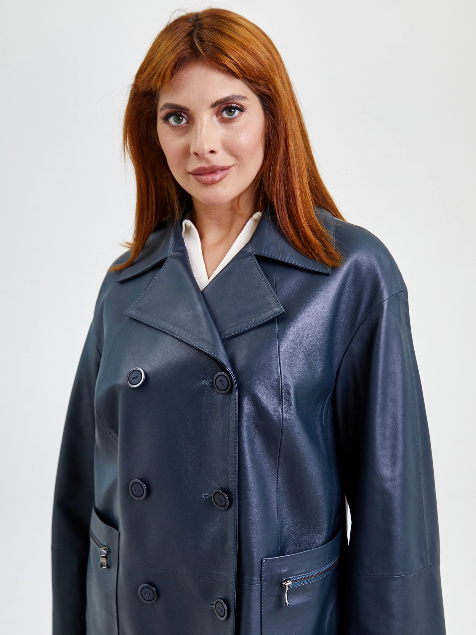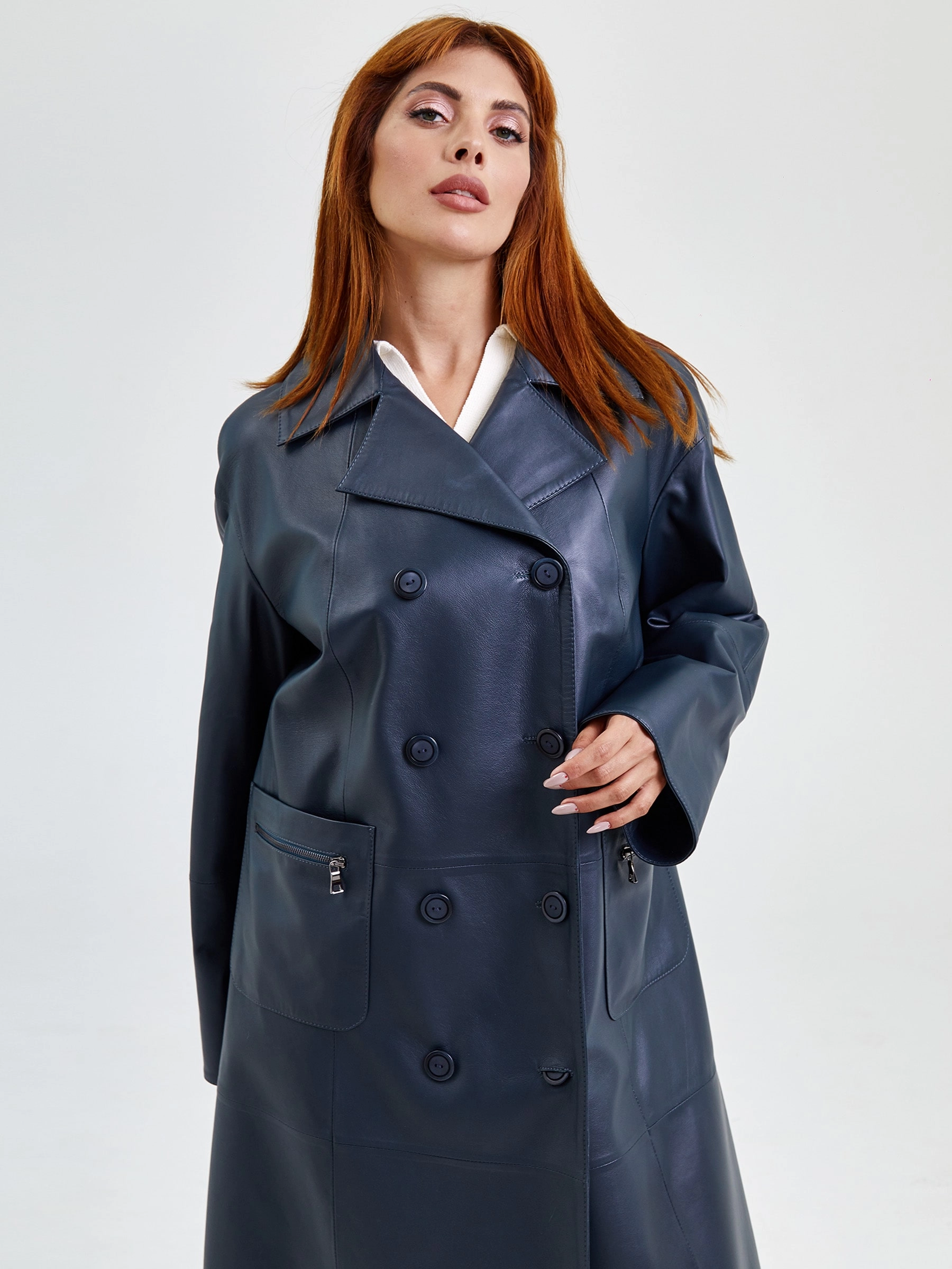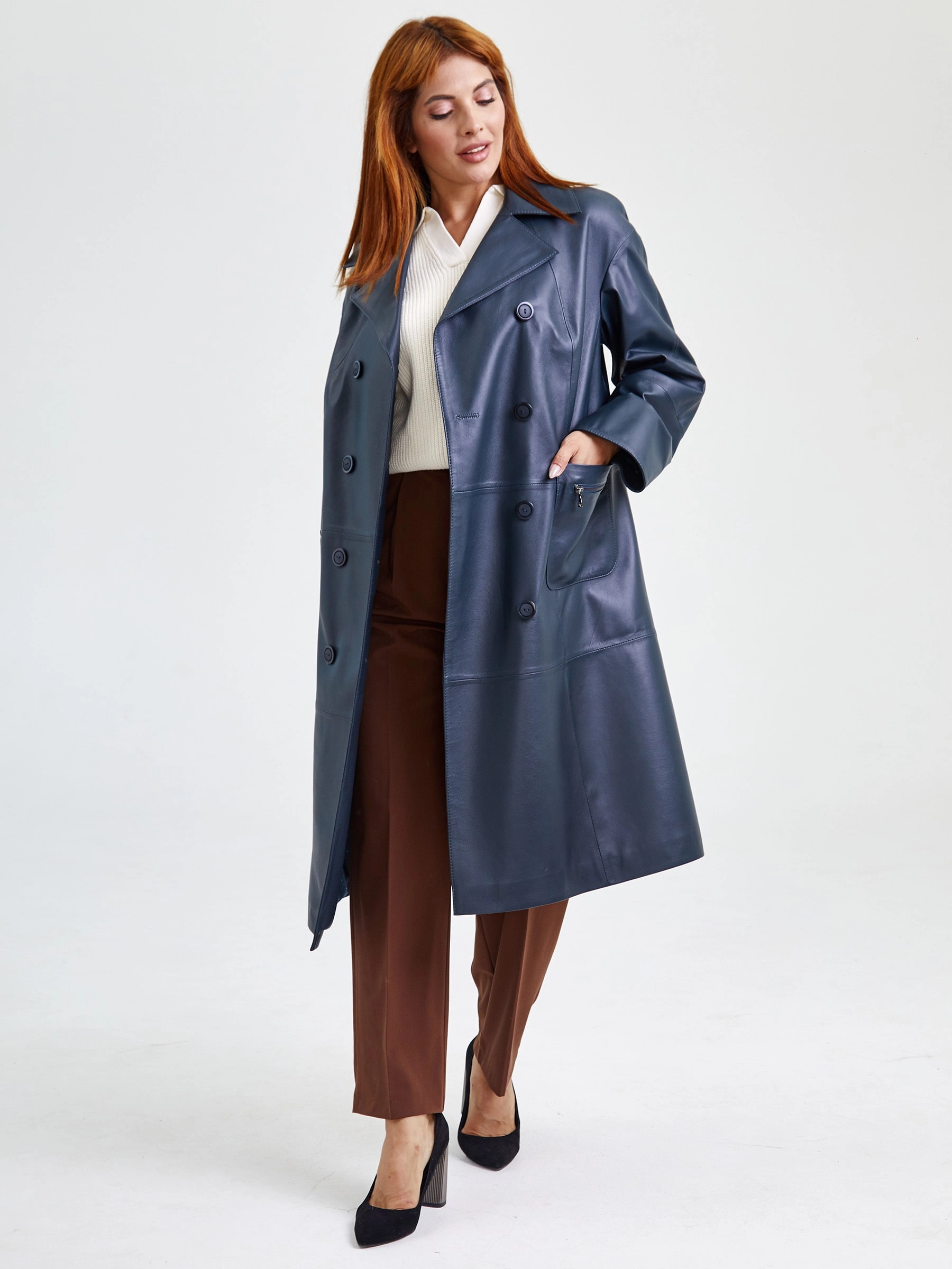 Кожаный двубортный плащ женский премиум класса 3012, синий, размер 56, артикул 91771