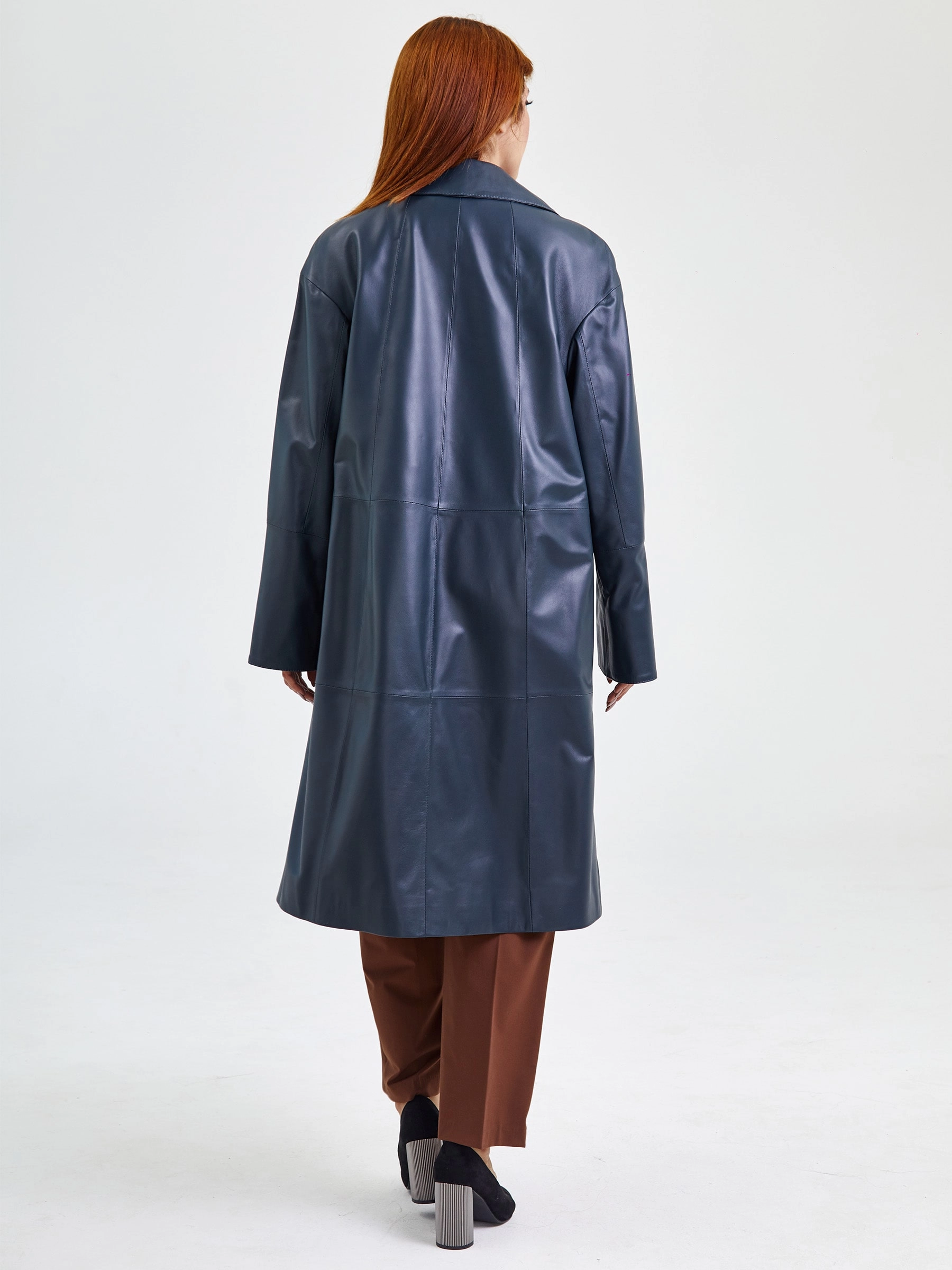 Товар кожаный двубортный плащ женский премиум класса 3012, синий, размер 56, артикул 91771 выполнен из натуральной кожи с застежкой пуговицы. Рассчитан на сезон: весна-лето. Длина изделия 110 см, силуэт свободный.