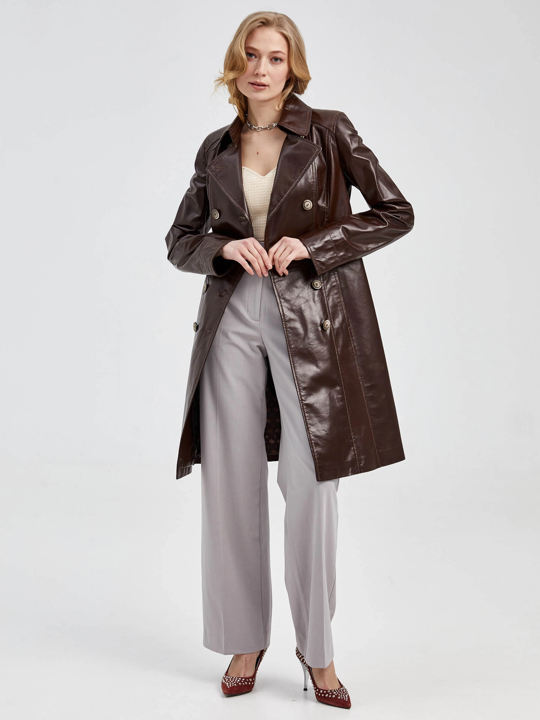 Облегающий силуэт, роскошная натуральная кожа и эффектный двубортный крой — этот женский плащ длиной 92 см станет фаворитом сезона. Классический английский воротник, втачные рукава и застежка на пуговицы подчеркивают элегантность, а широкий пояс с прямоугольной пряжкой идеально выделит талию. Черный цвет, прорезные карманы и безупречное качество кожи гарантируют универсальность и шик в любом луке — наденьте с объемным джемпером, джинсами и сапогами для уверенной элегантности на десятилетия.