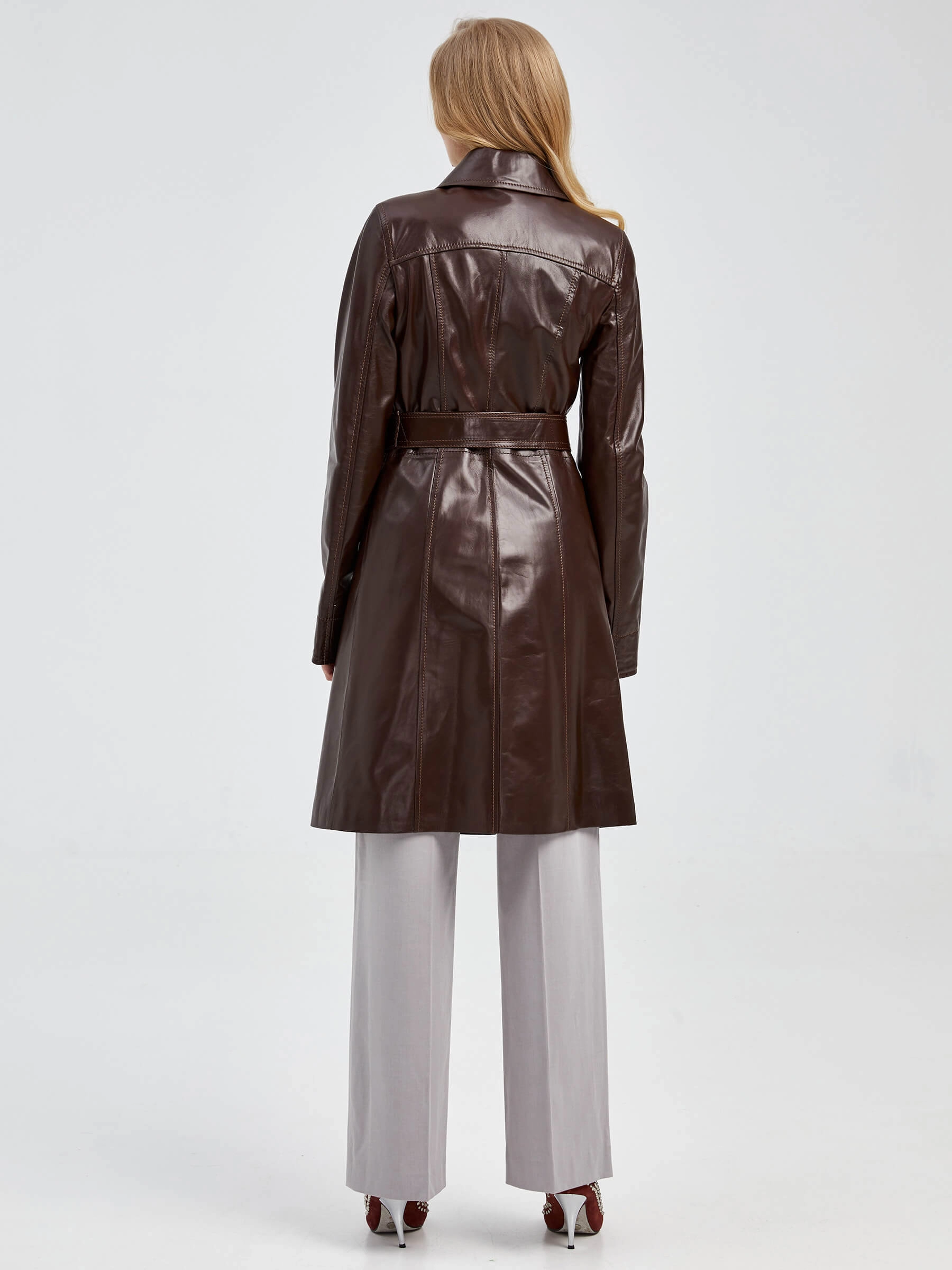 Товар двубортный кожаный женский френч с поясом 321, коричневый, размер 40, артикул 91660 выполнен из натуральной кожи с застежкой пуговицы. Рассчитан на сезон: весна-лето. Длина изделия 92 см, силуэт приталенный .
