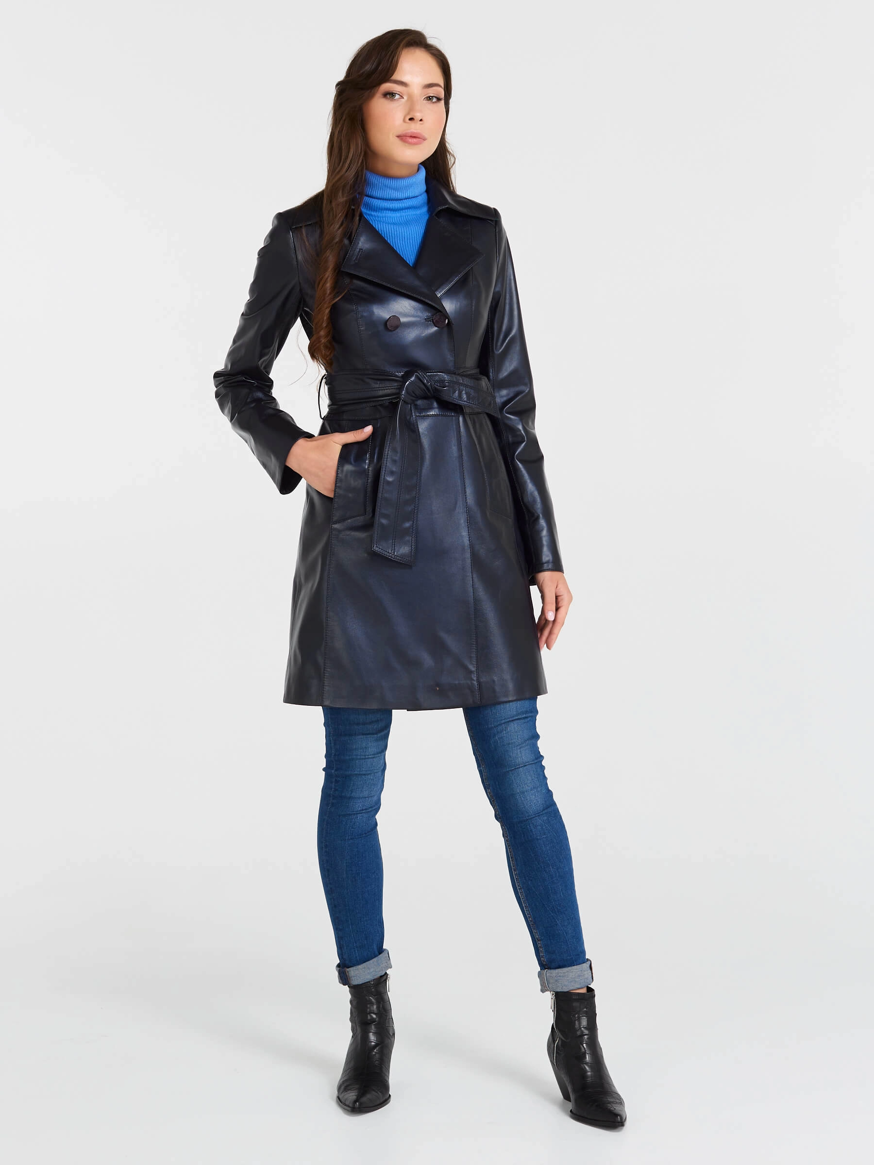 Двубортный плащ из натуральной кожи цвета «синий перламутр» на пуговицах: приталенный силуэт с английским воротником, втачными рукавами с регулируемыми манжетами-отворотами, врезными карманами и широким поясом обеспечивает идеальную посадку. Изготовлен из кожи премиум-класса с мягкой выделкой. Сочетайте с водолазкой и джинсами или с платьем-миди и ботильонами.