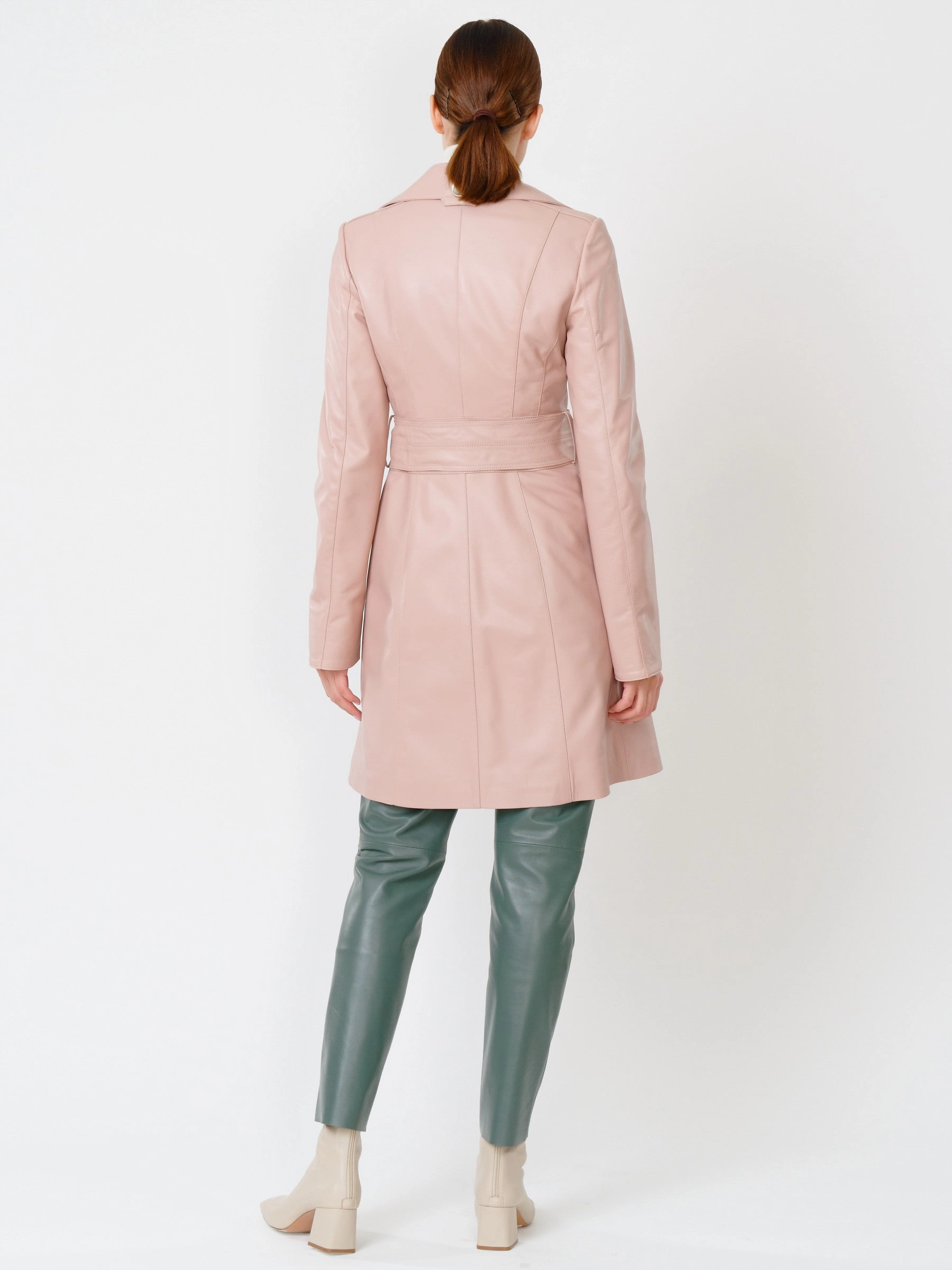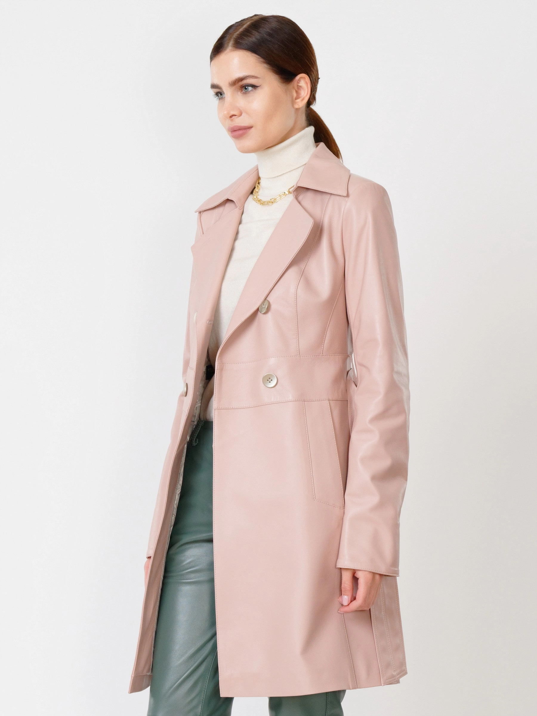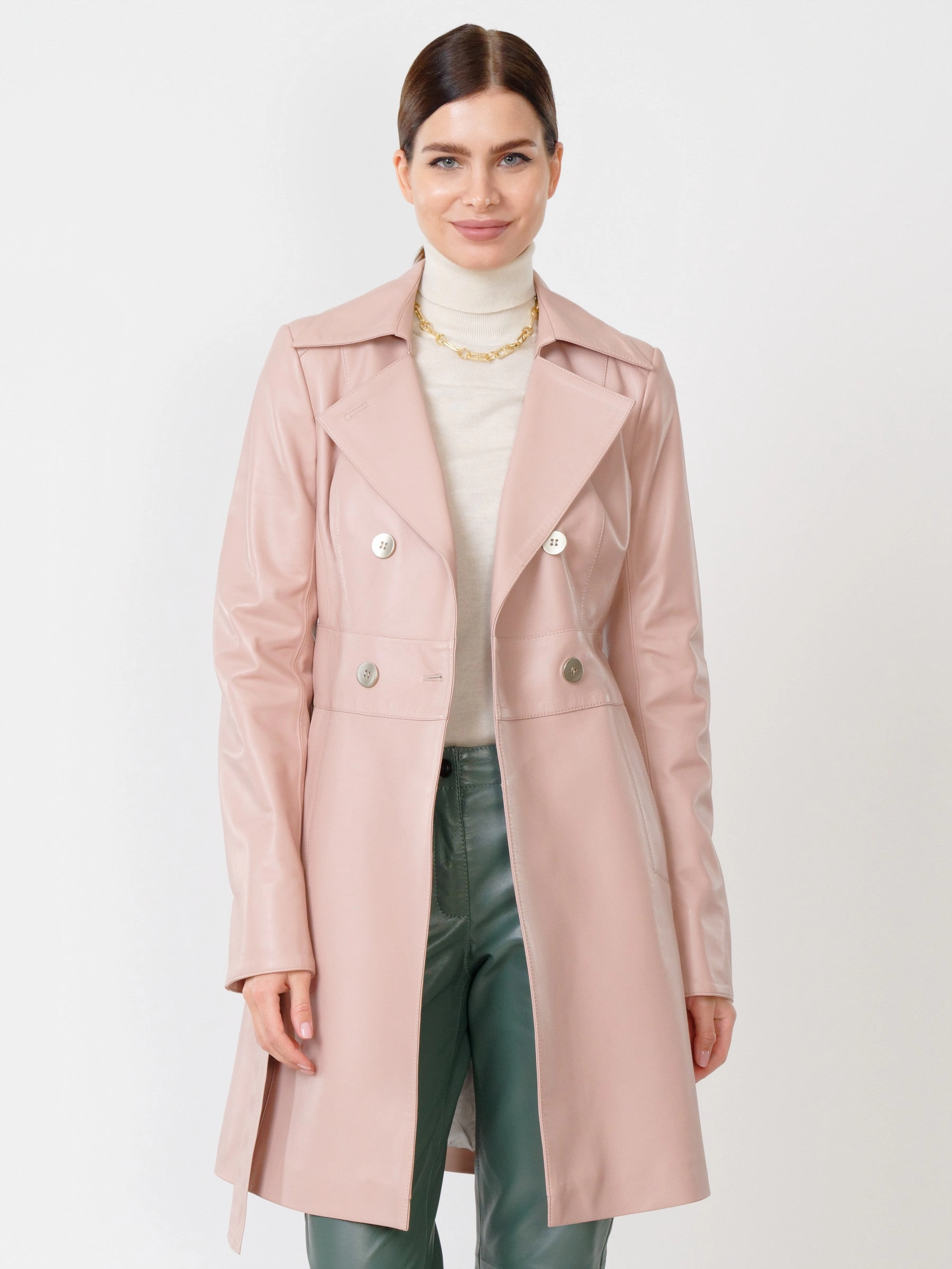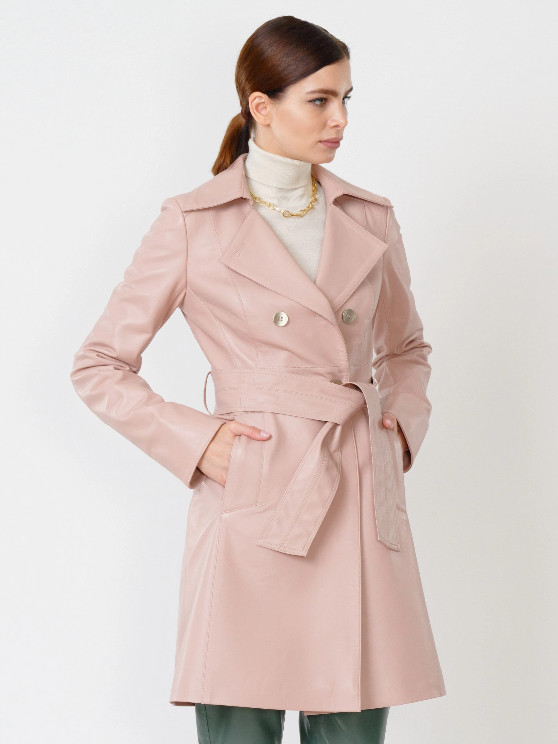 Кожаный двубортный женский плащ с поясом 338, пудровый, размер 44, артикул 90971