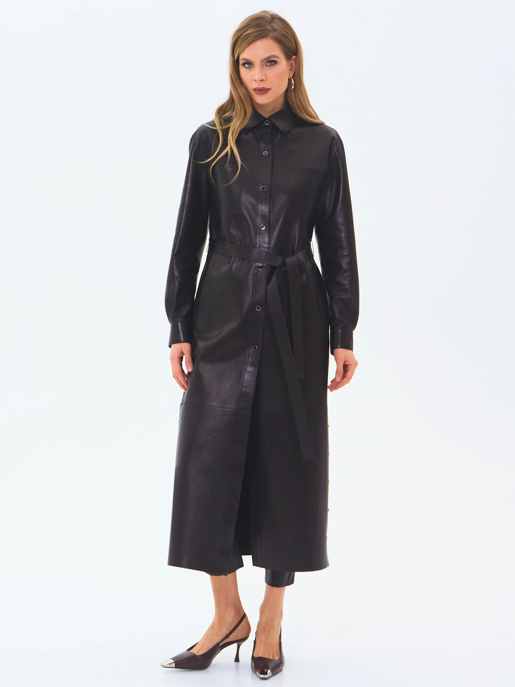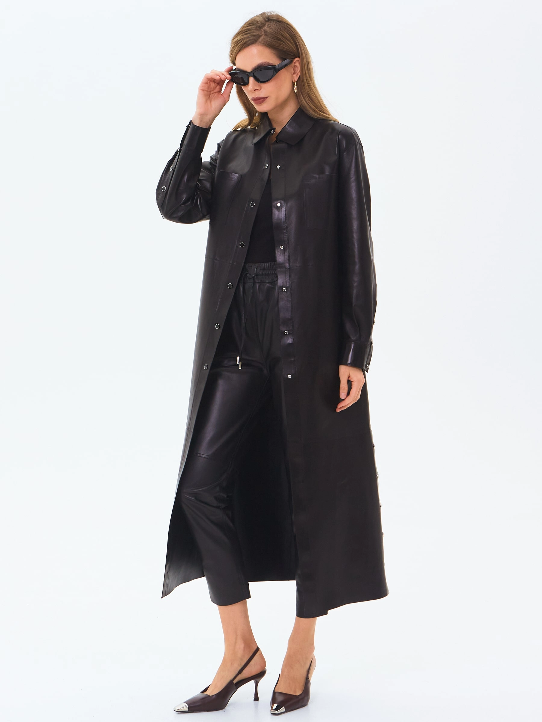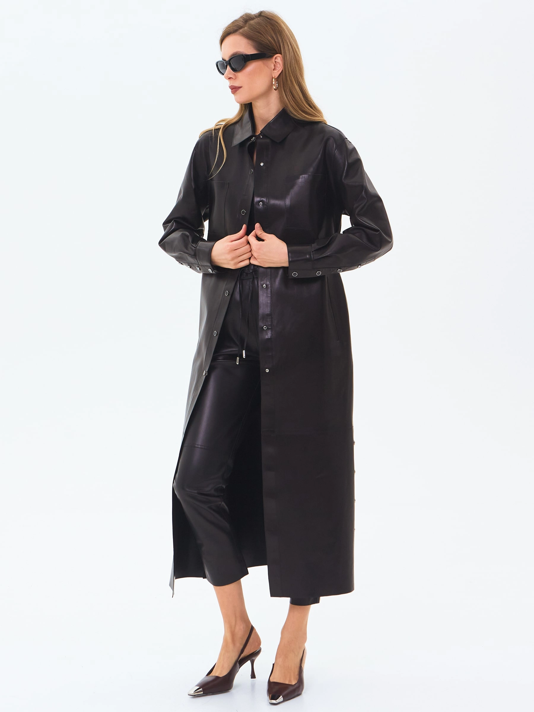 Длинный плащ с отложным воротникои и широкими манжетами выполнили из тонкой мягкой кожи черного цвета премиум класса. Комфортный прямой крой, врезные карманы. Сама модель, как и высокие боковые разрезы застегиваются кнопками.Посадку по талии можно регулировать поясом.
