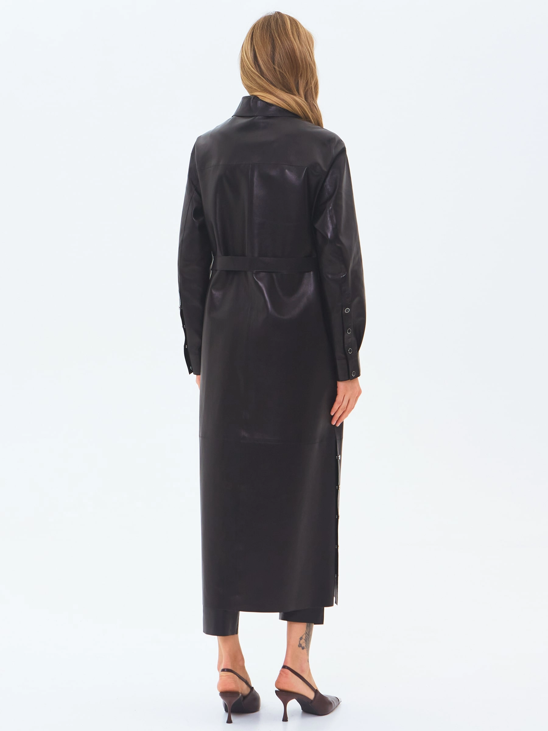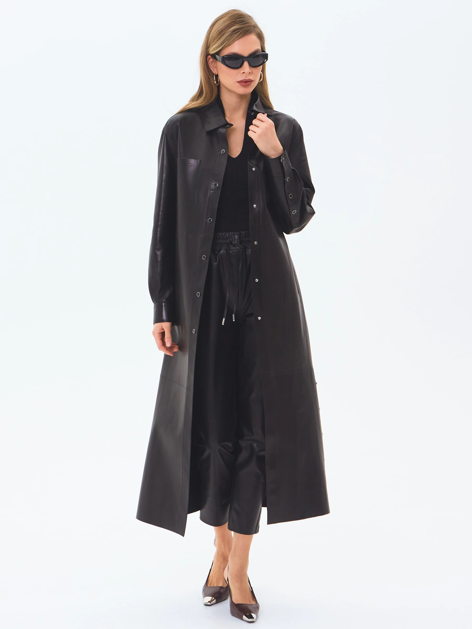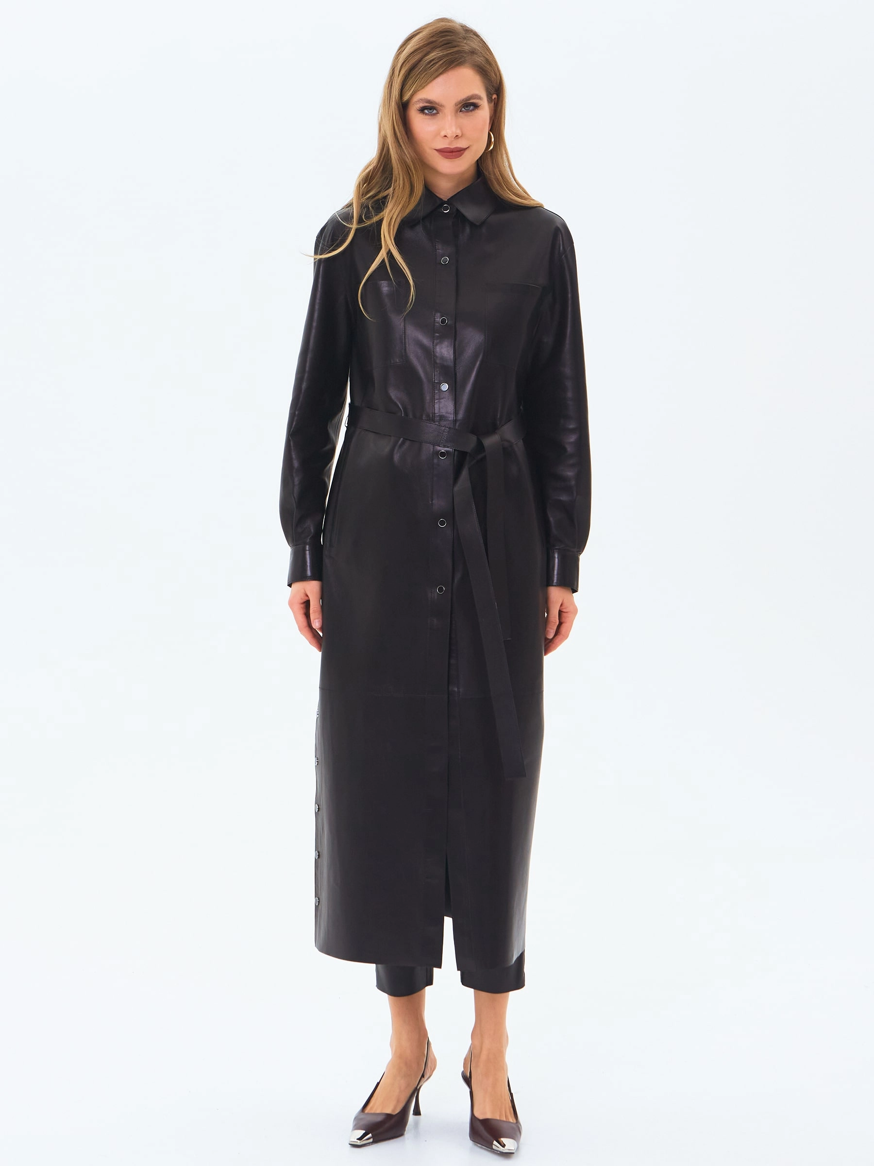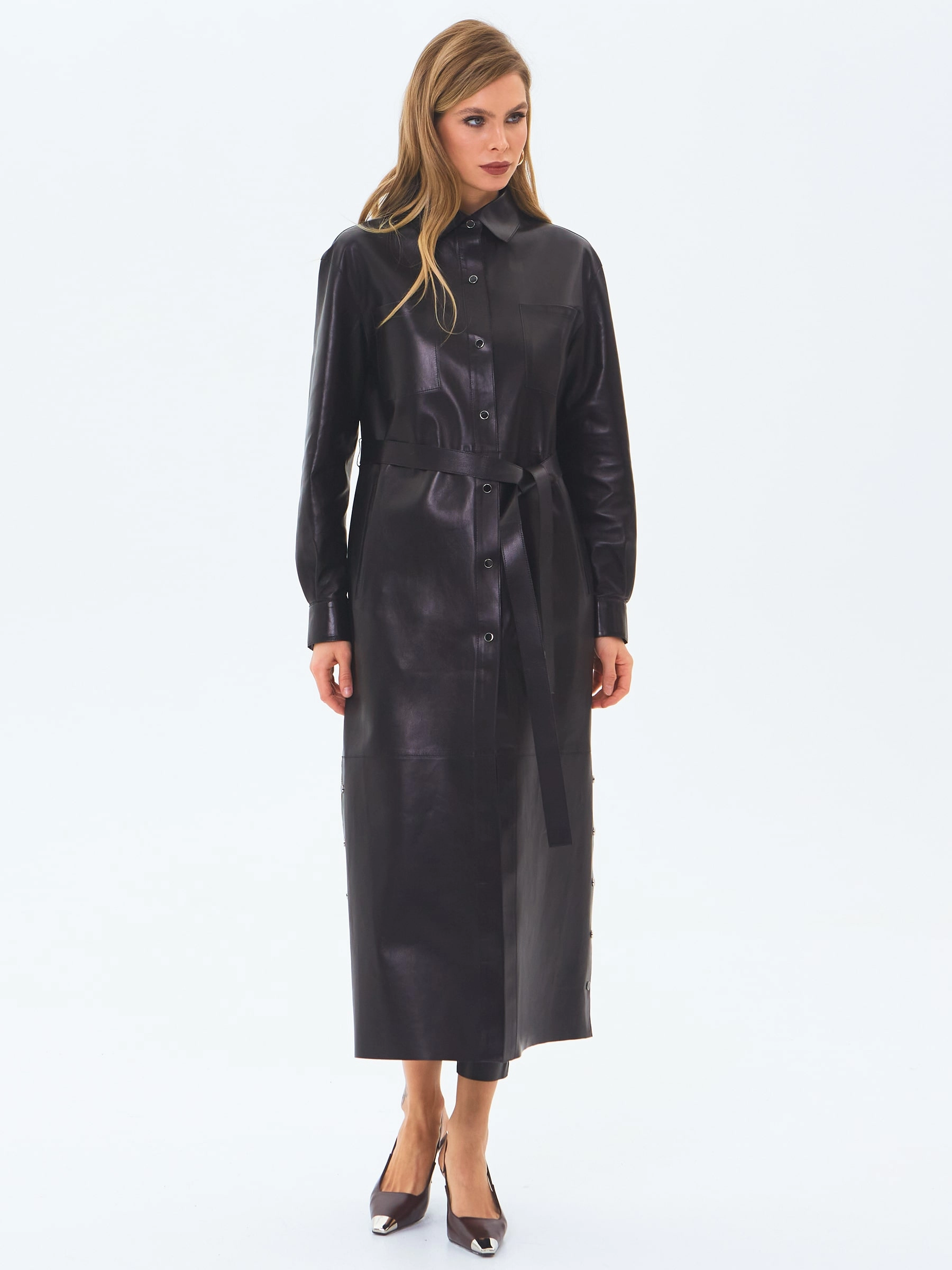 Длинный плащ с отложным воротникои и широкими манжетами выполнили из тонкой мягкой кожи черного цвета премиум класса. Комфортный прямой крой, врезные карманы. Сама модель, как и высокие боковые разрезы застегиваются кнопками.Посадку по талии можно регулировать поясом.