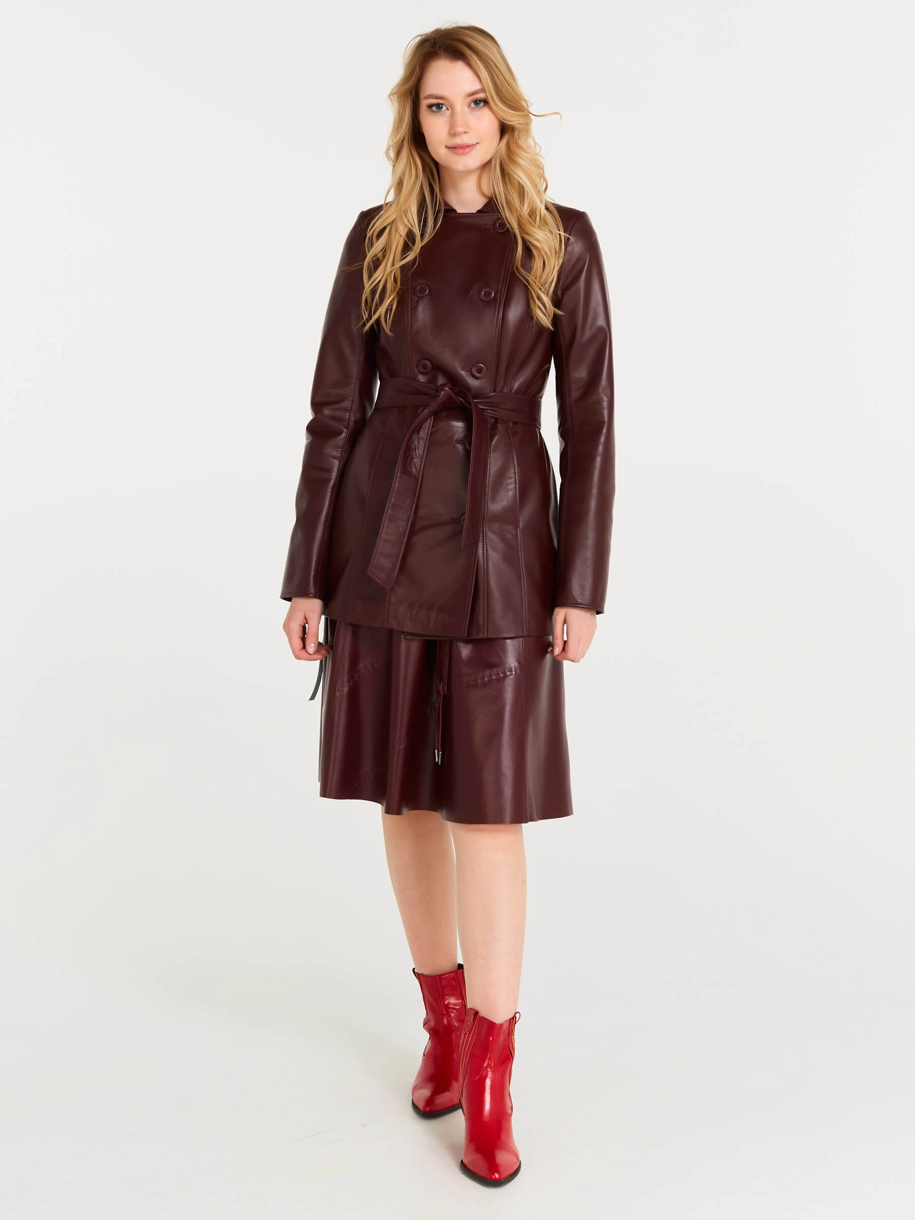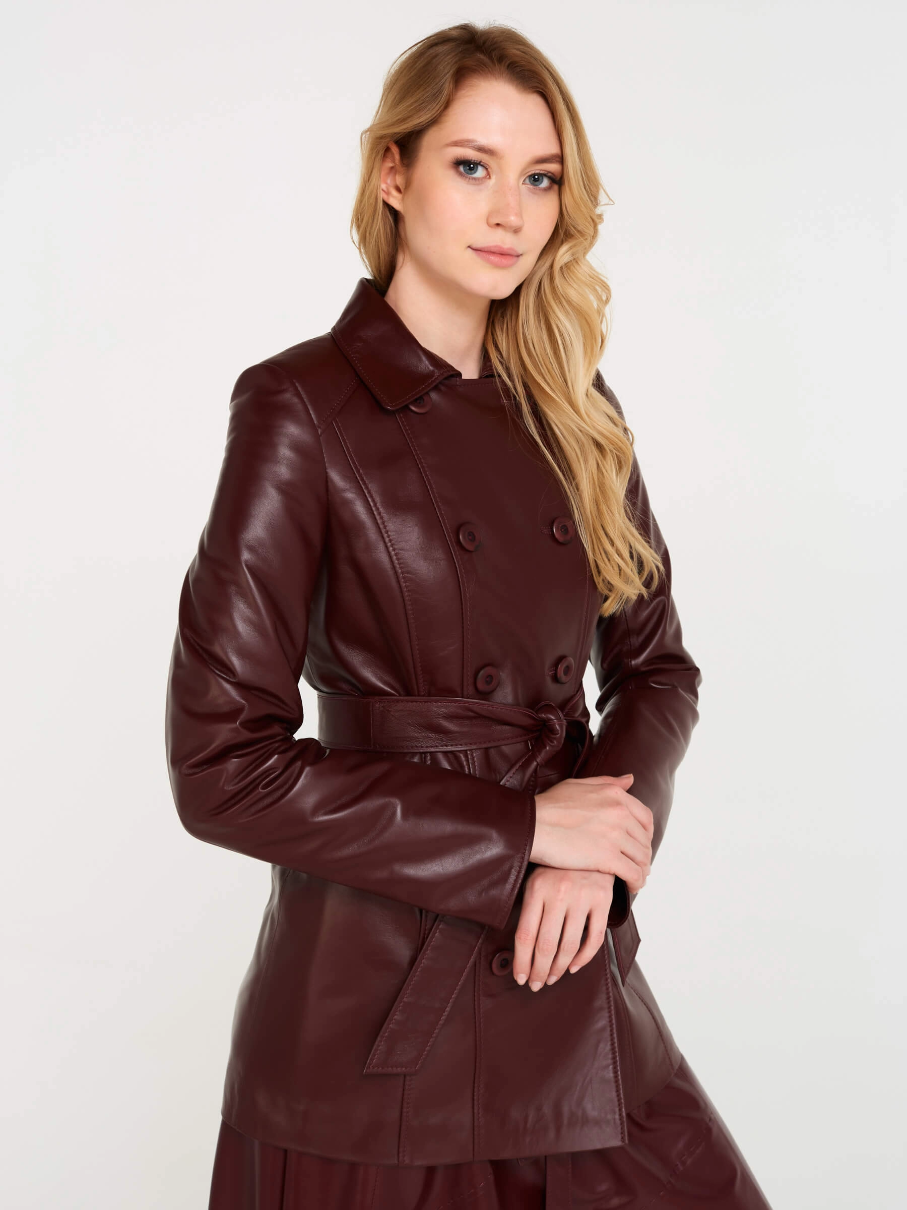 Удлиненная женская куртка из роскошной кожи «Primo Vello» в глубоком бордовом цвете: двубортный крой на пуговицах, английский воротник с широкими лацканами и приталенный силуэт создают безупречную элегантность. Широкий кожаный пояс подчеркивает талию, а втачной рукав и современный утеплитель на основе натуральной шерсти гарантируют тепло и комфорт. Практичные боковые карманы и премиальное качество натуральной кожи делают эту утепленную куртку идеальной для повседневной элегантности — носите с черной водолазкой, кожаными брюками и ботильонами для уверенного образа с винтажным шармом.