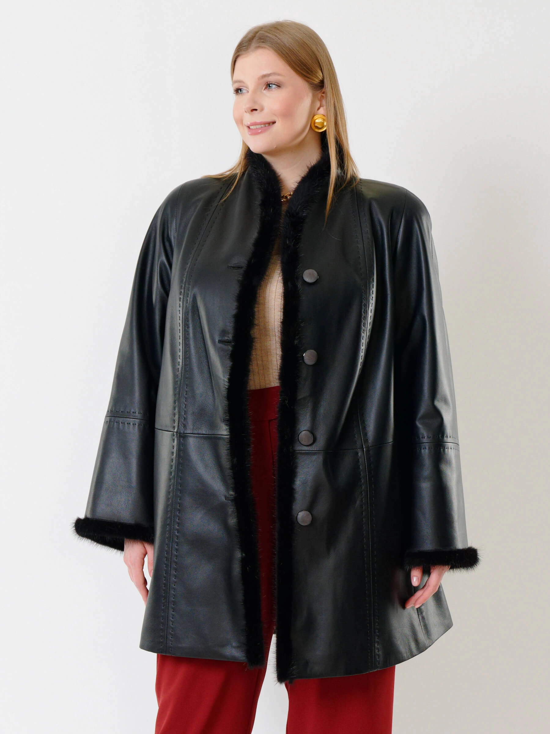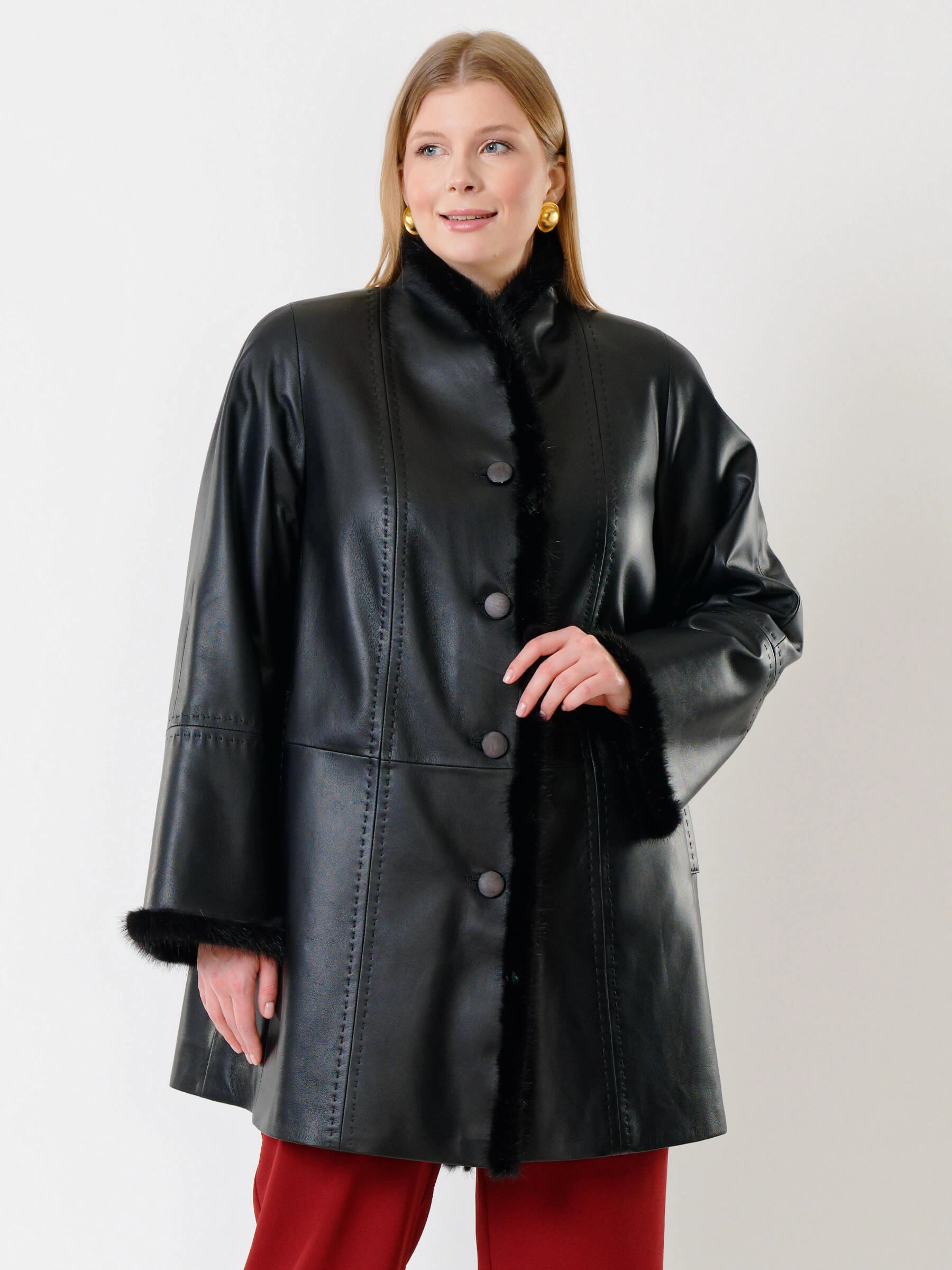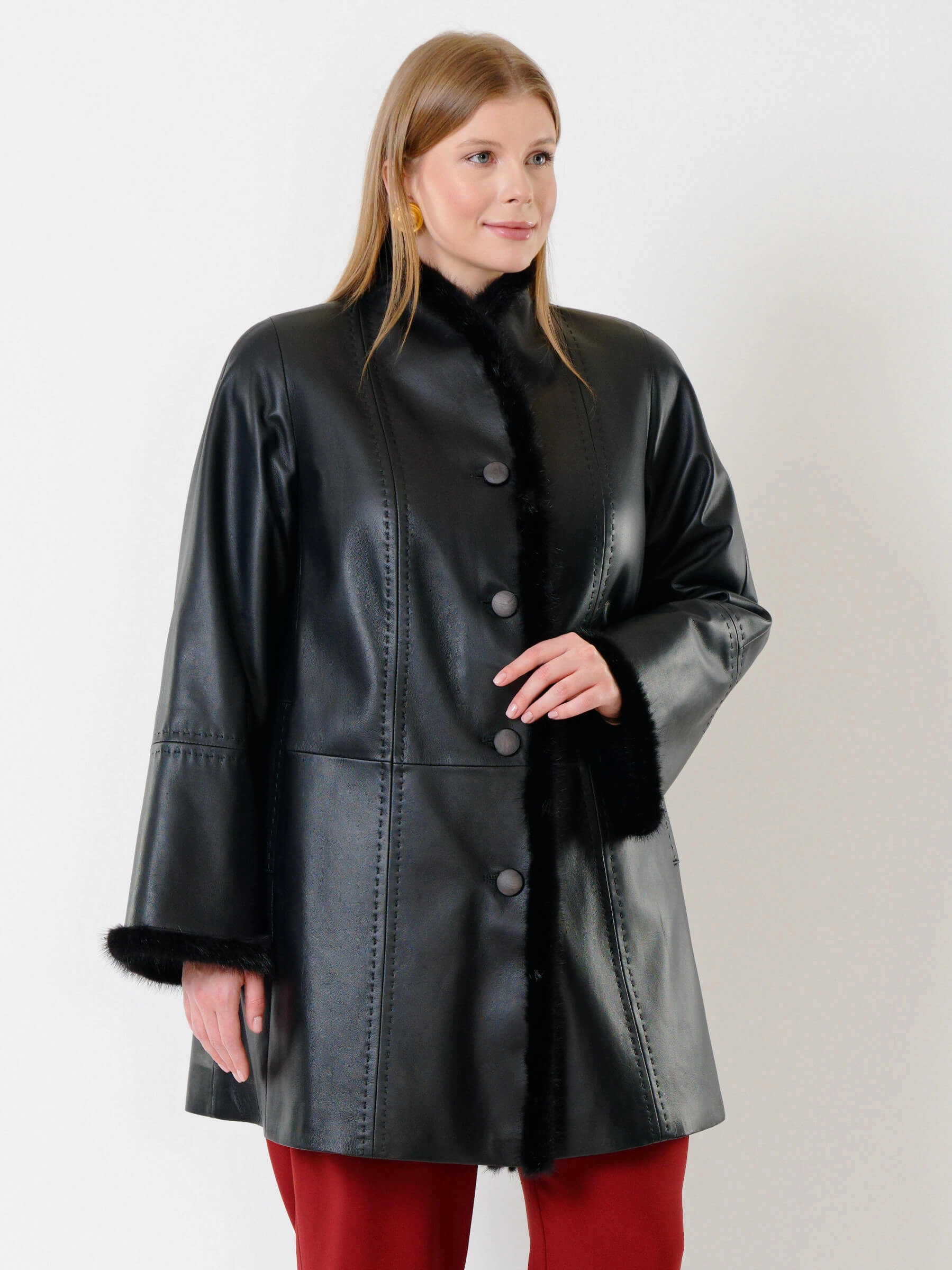 Утепленный плащ из натуральной кожи премиум-класса длиной 85 см на пуговицах с роскошной отделкой воротника, борта и манжет мехом норки. Свободный силуэт трапеция, рукава реглан и шалевый воротник создают классический образ. Утеплен шерстепоном на основе хлопка и овечьей шерсти для комфорта в холода; сочетается со сдержанными джинсами и сапогами или с платьями. Ручная строчка на полочках и рукавах подчеркивает премиальное качество.
