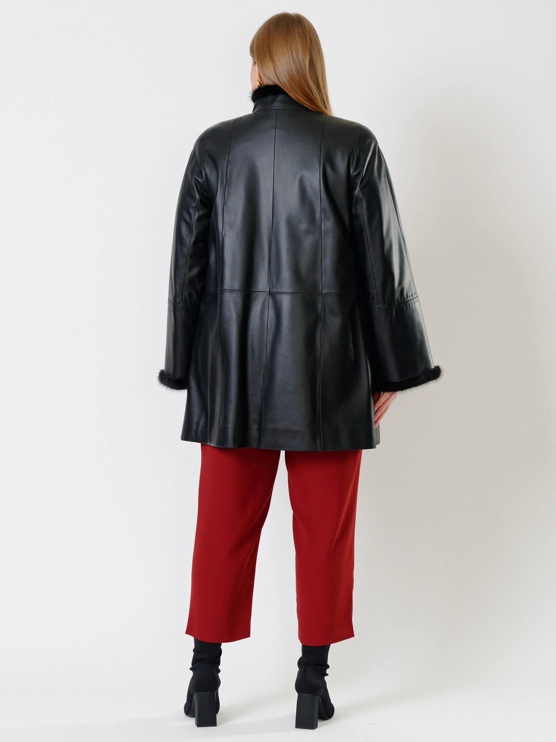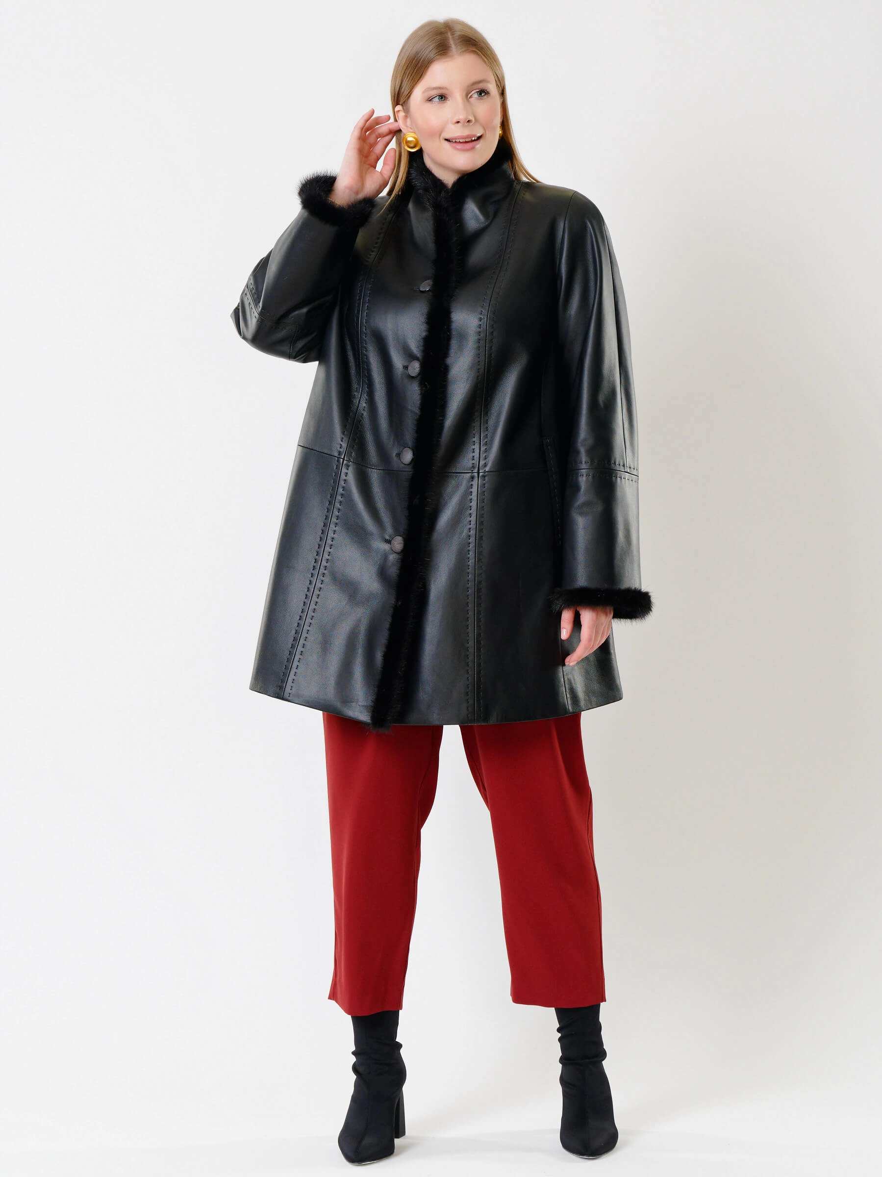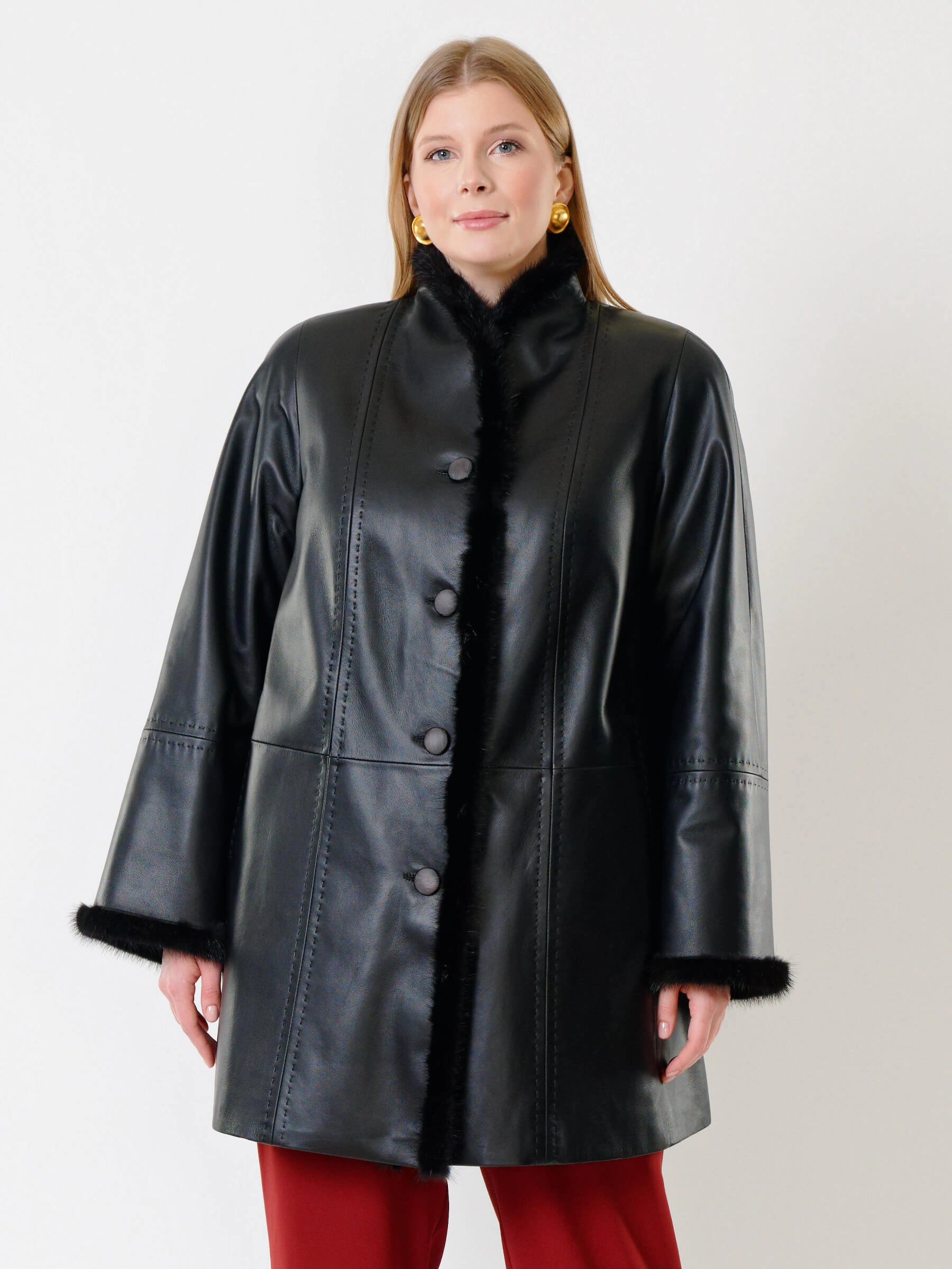 Утепленный плащ из натуральной кожи премиум-класса длиной 85 см на пуговицах с роскошной отделкой воротника, борта и манжет мехом норки. Свободный силуэт трапеция, рукава реглан и шалевый воротник создают классический образ. Утеплен шерстепоном на основе хлопка и овечьей шерсти для комфорта в холода; сочетается со сдержанными джинсами и сапогами или с платьями. Ручная строчка на полочках и рукавах подчеркивает премиальное качество.