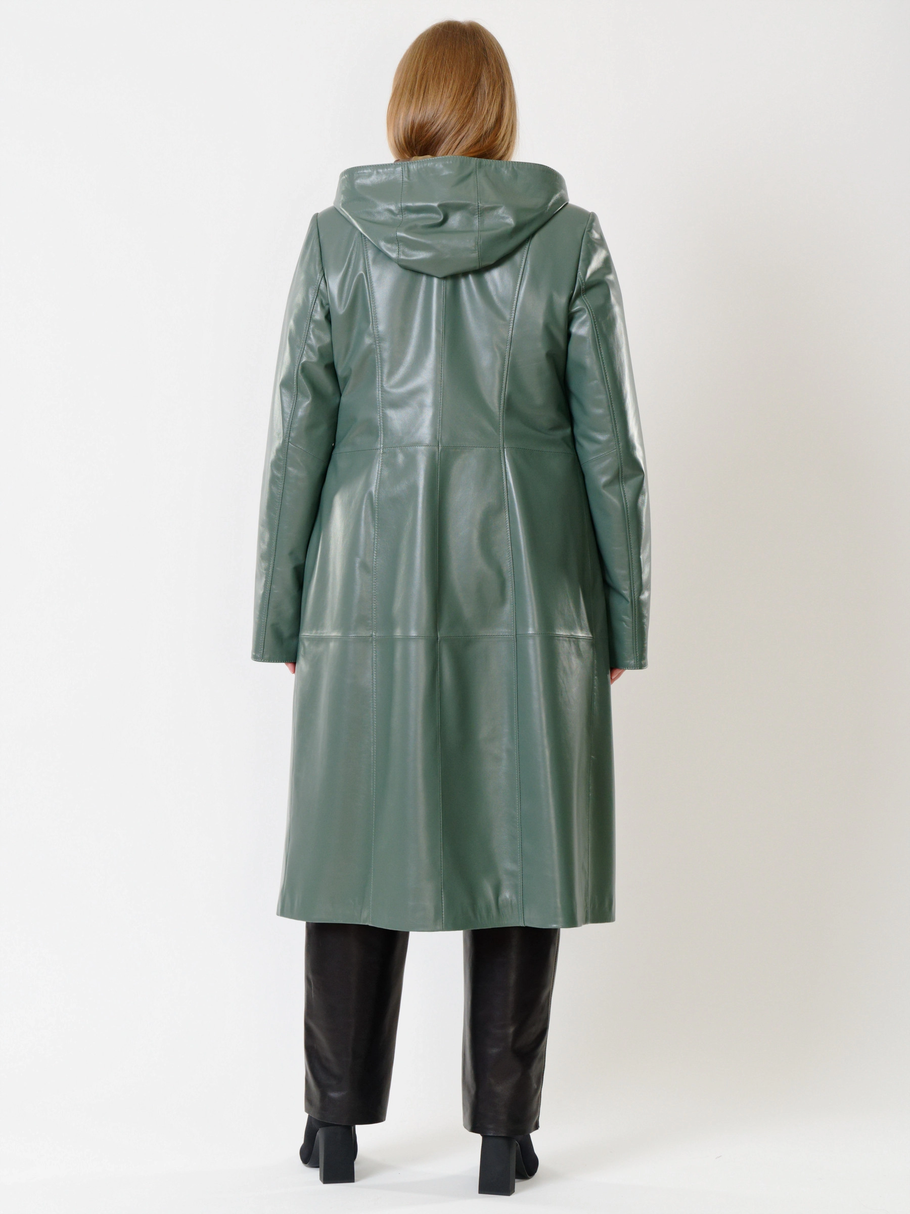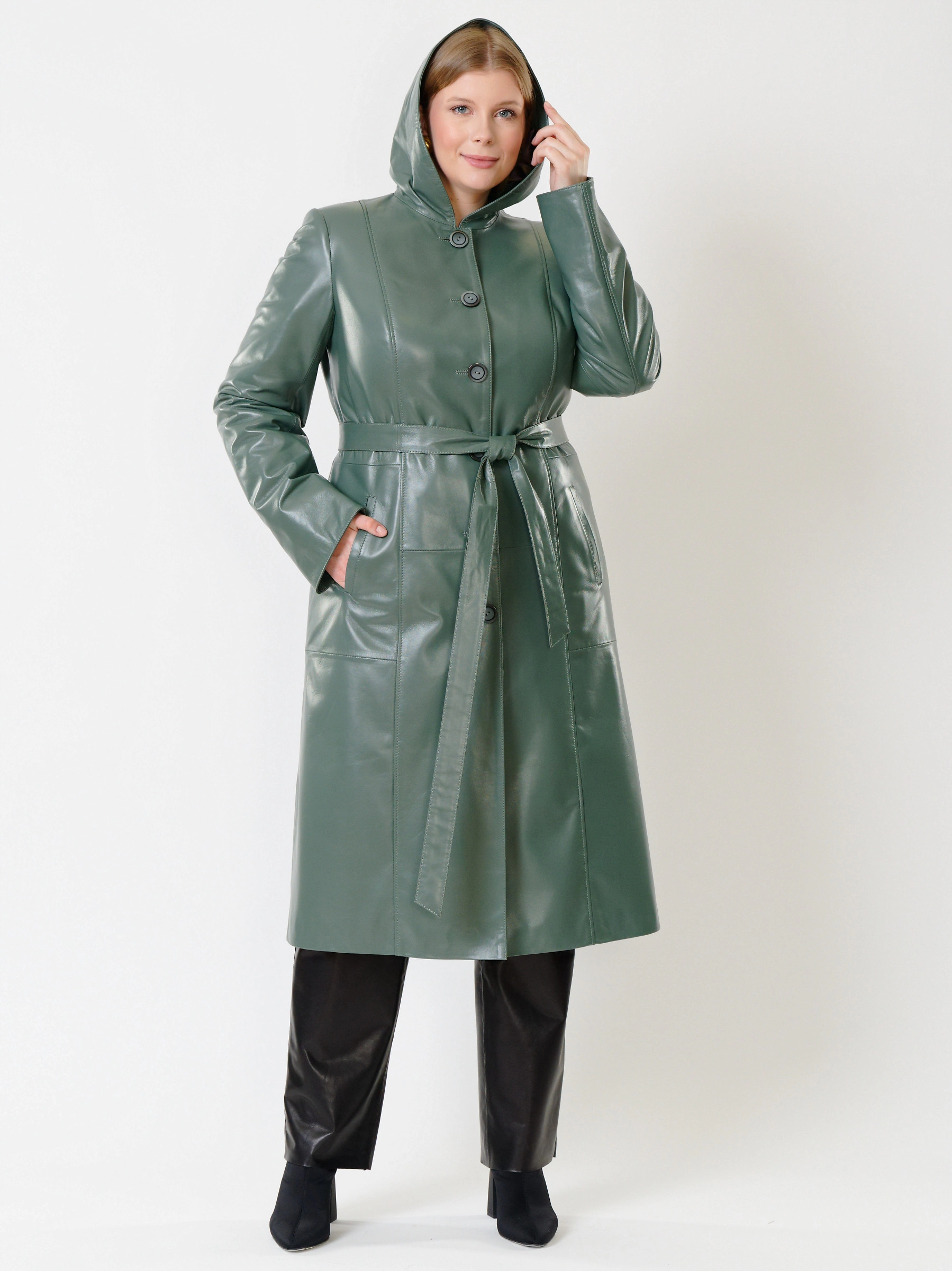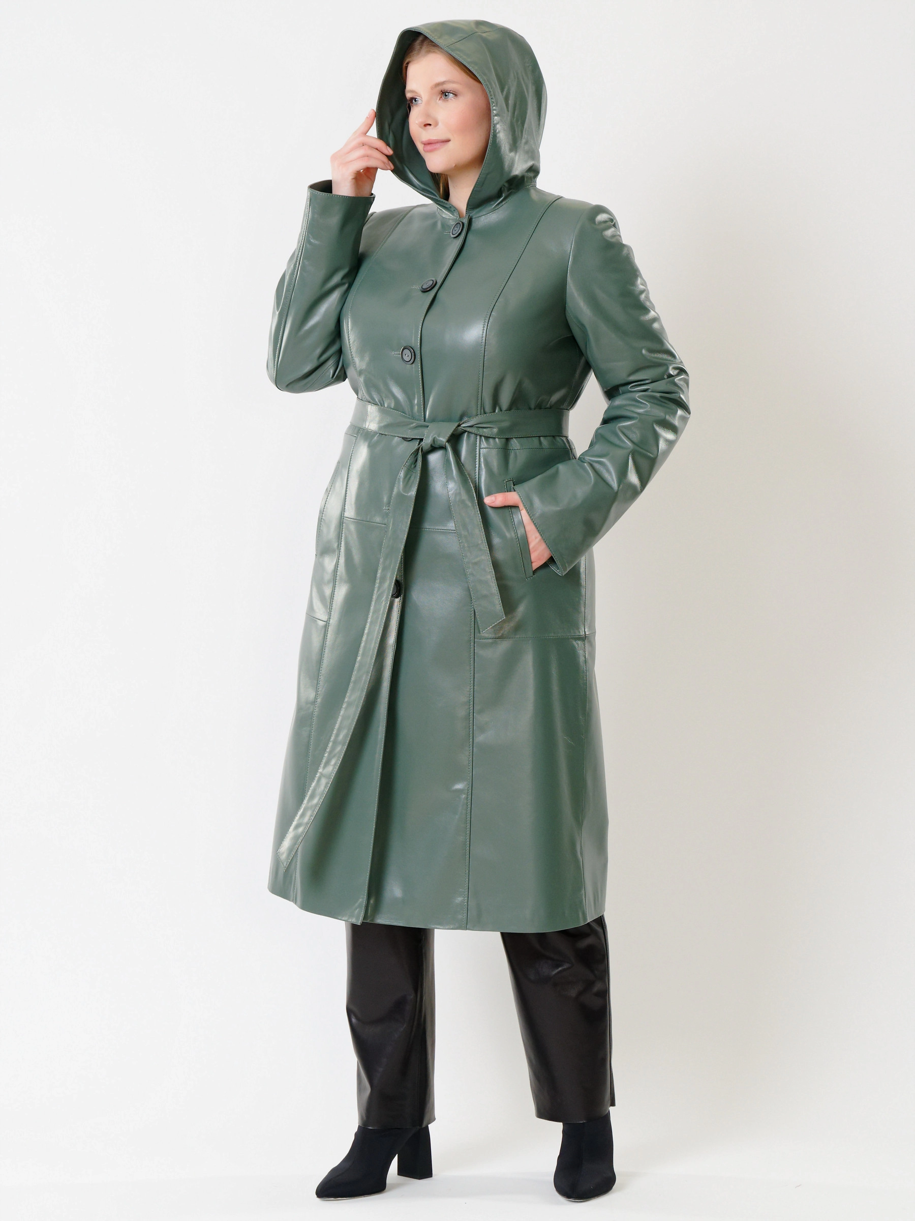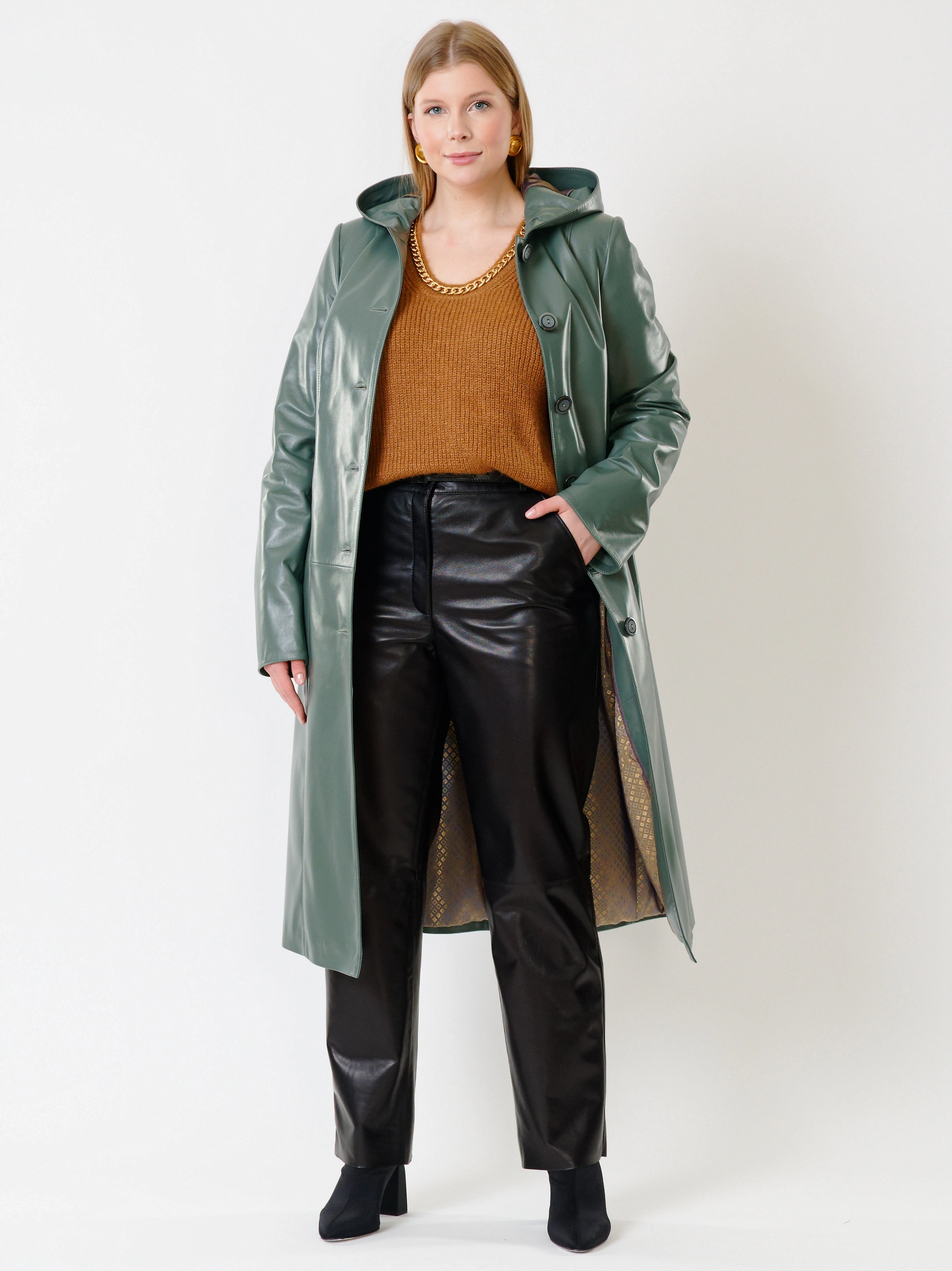Кожаный комплект женский: Плащ утепленный 380нш + Брюки 04, оливковый/черный, р. 46, арт. 111265