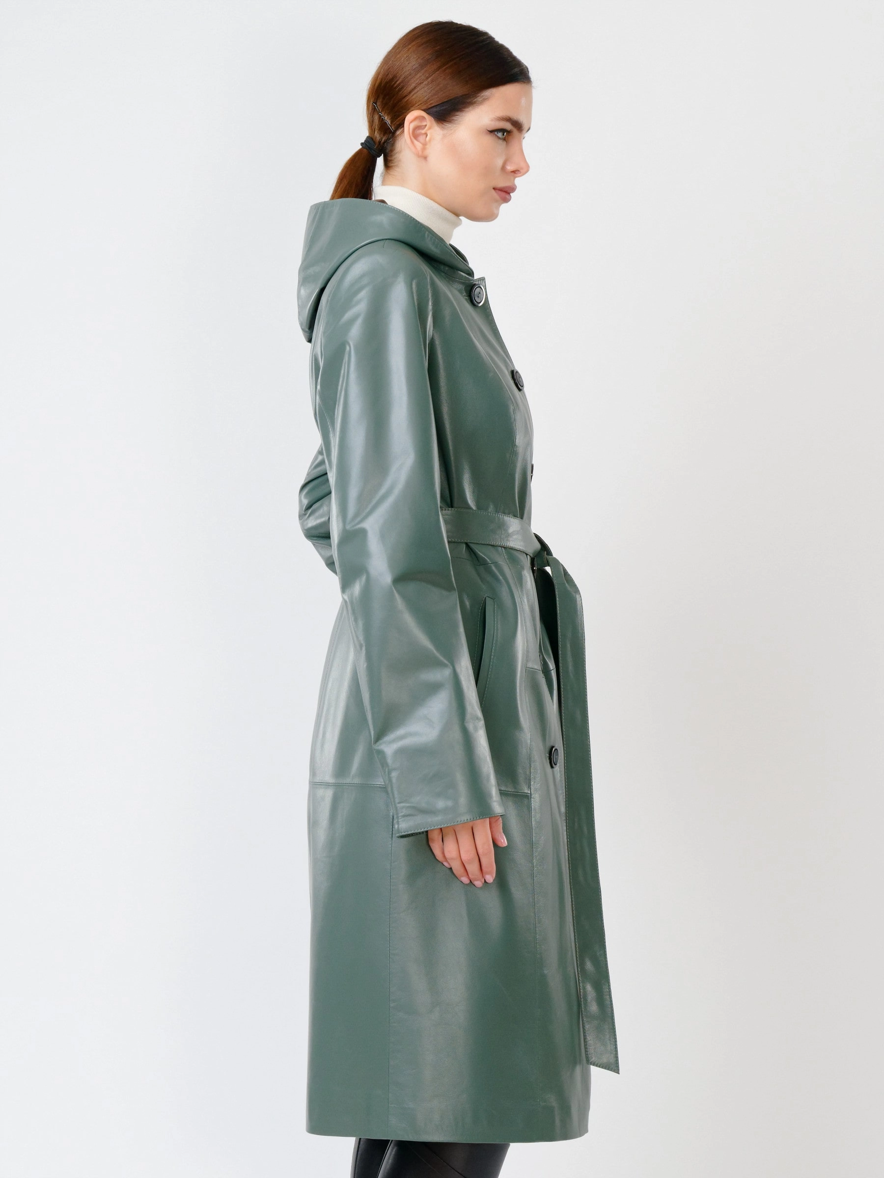 Кожаный женский утепленный плащ с капюшоном 380нш, размер 52, оливковый, артикул 91391