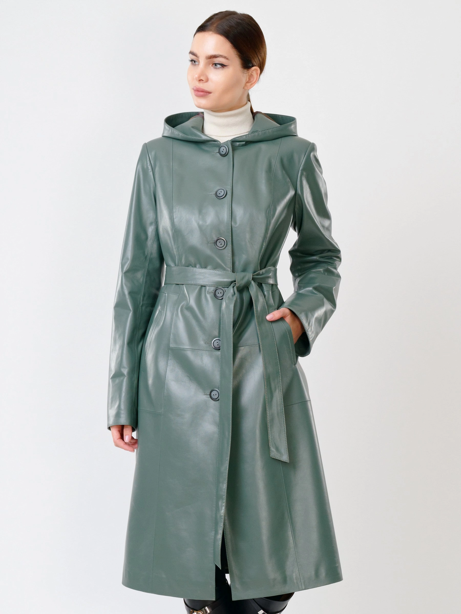 Товар кожаный женский утепленный плащ с капюшоном 380нш, размер 52, оливковый, артикул 91391 выполнен из натуральной кожи с застежкой пуговицы. Рассчитан на сезон: демисезон. Длина изделия 112 см, силуэт полуприлегающий.