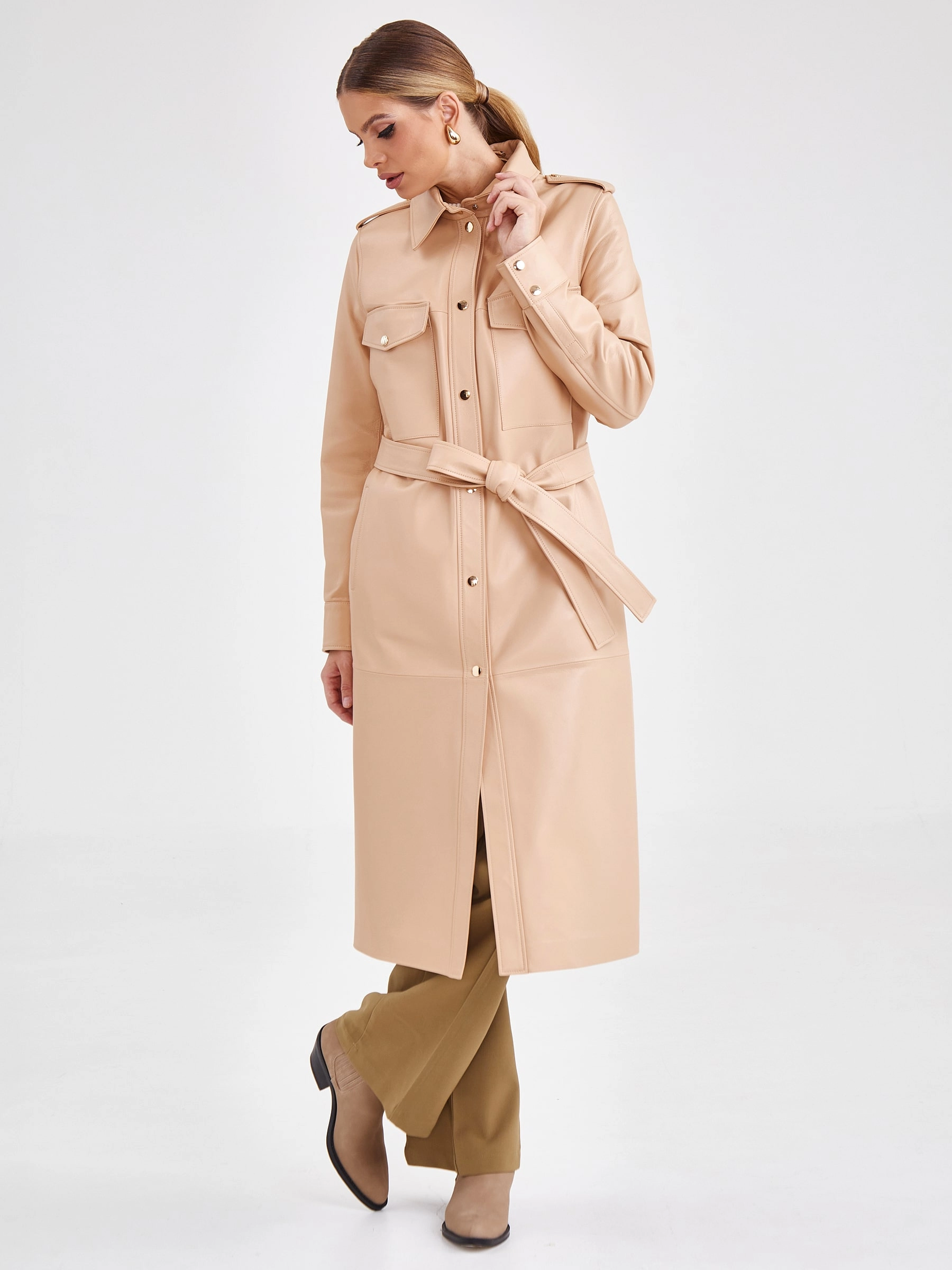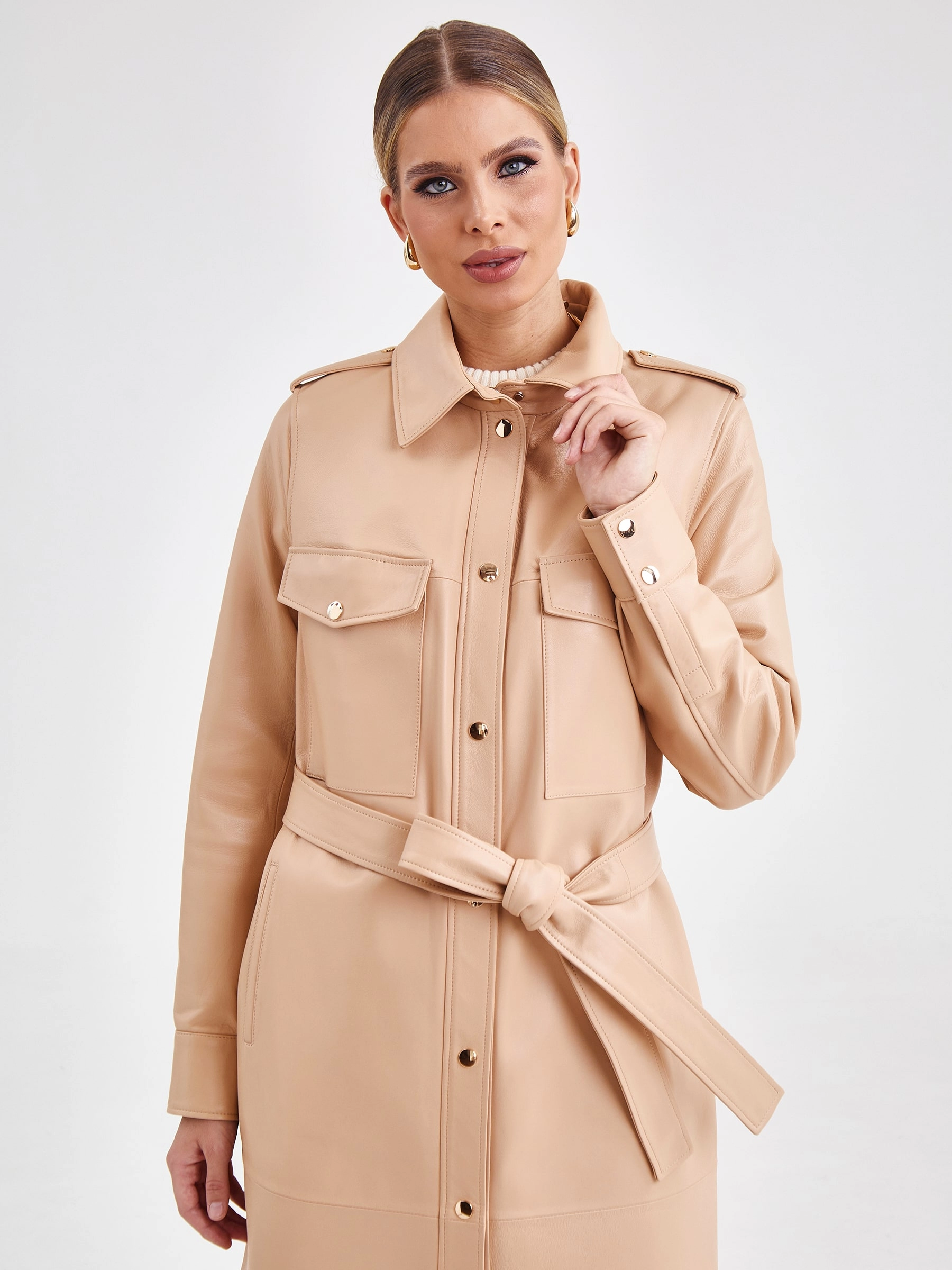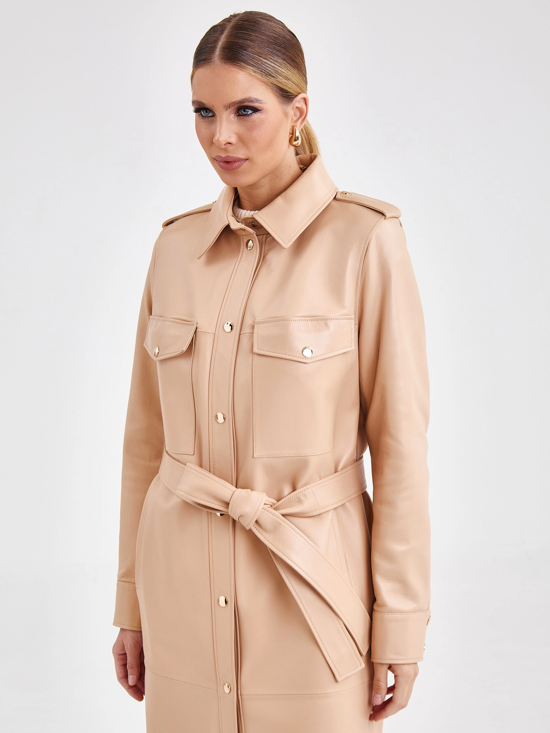 Кожаное платье-рубашка из натуральной кожи премиум-класса станет ключевым элементом эффектного образа. Модель прямого кроя длиной 115 см в нежном бежевом оттенке выполнена из гладкой кожи. Спортивный характер изделию придают отложной воротник, длинные рукава втачного кроя и два боковых кармана. Изящный акцент добавляют нагрудные карманы с клапанами на золотистых кнопках. Дополняет платье регулируемый пояс-лента, позволяющий варьировать силуэт. Модель без подкладки и декоративной отделки идеальна для сезона весна-лето. Совет стилиста: это платье обладает универсальностью рубашки. Носите его как самостоятельный элемент с босоножками на каблуке и лаконичными аксессуарами для элегантного дневного образа. Для стиля кэжуал завяжите пояс свободнее и сочетайте с кроссовками или грубыми ботинками. Для многослойности наденьте поверх тонкий водолазный свитер или футболку, оставив воротник открытым.