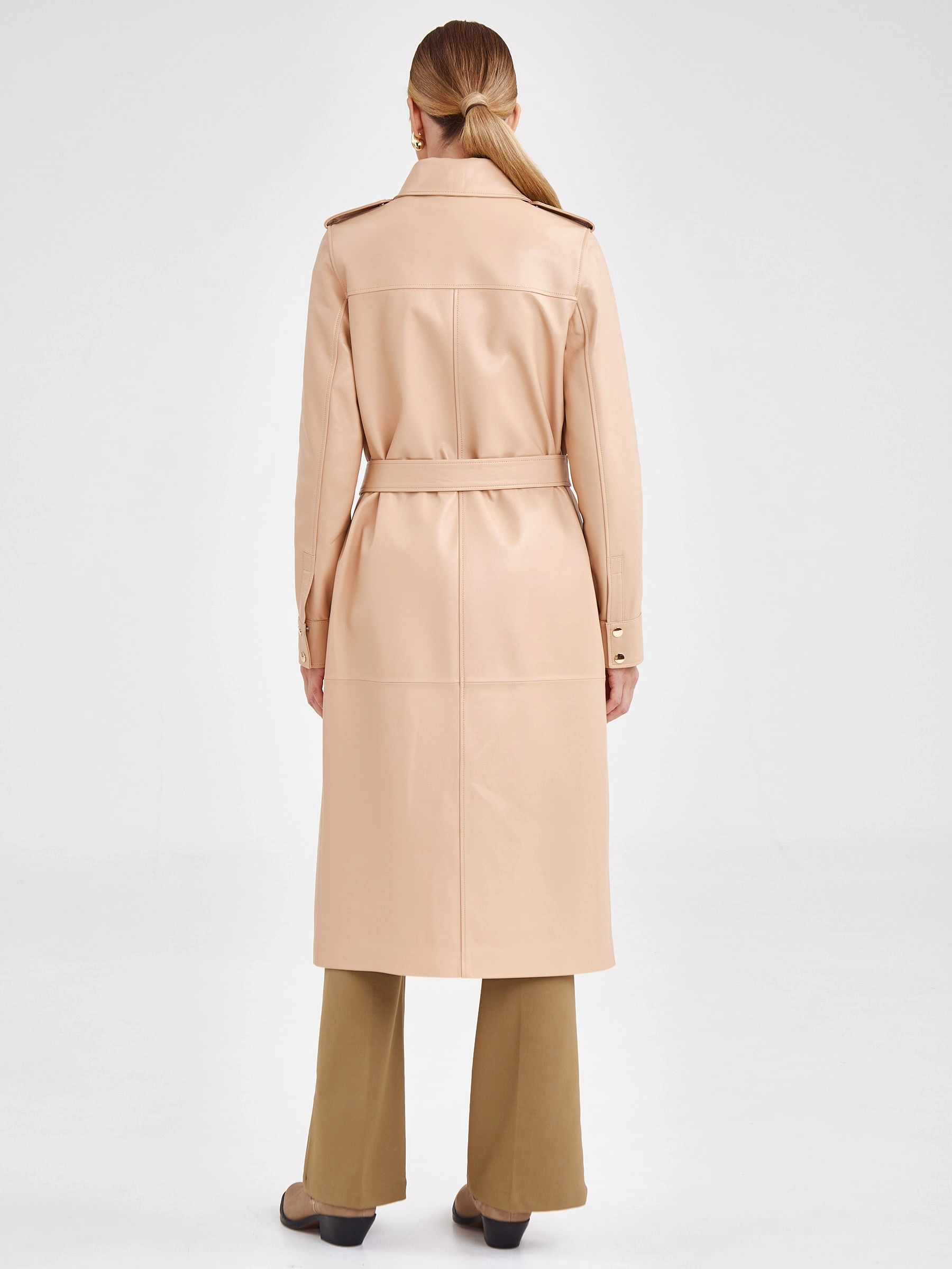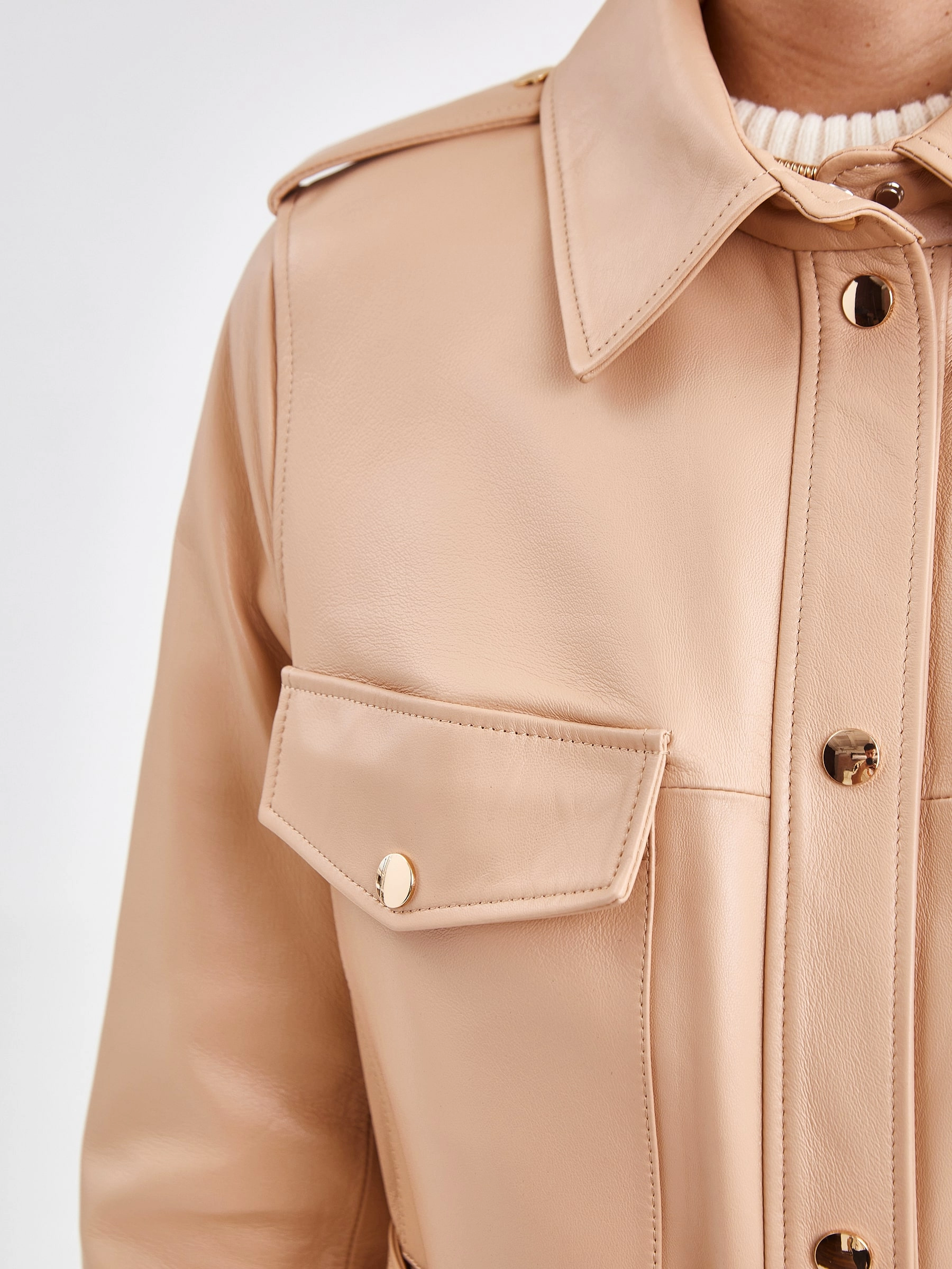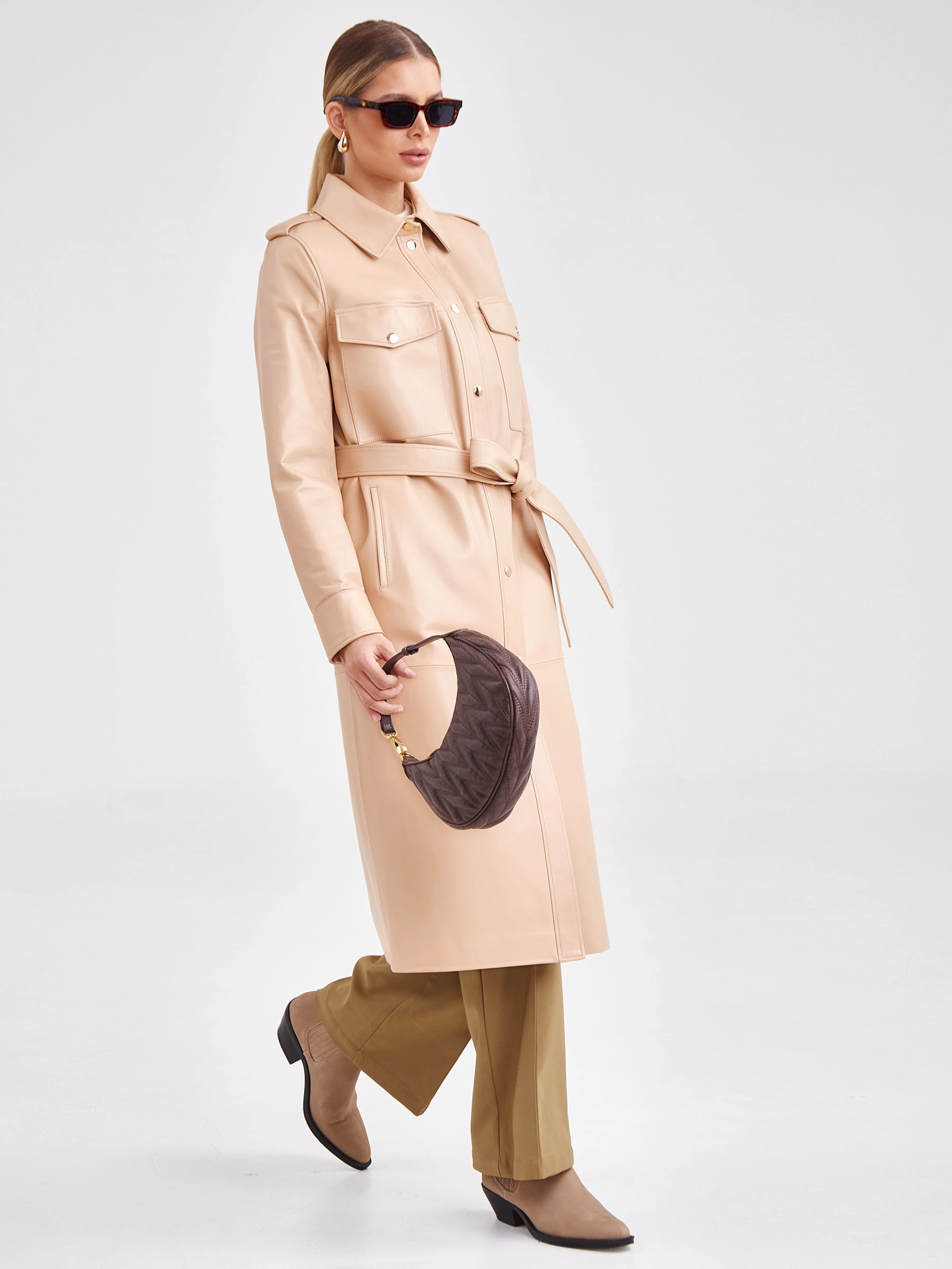 Кожаное платье-рубашка из натуральной кожи премиум-класса станет ключевым элементом эффектного образа. Модель прямого кроя длиной 115 см в нежном бежевом оттенке выполнена из гладкой кожи. Спортивный характер изделию придают отложной воротник, длинные рукава втачного кроя и два боковых кармана. Изящный акцент добавляют нагрудные карманы с клапанами на золотистых кнопках. Дополняет платье регулируемый пояс-лента, позволяющий варьировать силуэт. Модель без подкладки и декоративной отделки идеальна для сезона весна-лето. Совет стилиста: это платье обладает универсальностью рубашки. Носите его как самостоятельный элемент с босоножками на каблуке и лаконичными аксессуарами для элегантного дневного образа. Для стиля кэжуал завяжите пояс свободнее и сочетайте с кроссовками или грубыми ботинками. Для многослойности наденьте поверх тонкий водолазный свитер или футболку, оставив воротник открытым.