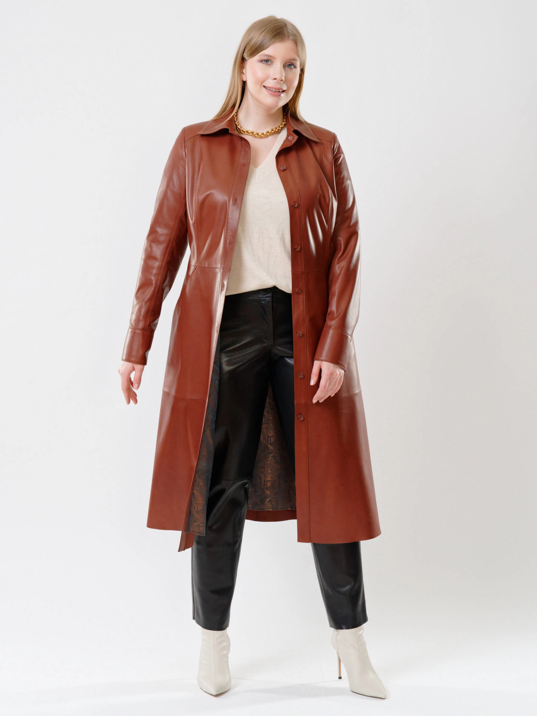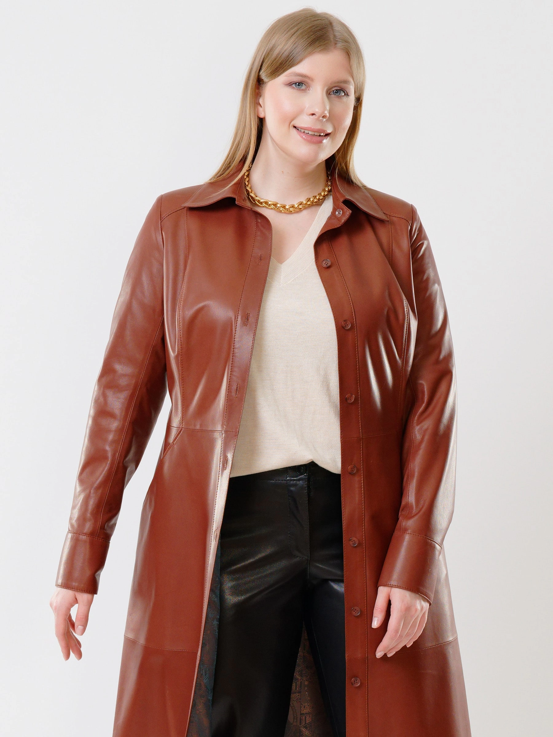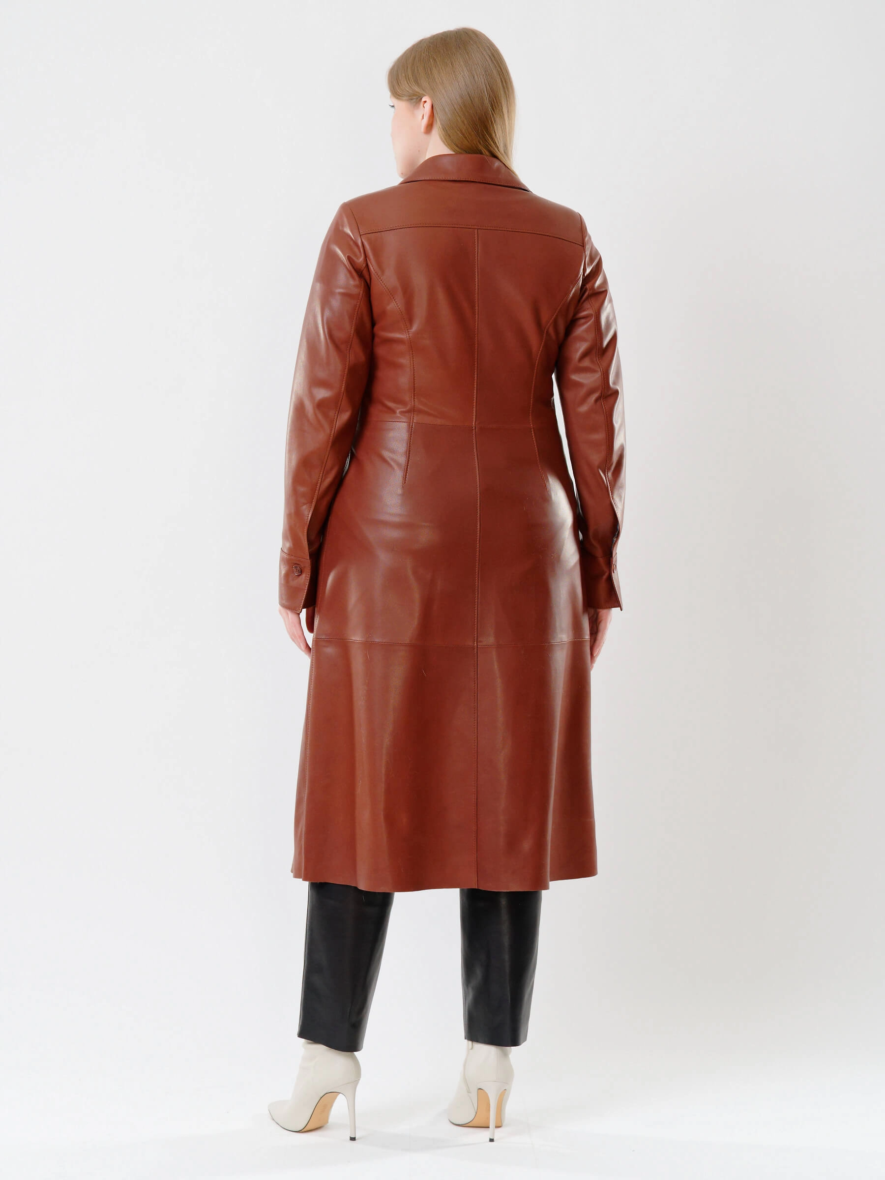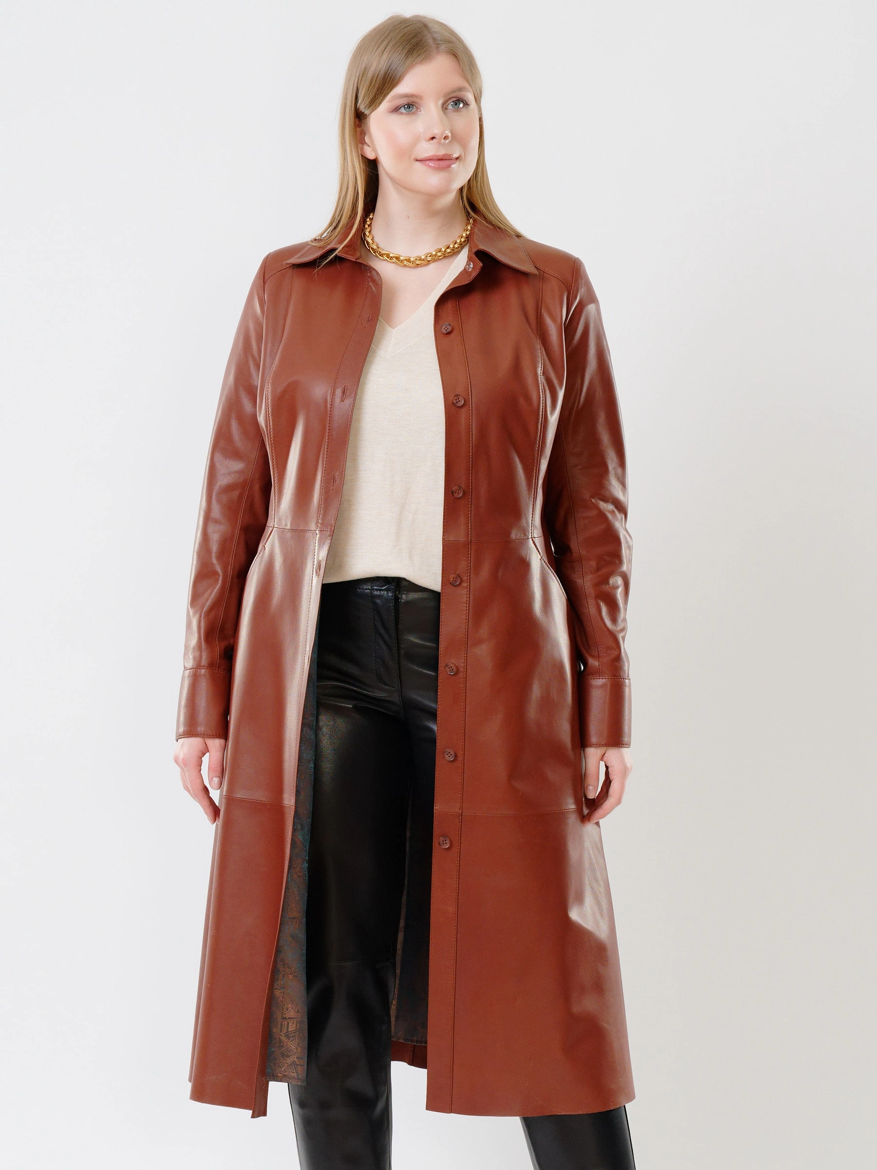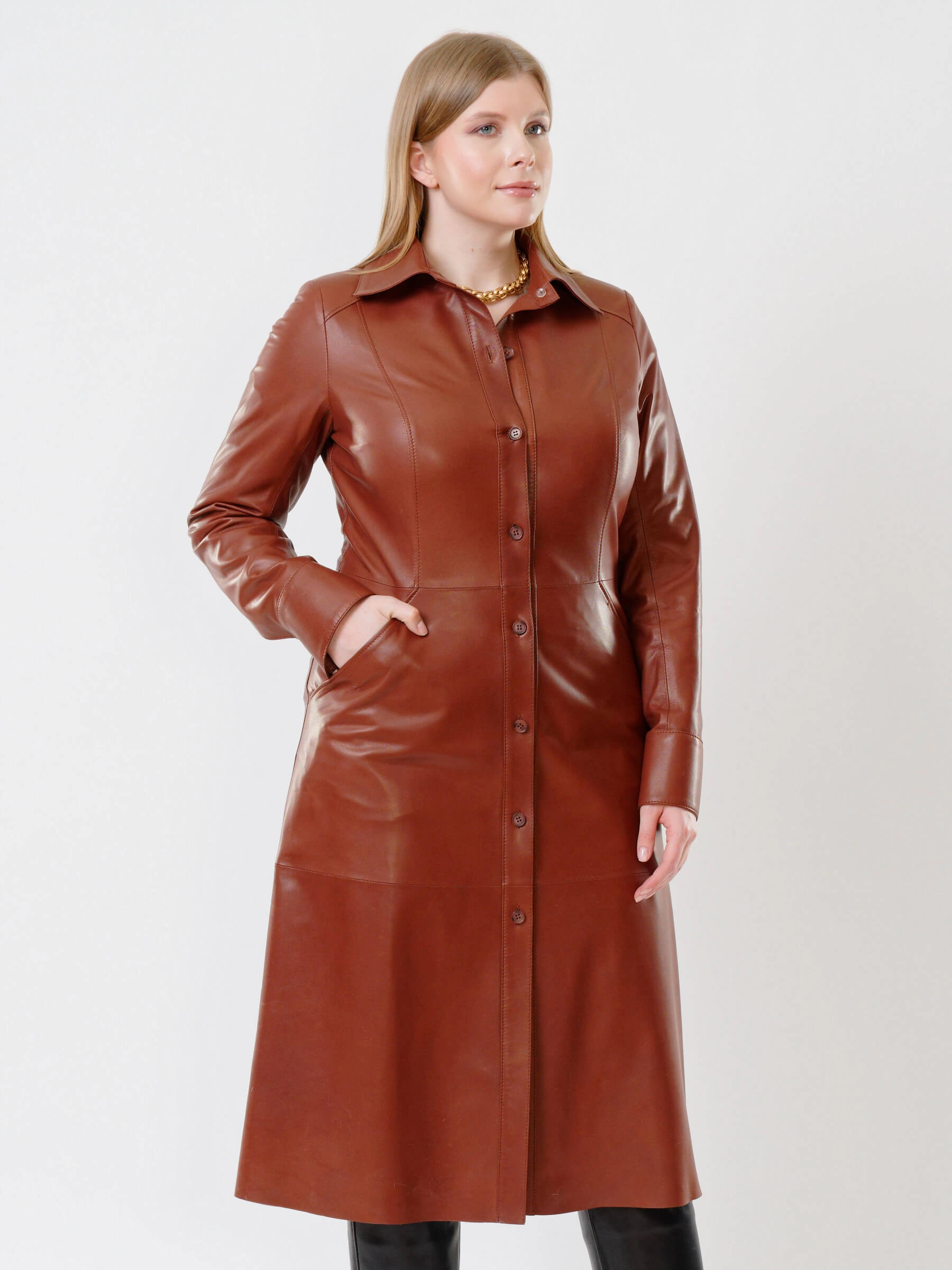 Шикарное женское длинное платье из натуральной кожи глубокого коричневого оттенка с приталенным силуэтом станет настоящей жемчужиной вашего гардероба. Элегантная застежка на пуговицах, практичные врезные карманы и широкий кожаный пояс создают идеальный баланс между утонченностью и функциональностью. Приталенный крой изысканно подчеркивает талию, а универсальный дизайн позволяет создавать разнообразные образы — от дерзкого лука с ботильонами до роскошного вечернего ансамбля с лодочками на шпильке. Это платье — воплощение вневременной элегантности, которое будет уместно в любое время года и станет вашим надежным спутником как в повседневной жизни, так и на особых мероприятиях.