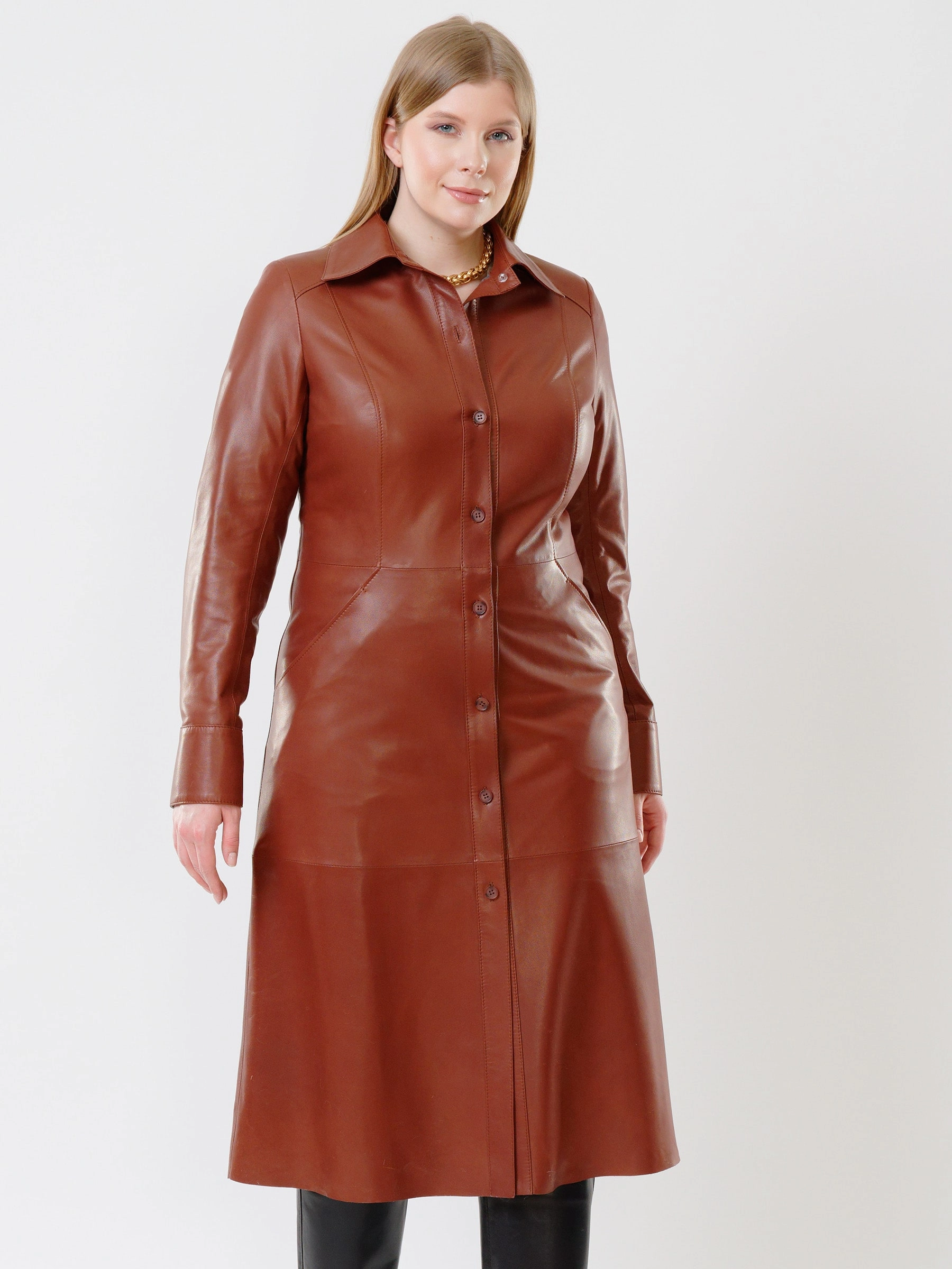 Товар женское кожаное платье рубашка из натуральной кожи 02, коричневое, размер 50, артикул 91460 выполнен из натуральной кожи с застежкой пуговицы. Рассчитан на сезон: весна-лето. Длина изделия 117 см, силуэт полуприлегающий.