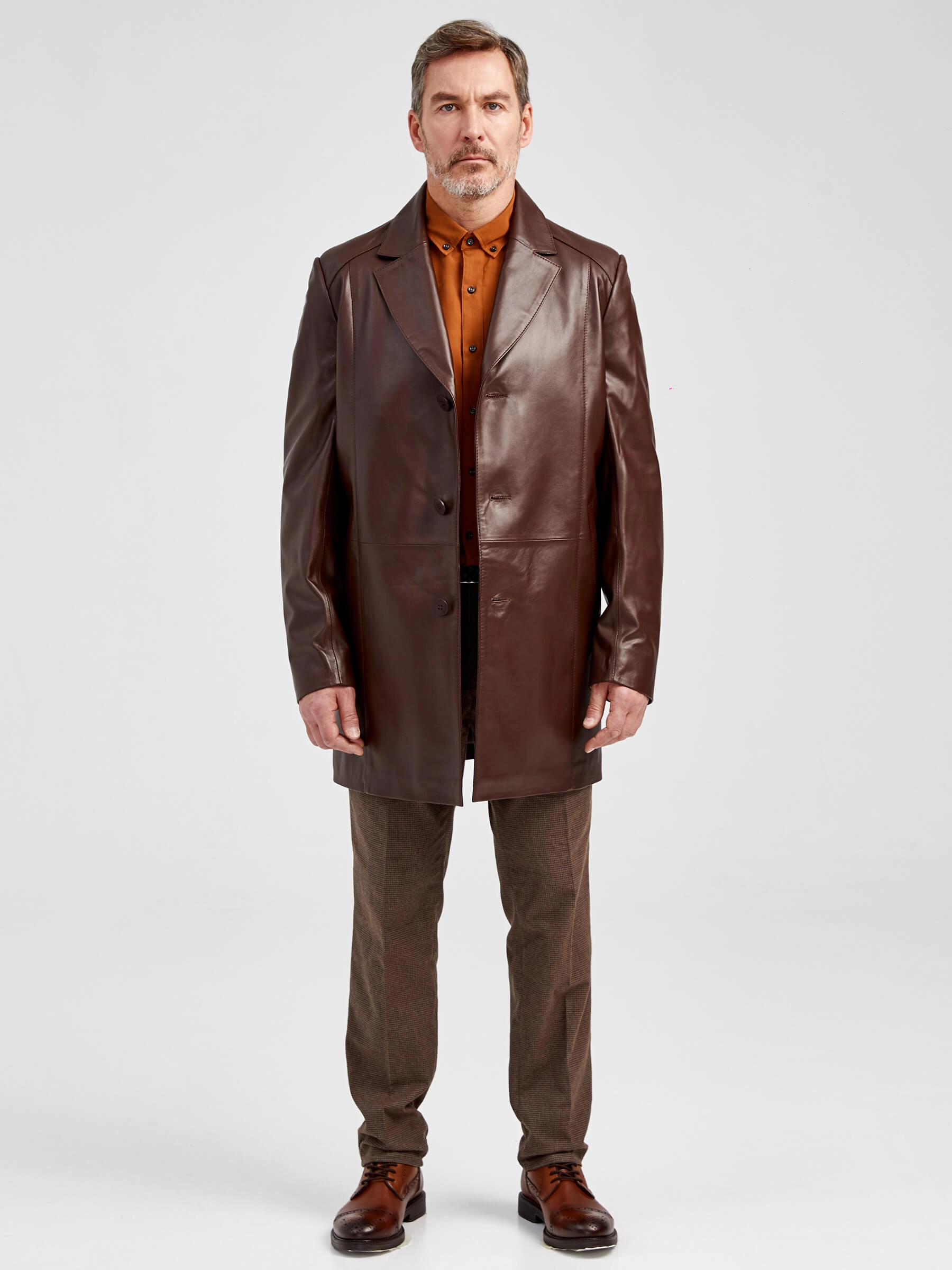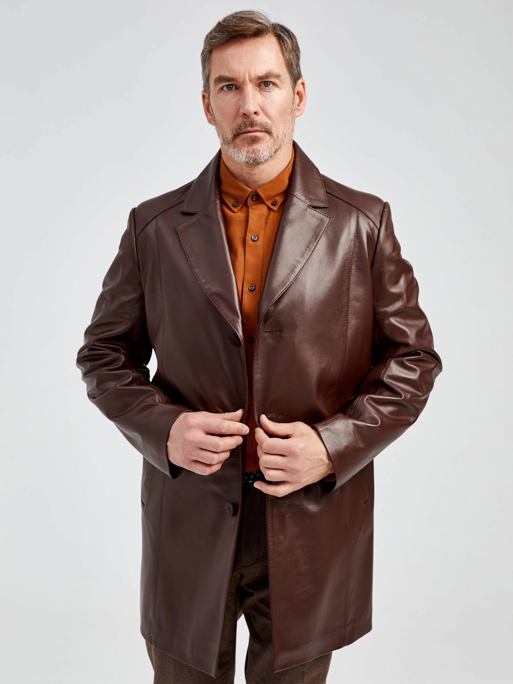 Товар кожаный мужской френч премиум класса 541, коричневый, размер 48, артикул 40521 выполнен из натуральной кожи с застежкой пуговицы. Рассчитан на сезон: демисезон. Длина изделия 90 см, силуэт прямой.