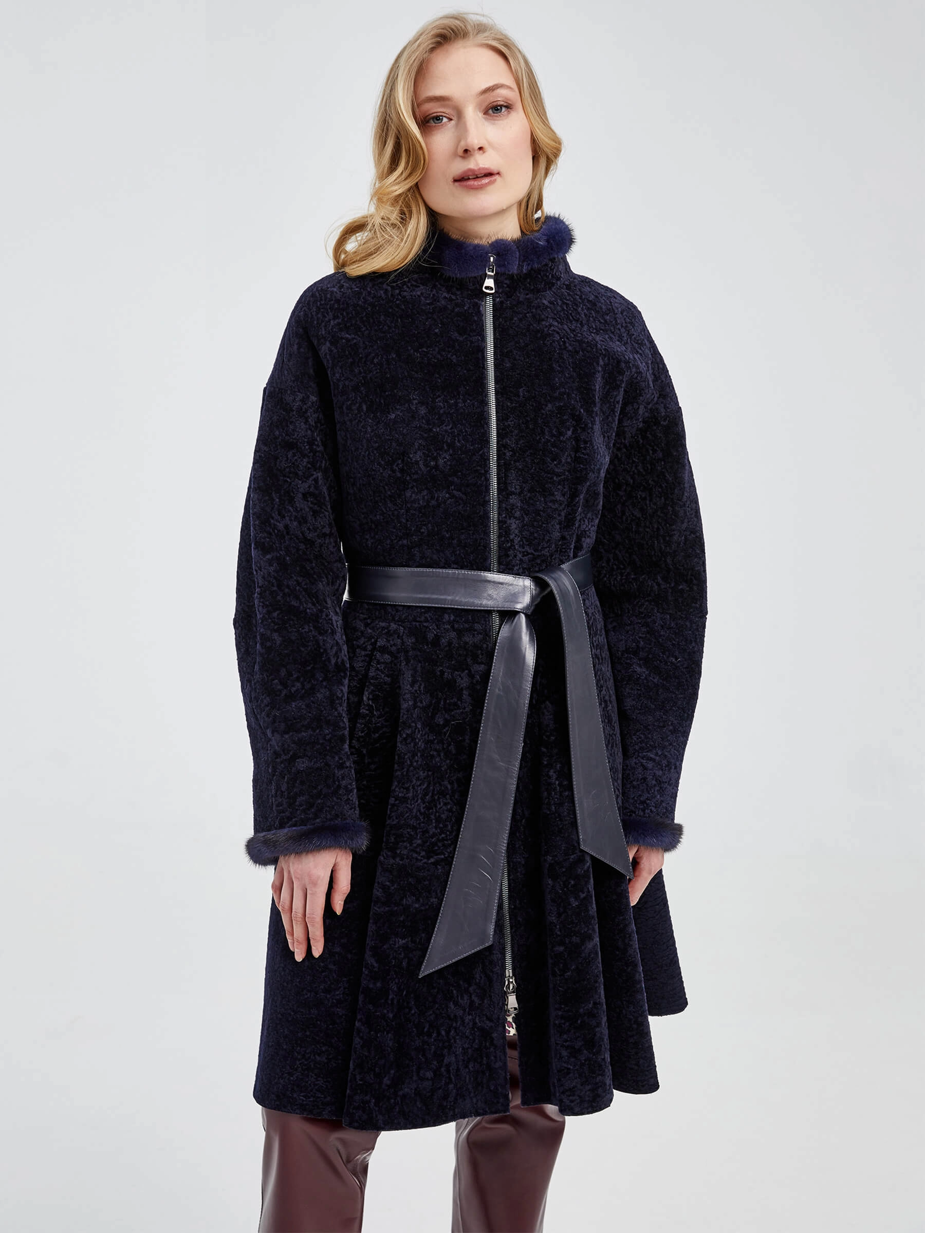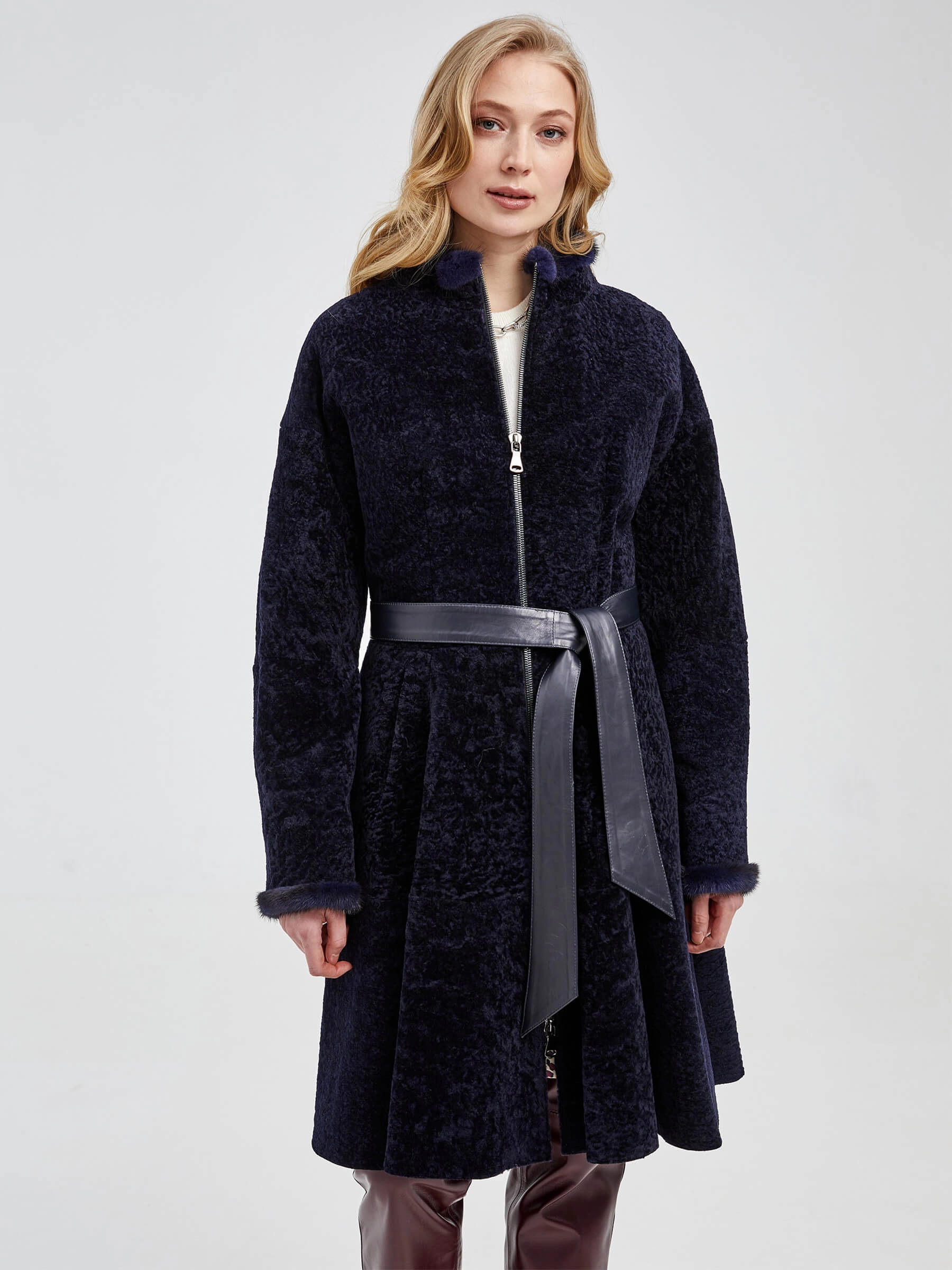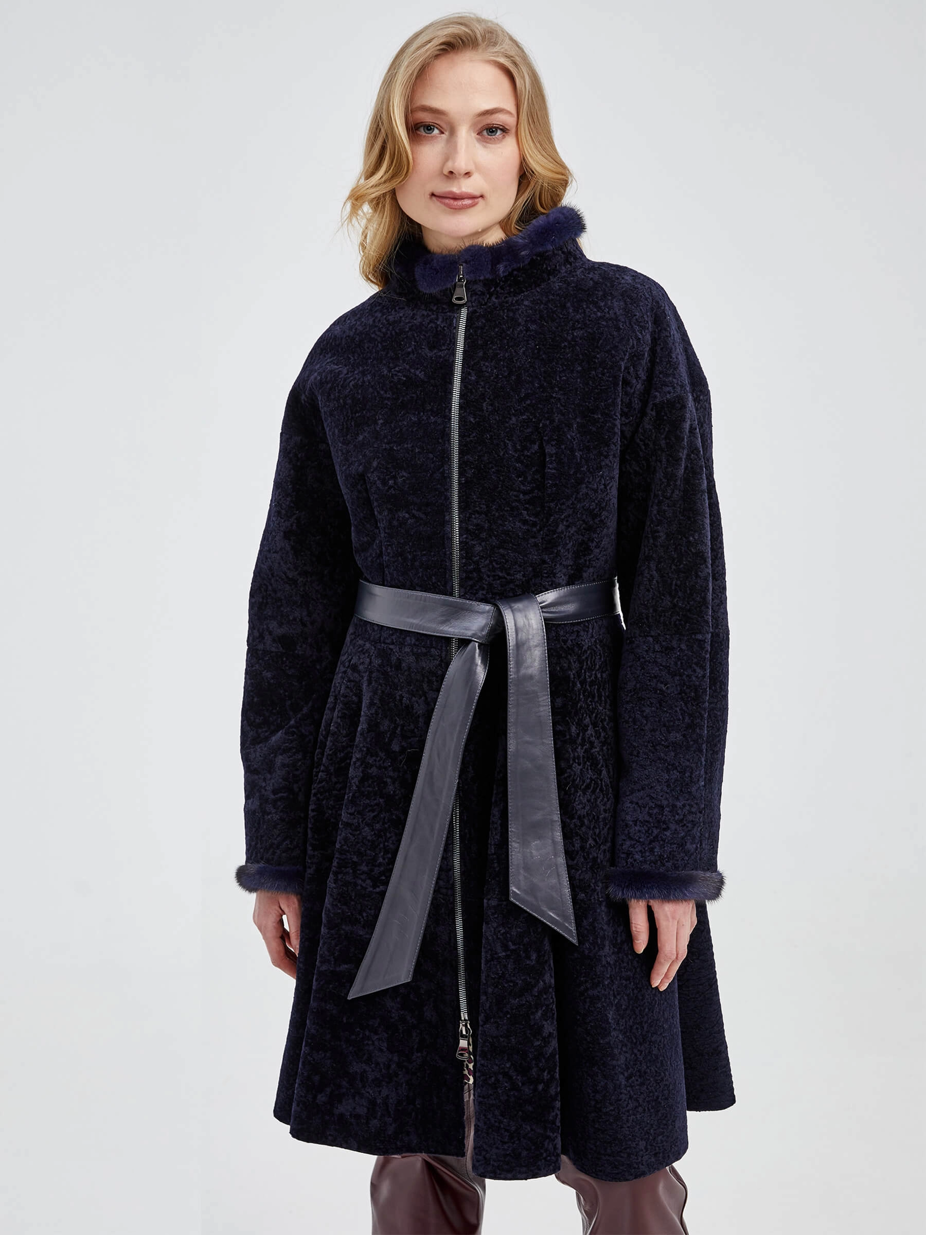 Приталенная модель, сшита из нежнейшего меха новозеландского ягненка. Мастера акцентрировали внимание на талии с расклешенными крупными складками и широким поясом-лентой из натуральной кожи. Воротник-стойка и рукава украшены натуральным мехом норки.