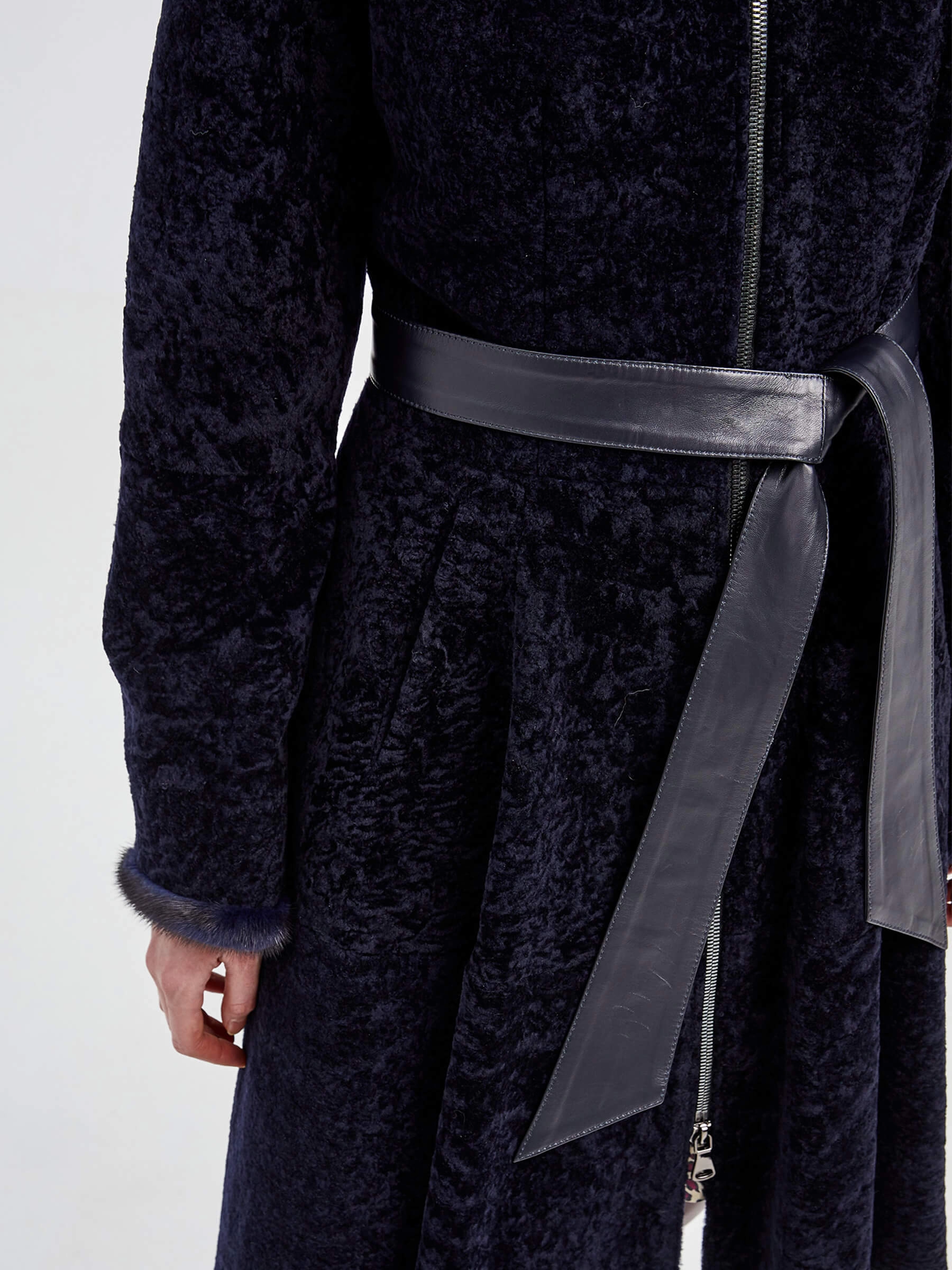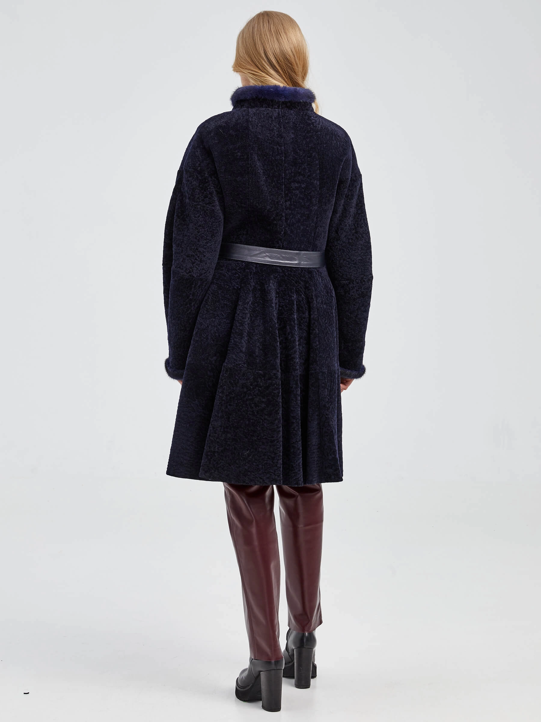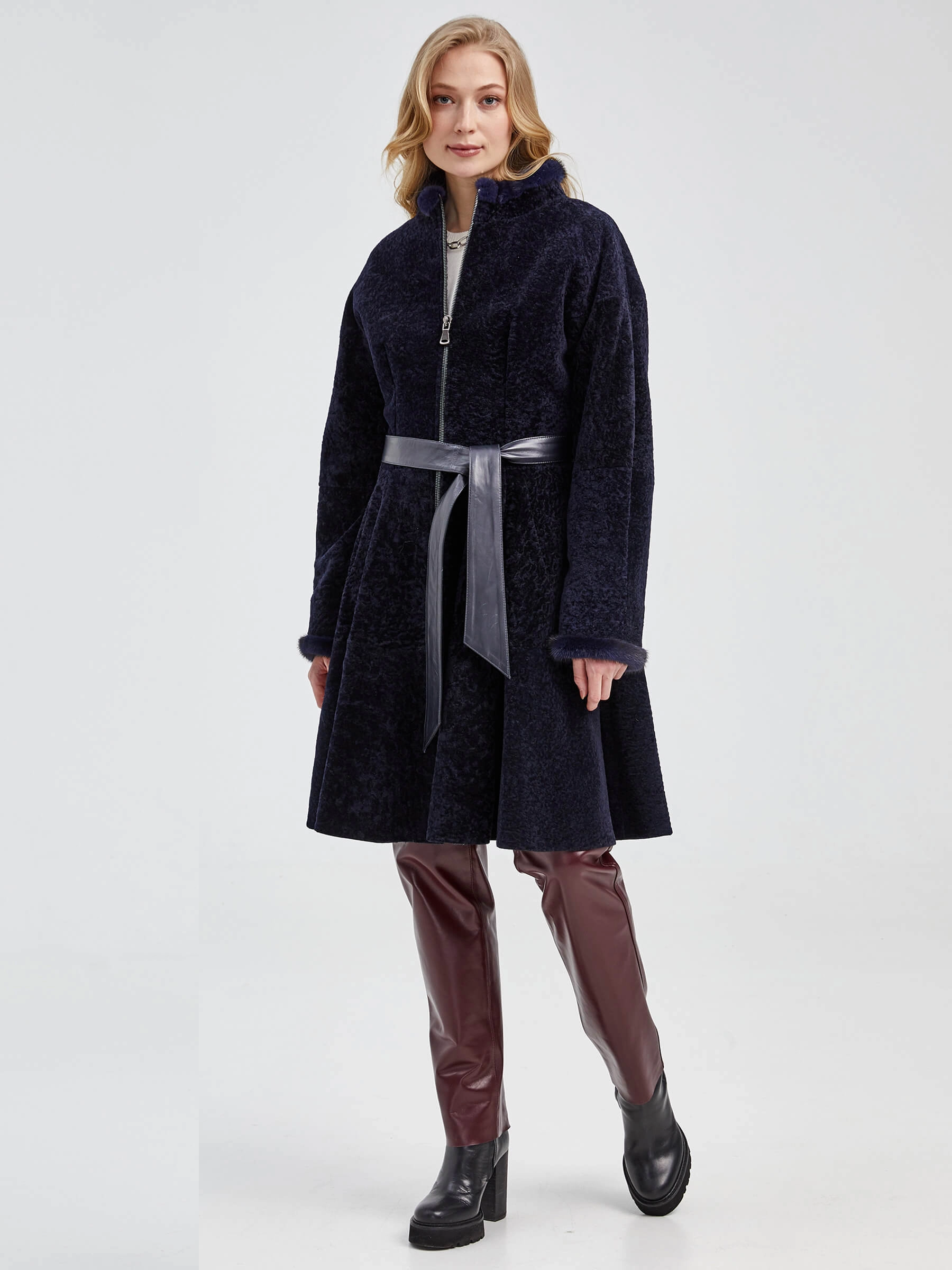 Приталенная модель, сшита из нежнейшего меха новозеландского ягненка. Мастера акцентрировали внимание на талии с расклешенными крупными складками и широким поясом-лентой из натуральной кожи. Воротник-стойка и рукава украшены натуральным мехом норки.