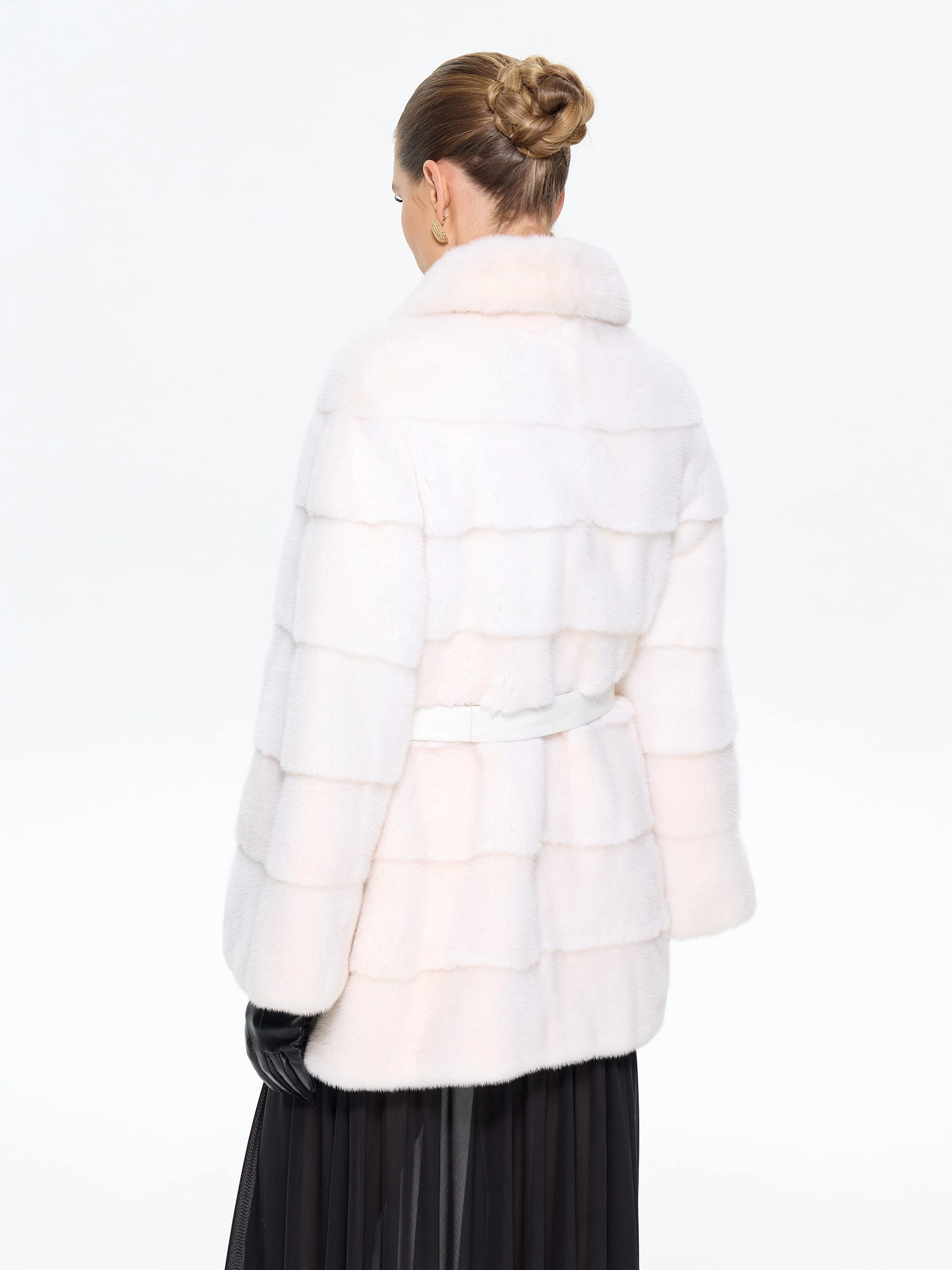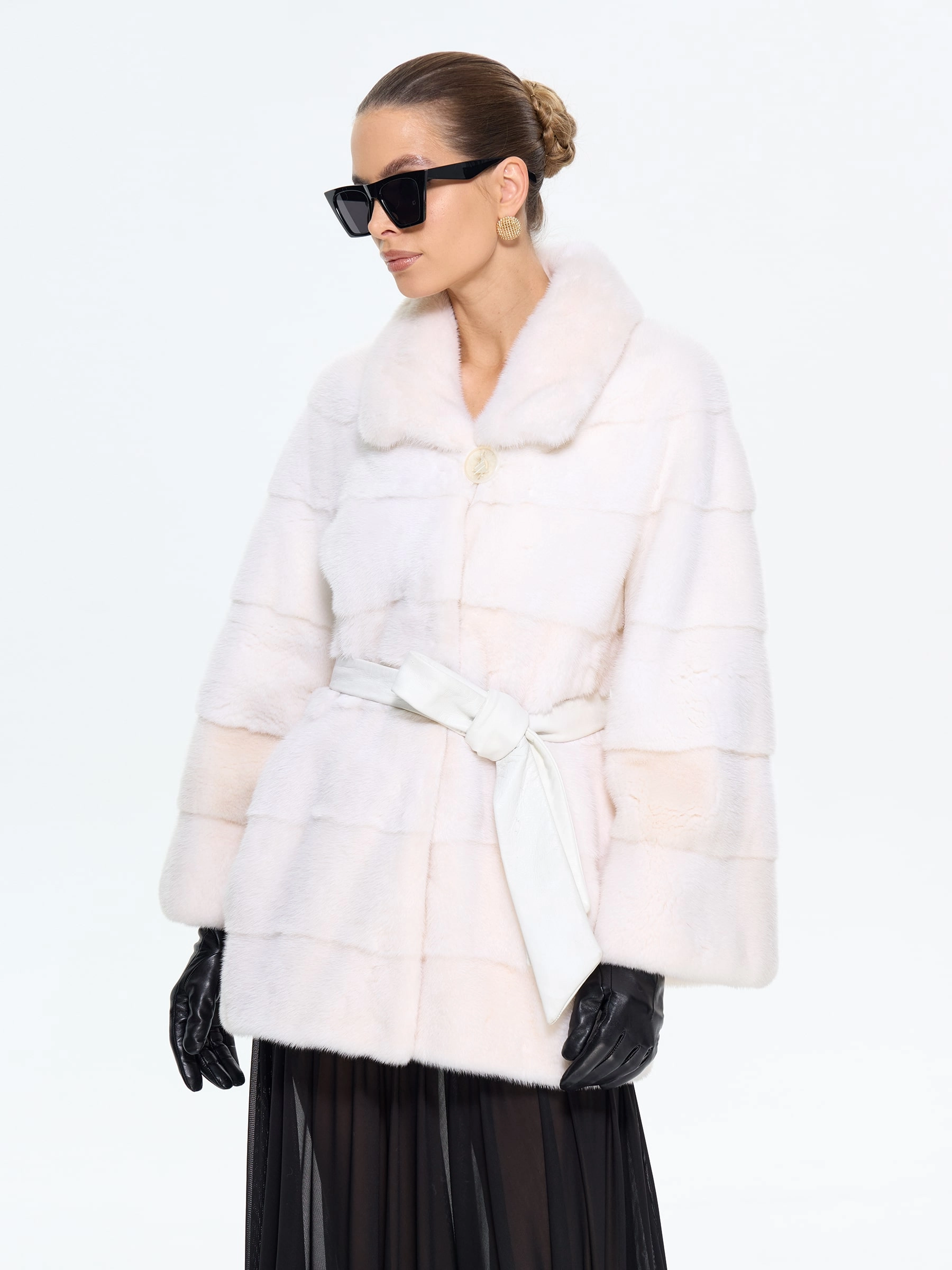 Короткая шуба BRASCHI из белоснежного меха натуральной норки в поперечной раскладке сочетает практичность и роскошь. Шкурки, выложенные перпендикулярно хребтовой линии, создают выразительную полосатую текстуру. Удобный крой с рукавом реглан и укороченным силуэтом подходит для активной жизни, подчеркивая стройность ног. Многофункциональный воротник адаптируется к любому образу — от строгой стойки до драпированных складок. Два боковых кармана и скрытые клипсы дополняют этот элегантный дизайн.