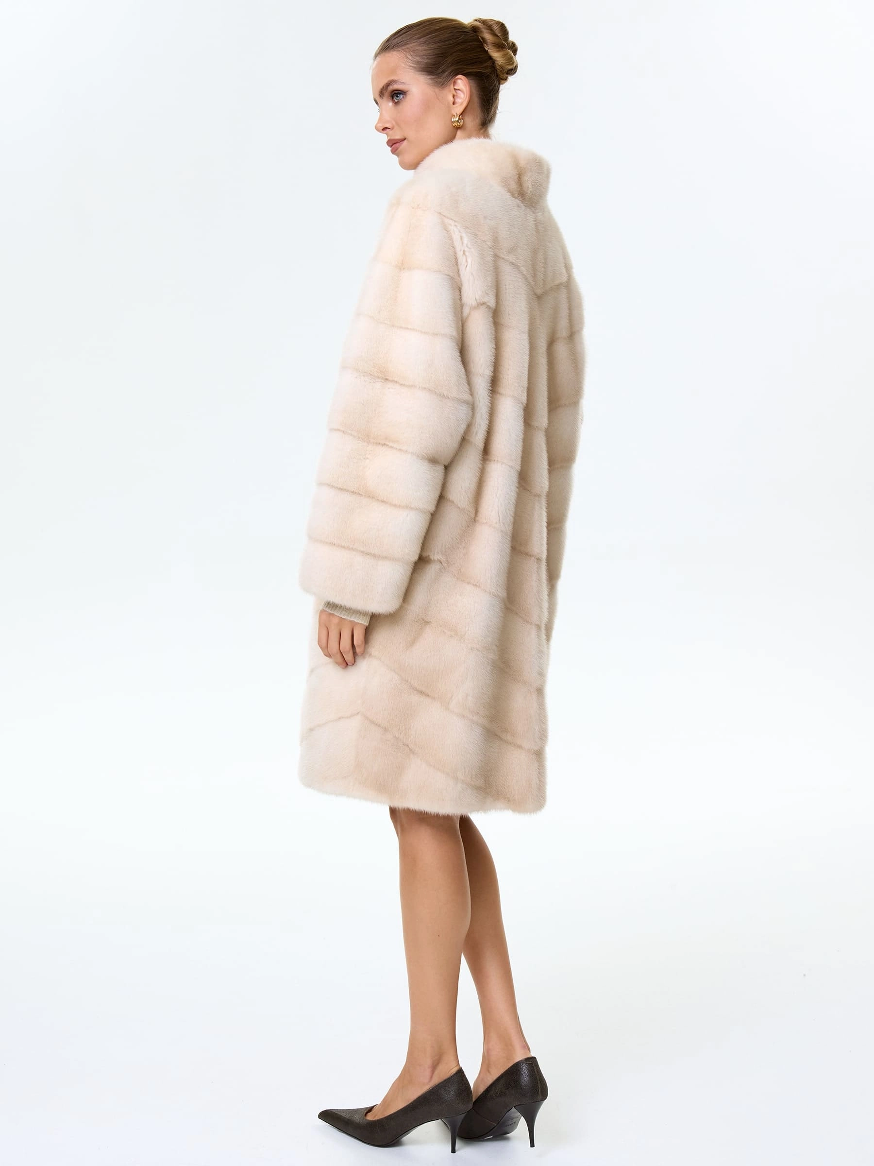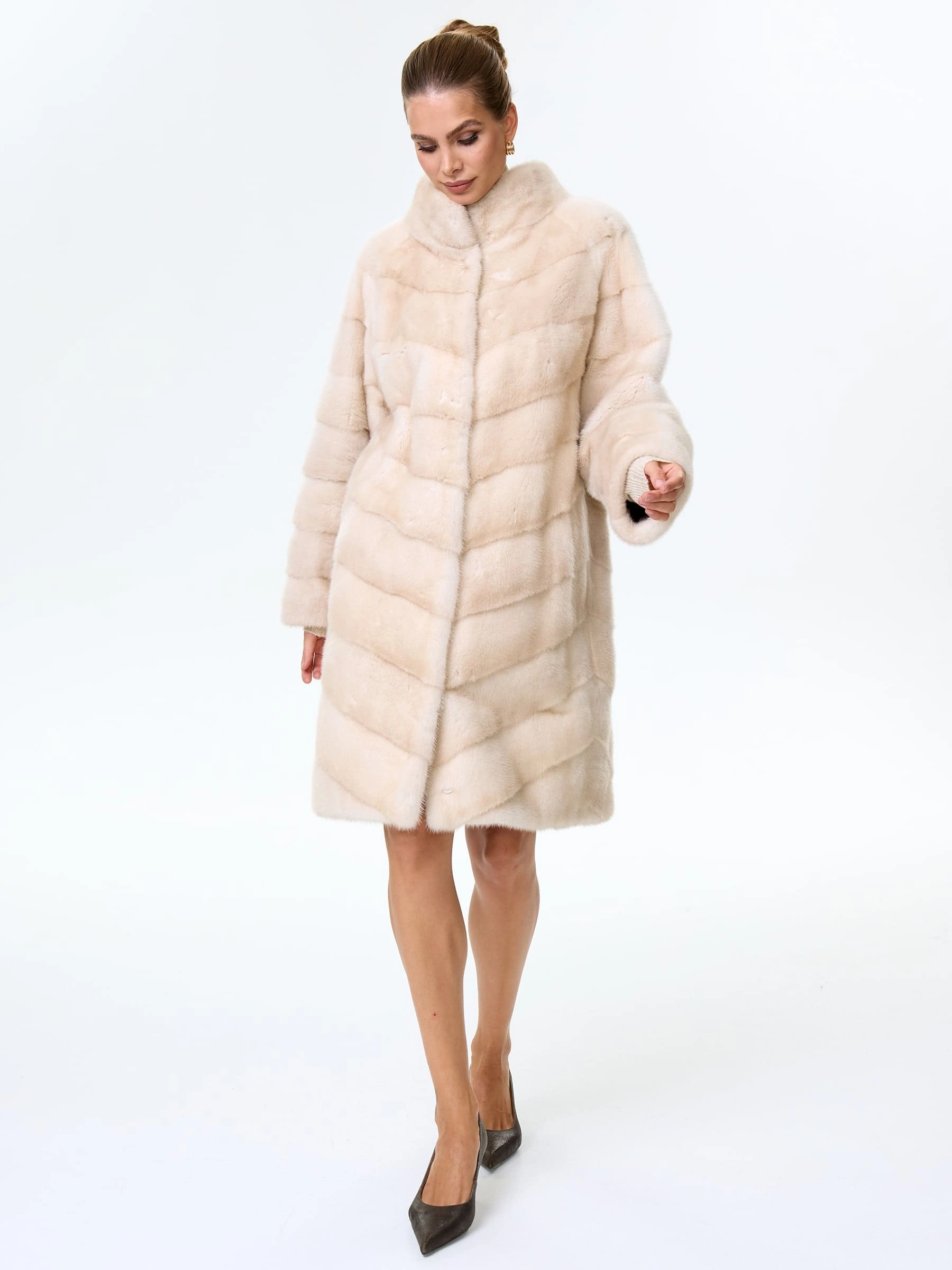 Поперечная женская норковая шуба премиум класса София(с), жемчужная, размер 50, артикул 34110