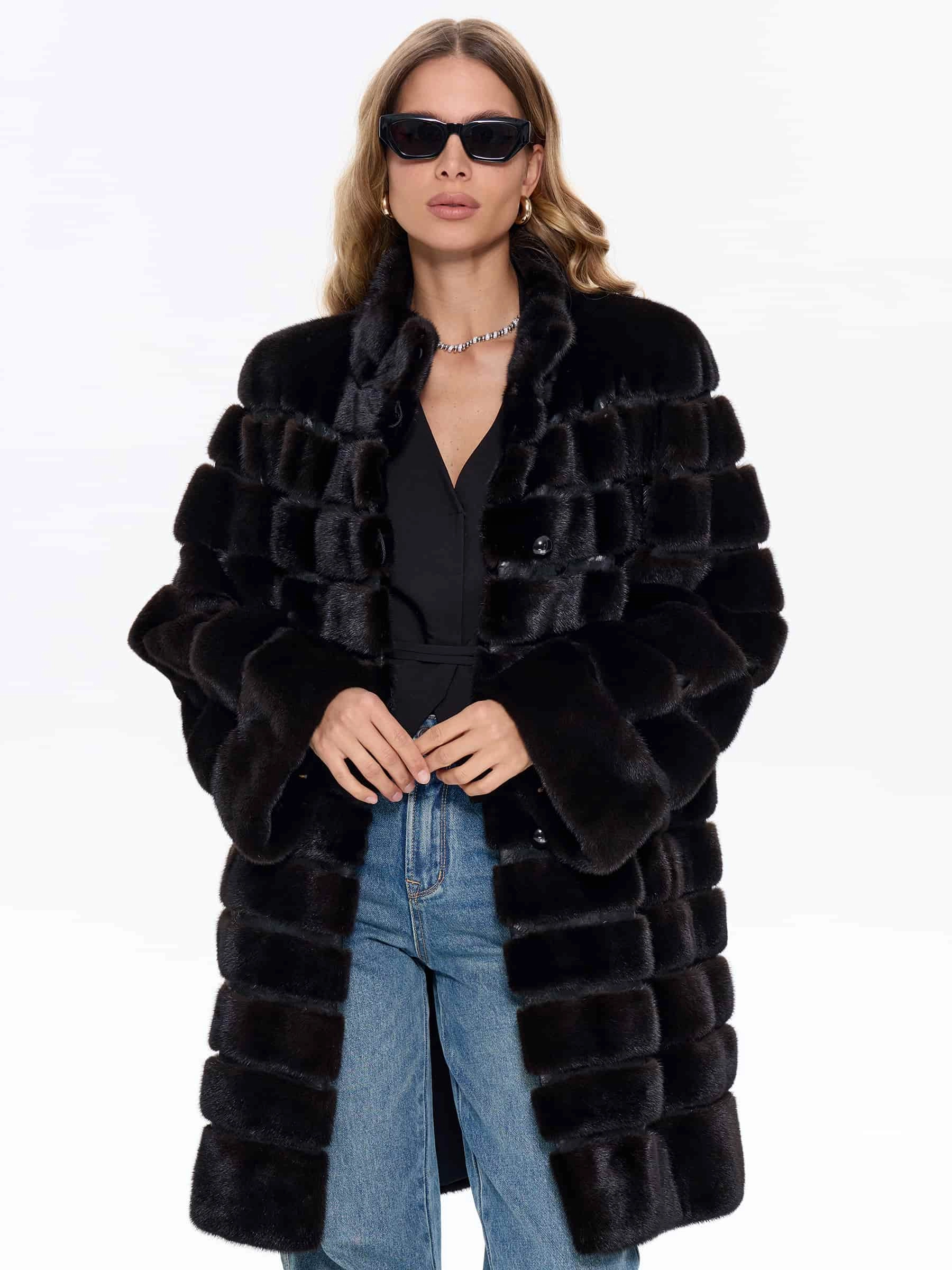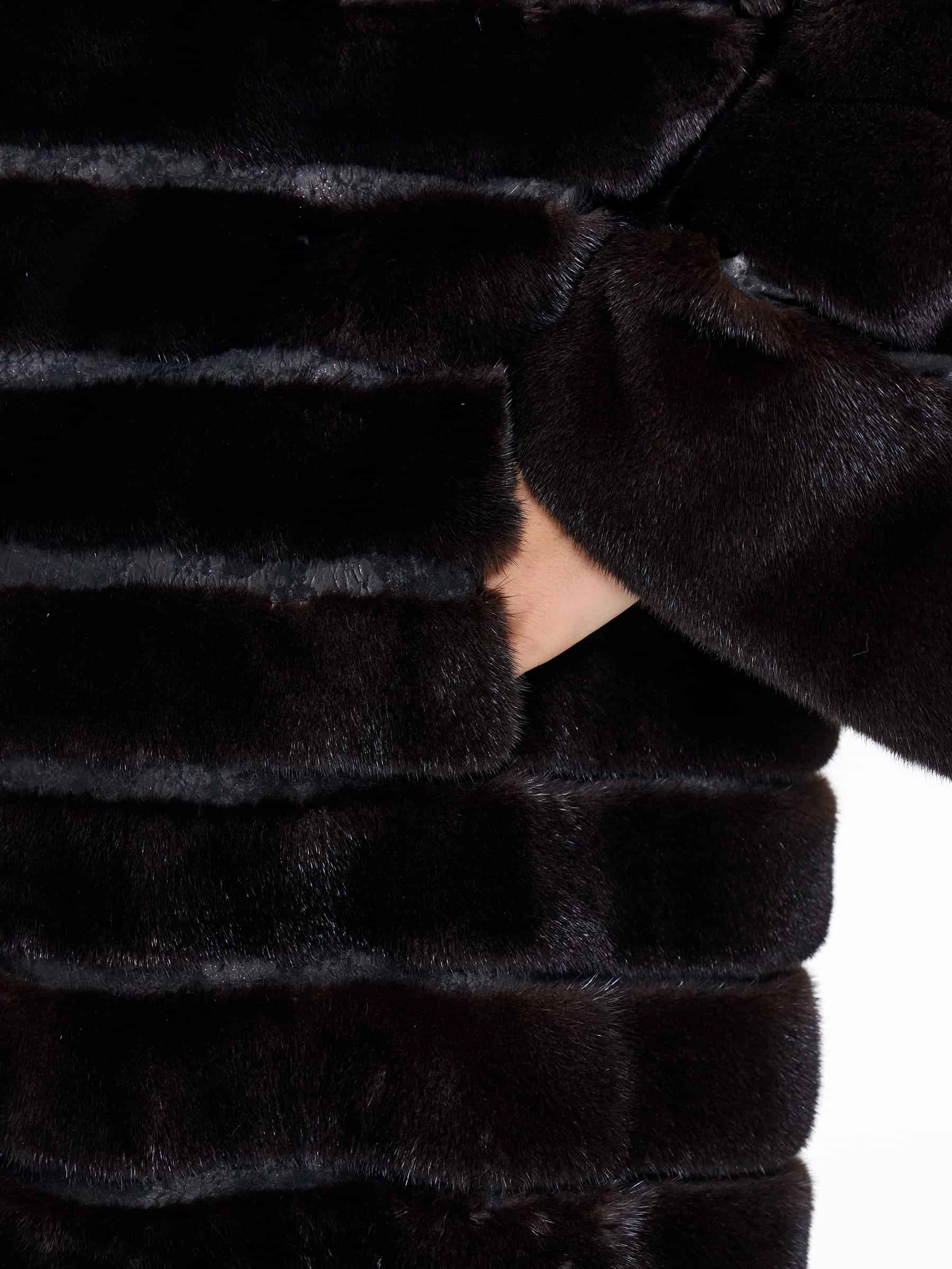Поперечная женская шуба из меха норки BRASCHI ELM 047, черная, размер 46, артикул 34430