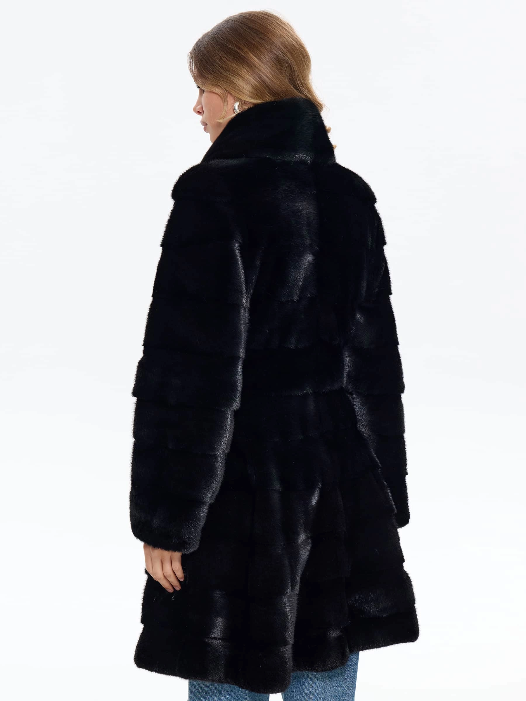 Элегантная приталенная шуба из густого меха натуральной норки в диагональной раскладке сочетает сдержанную роскошь и практичность. Нежный шелковистый мех с объемным эффектом мягко облегает фигуру, подчеркивая талию без ограничения движений. Трансформирующийся воротник-шале варьируется от строгой стойки до роскошных складок. Гипоаллергенная подкладка с антистатической обработкой обеспечивает комфорт, а скрытые клипсы и два боковых кармана добавляют практичности.