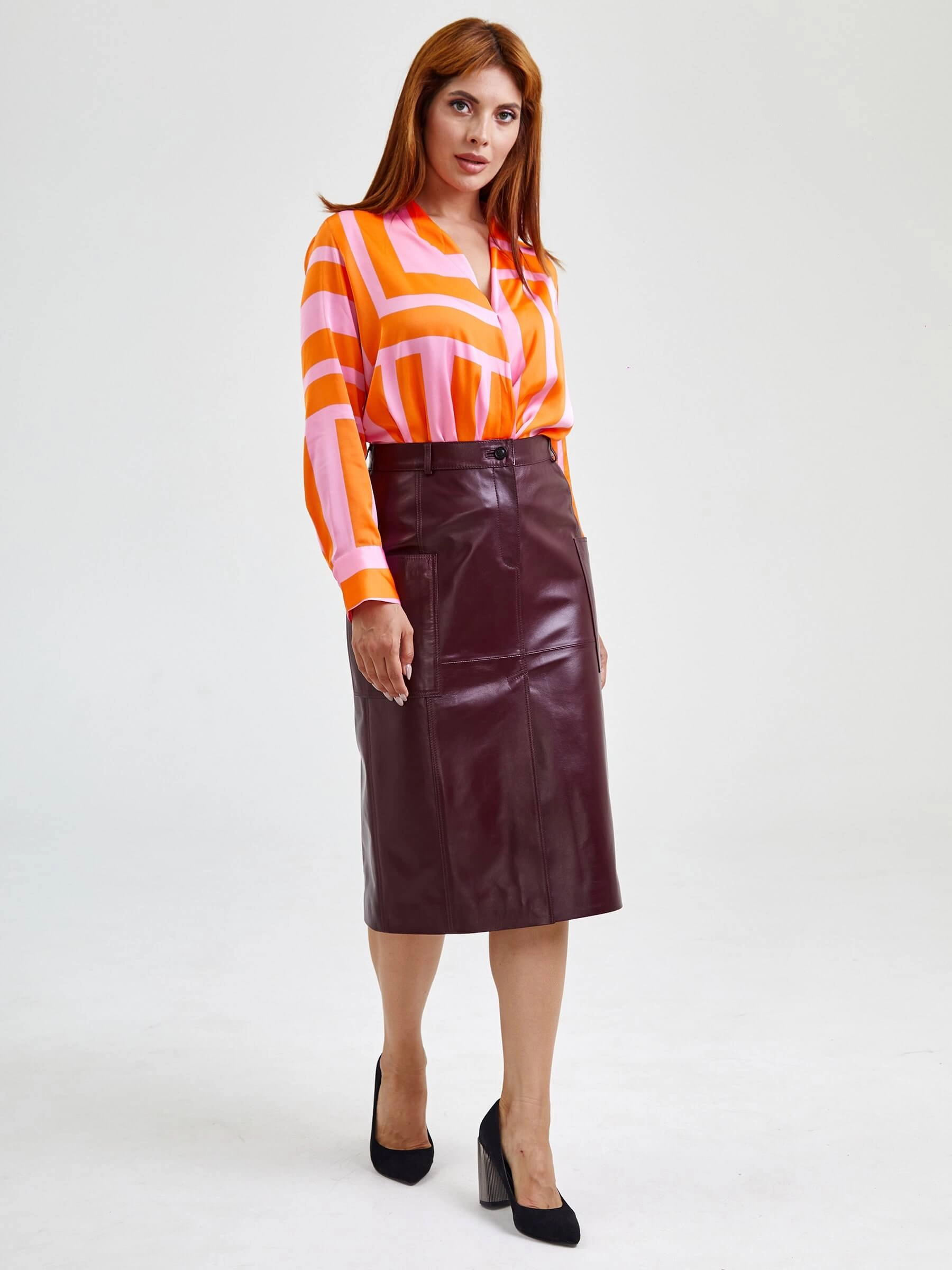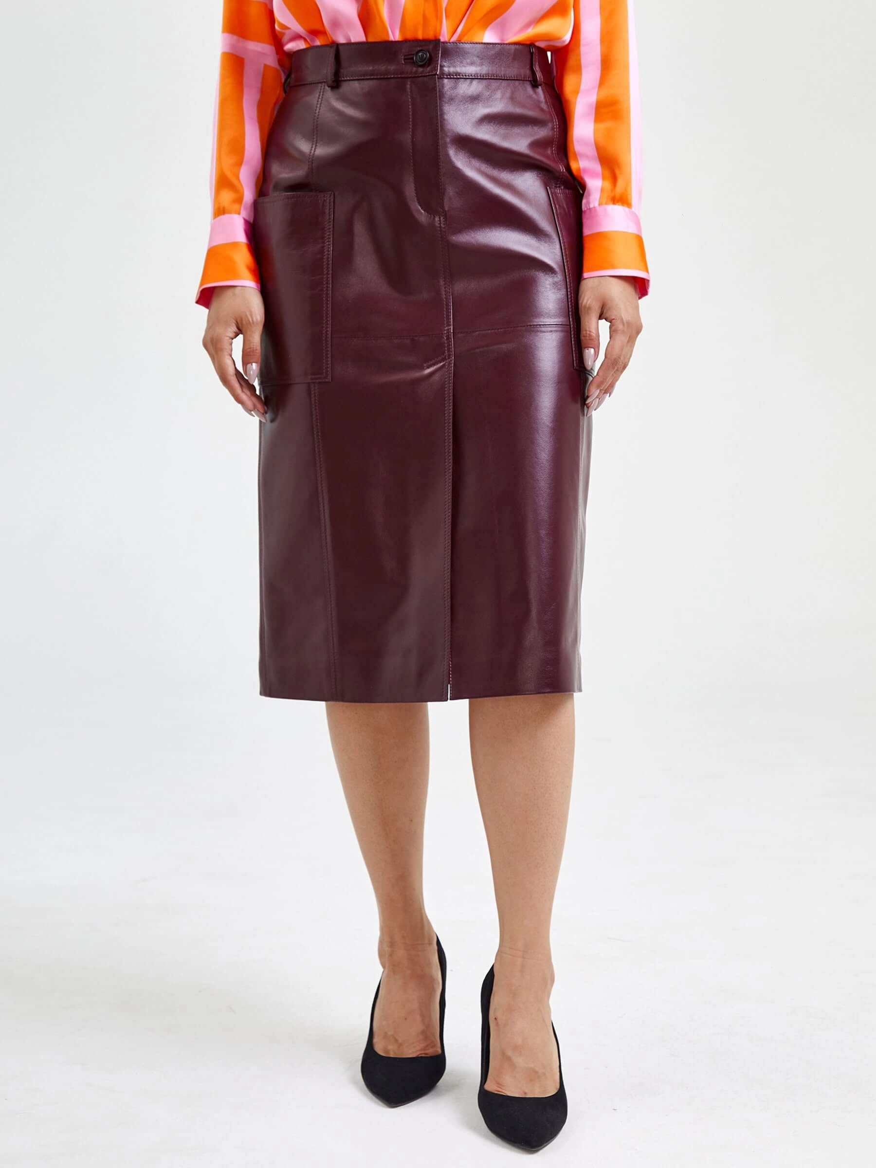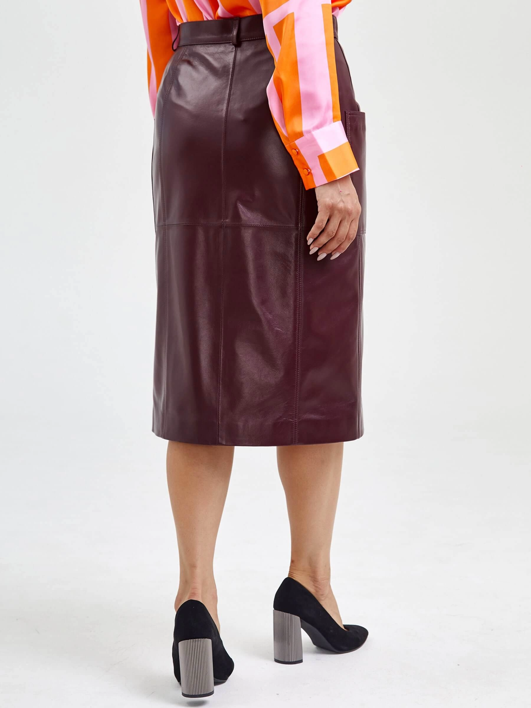 Товар кожаная юбка с разрезом 10, бордовая, размер 44, артикул 85590 выполнен из натуральной кожи с застежкой молния. Рассчитан на сезон: демисезон. Длина изделия 76 см, силуэт прямой.