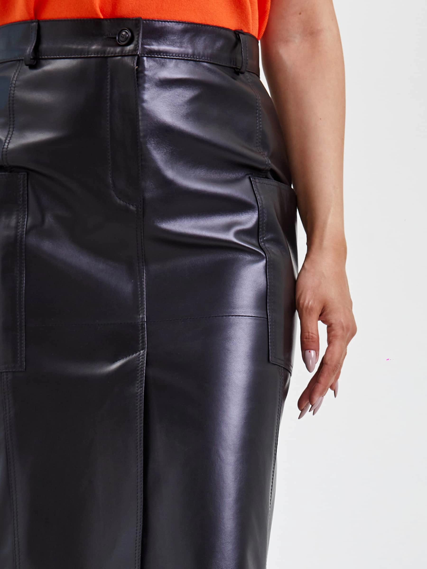 Классическая прямая юбка из натуральной кожи черного цвета длиной 76 см с завышенной посадкой идеально подчеркивает талию, создавая женственный силуэт. Мягкая кожа премиального качества с благородным матовым блеском обеспечивает комфорт в носке, а универсальный прямой крой позволяет создавать разнообразные образы — от строгих офисных с рубашками и лоферами до повседневных с объемными джемперами и кедами. Практичные детали: два накладных кармана и элегантный разрез спинке добавляют функциональности, сохраняя чистоту линий. Для вечернего выхода сочетайте с шелковым топом и лодочками — эта кожаная юбка станет идеальной основой гардероба, гарантируя безупречный вид благодаря долговечности натуральной кожи и ее способности сохранять форму в течение всего дня.