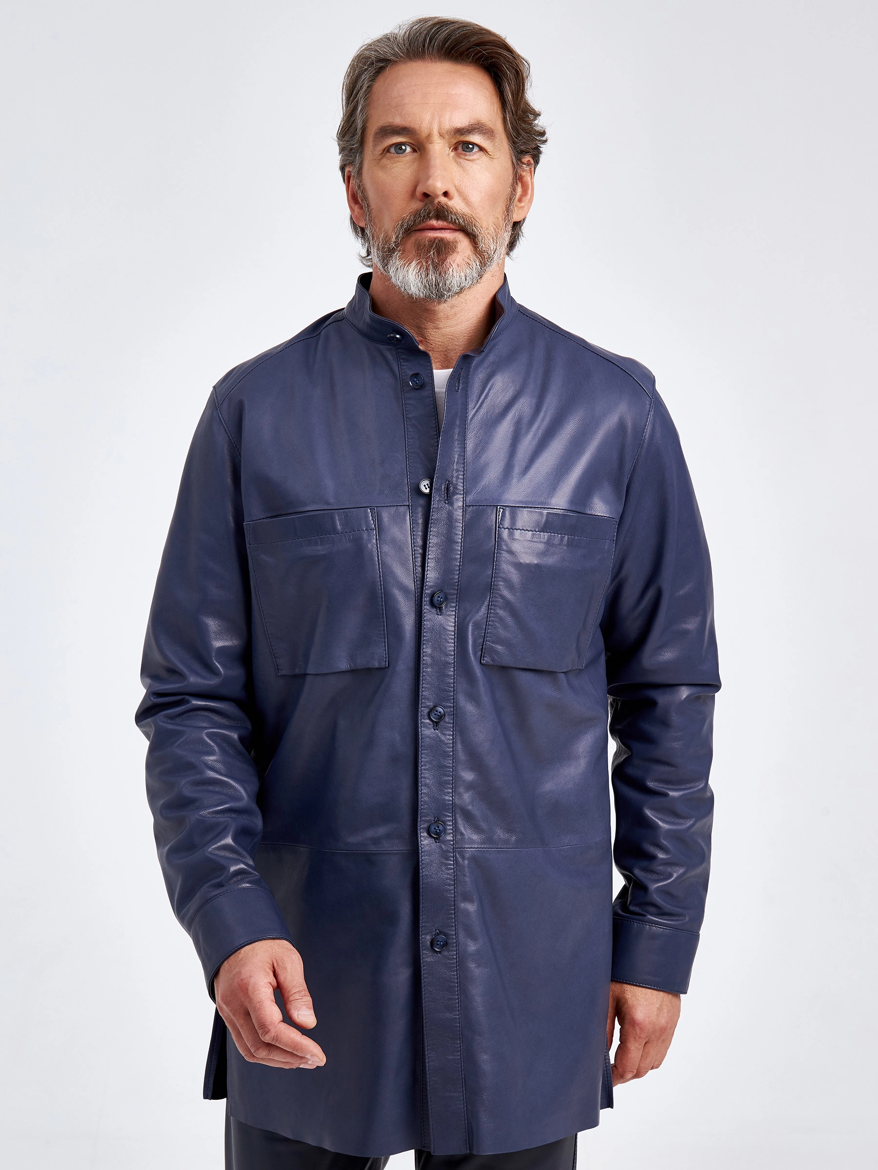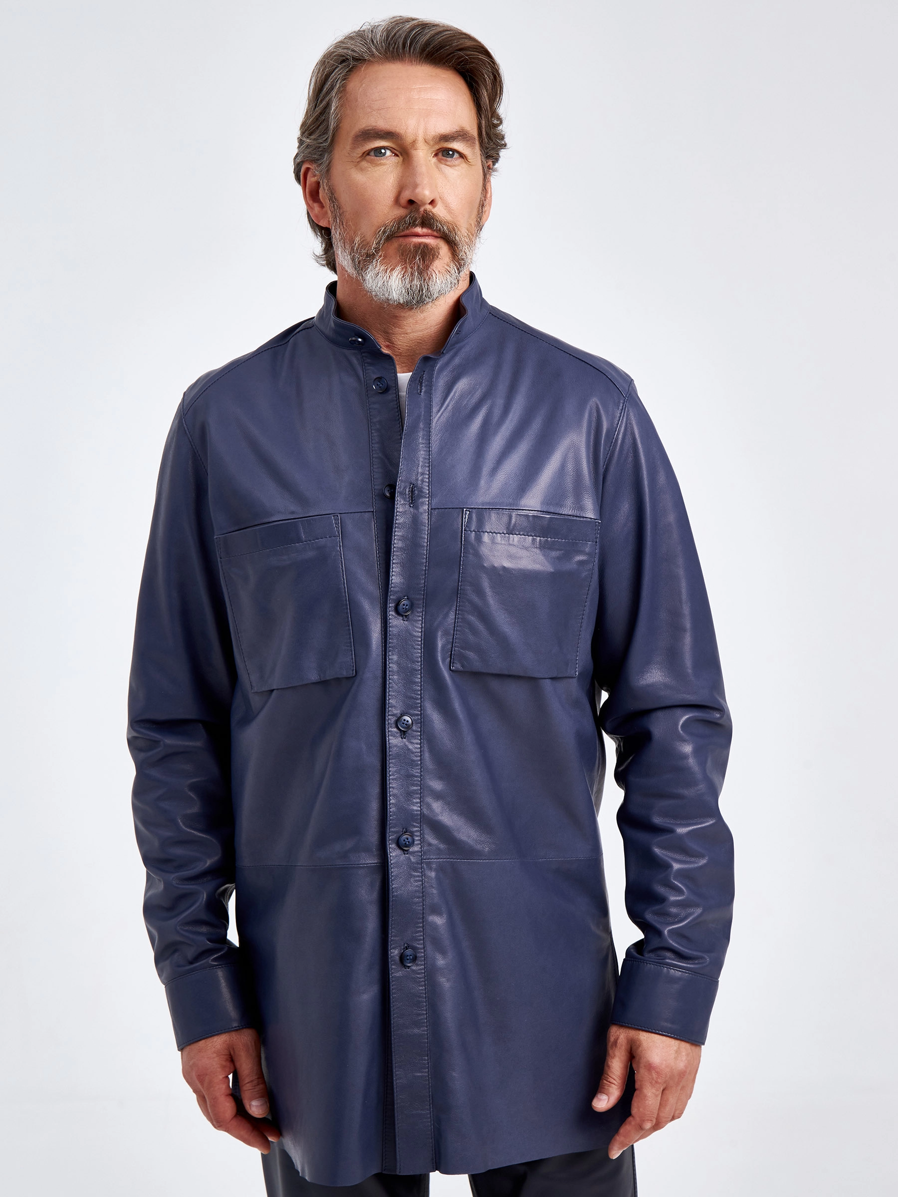 Товар рубашка из натуральной кожи премиум класса для мужчин 01, синяя, размер 48, артикул 130020 выполнен из натуральной кожи с застежкой пуговицы. Рассчитан на сезон: демисезон. Длина изделия 85 см, силуэт прямой.