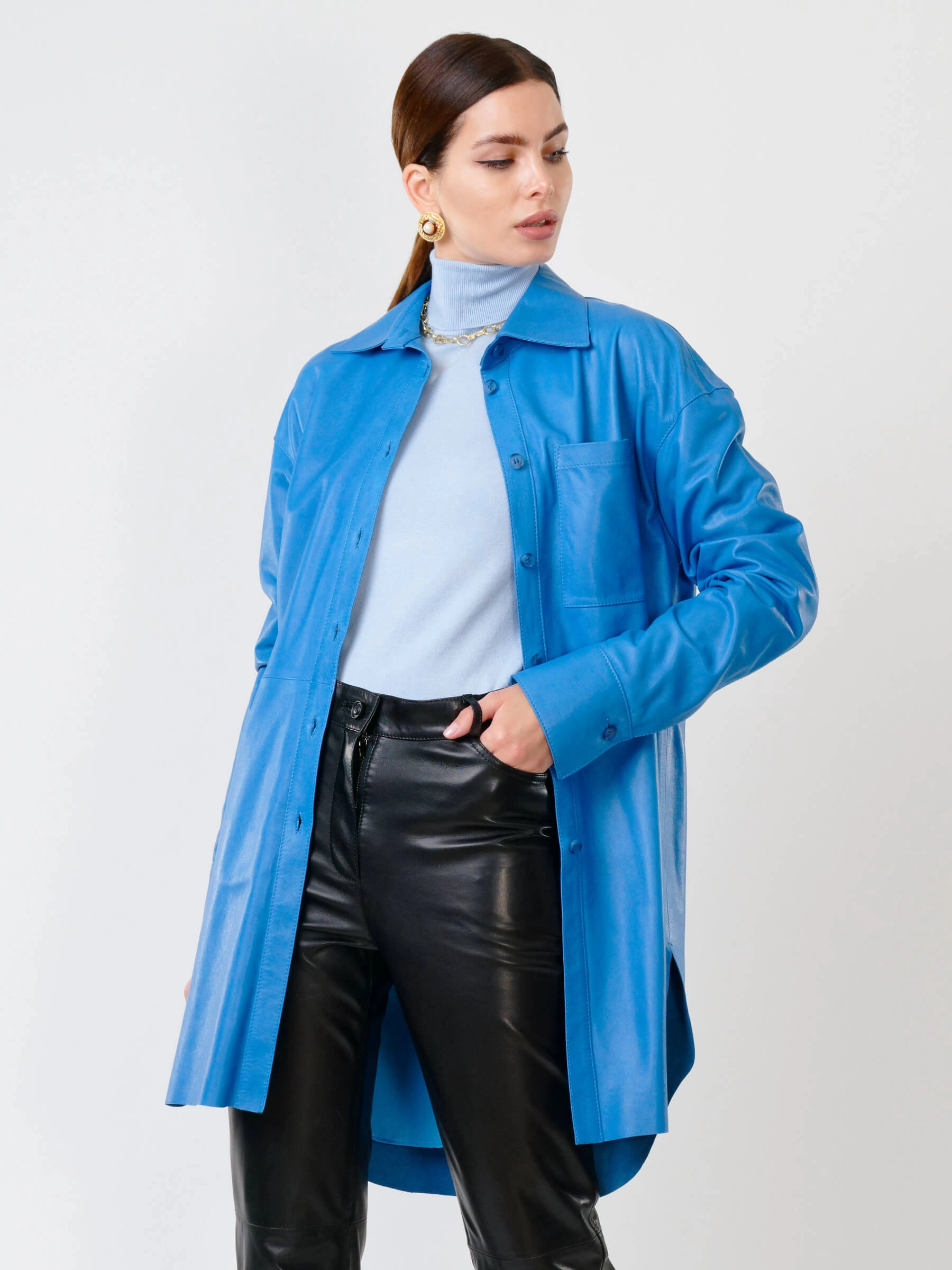Женская рубашка из мягкой натуральной кожи в четырех цветах — идеальный баланс стиля и практичности. Прямой силуэт с застежкой на пуговицах оформлен изысканным отложным воротником и аккуратными манжетами, а функциональный нагрудный карман и изящные закругленные разрезы по бокам добавляют образу характер. Широкий кожаный пояс подчеркивает талию, позволяя варьировать образ от бунтарского с кожаными брюками и ботильонами до непринужденного с джинсами и кедами. Особую прелесть модели придает бархатистая фактура кожи, которая великолепно играет со светом, сохраняя при этом комфорт при носке. Универсальный оттенки, удобная посадка и продуманные детали делают эту рубашку must-have для ценительниц небанальных решений в повседневном гардеробе.