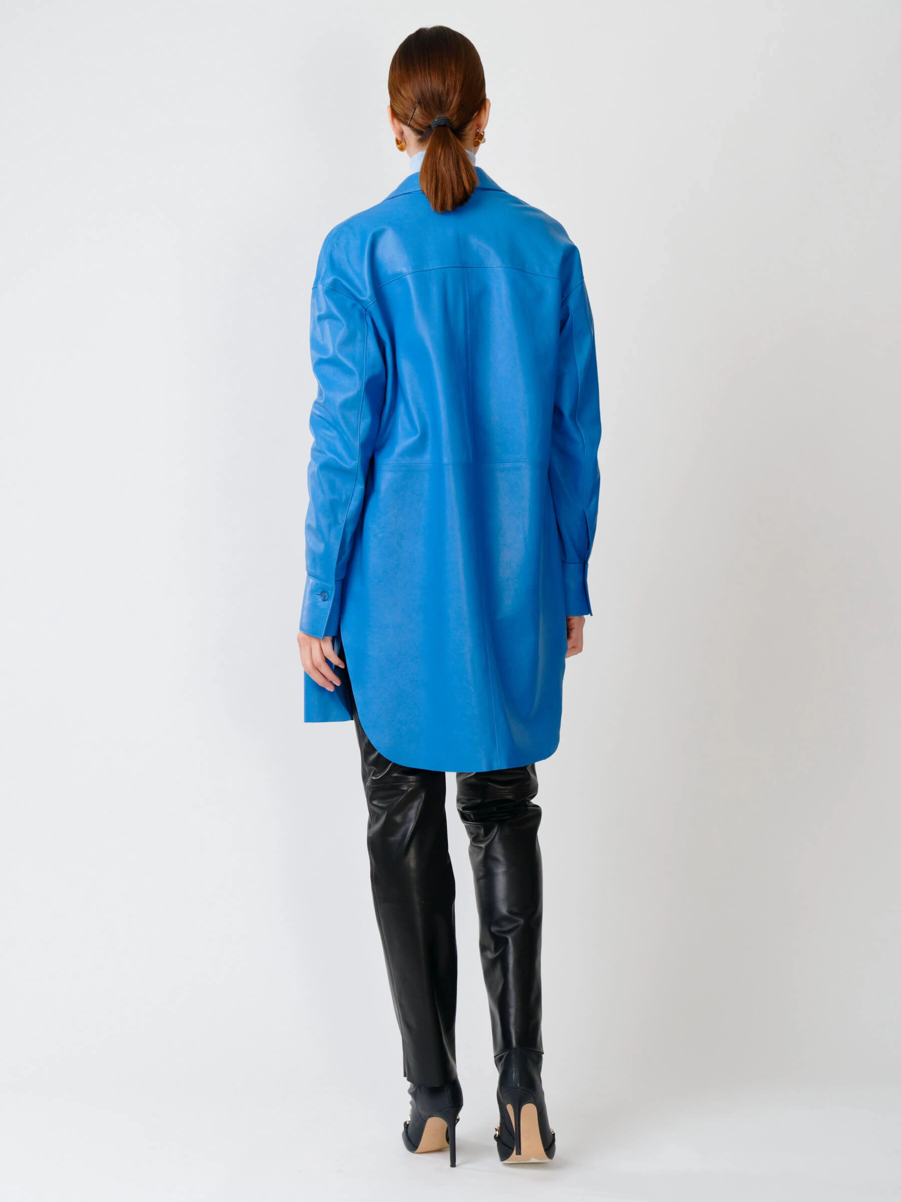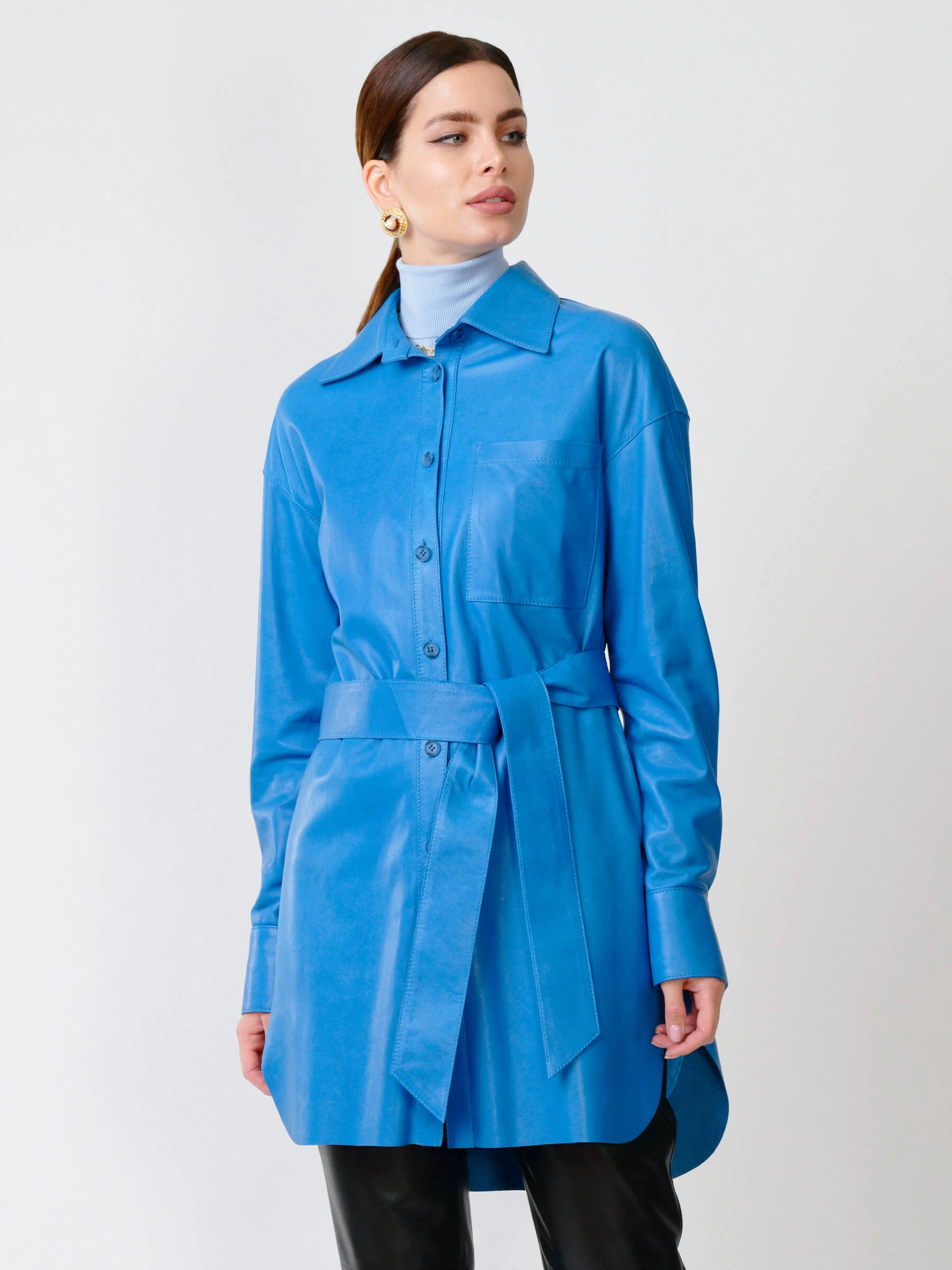 Товар женская кожаная рубашка с поясом из натуральной кожи 01_1, голубая, размер 46, артикул 90751 выполнен из натуральной кожи с застежкой пуговицы. Рассчитан на сезон: весна-лето. Длина изделия 94 см, силуэт свободный.