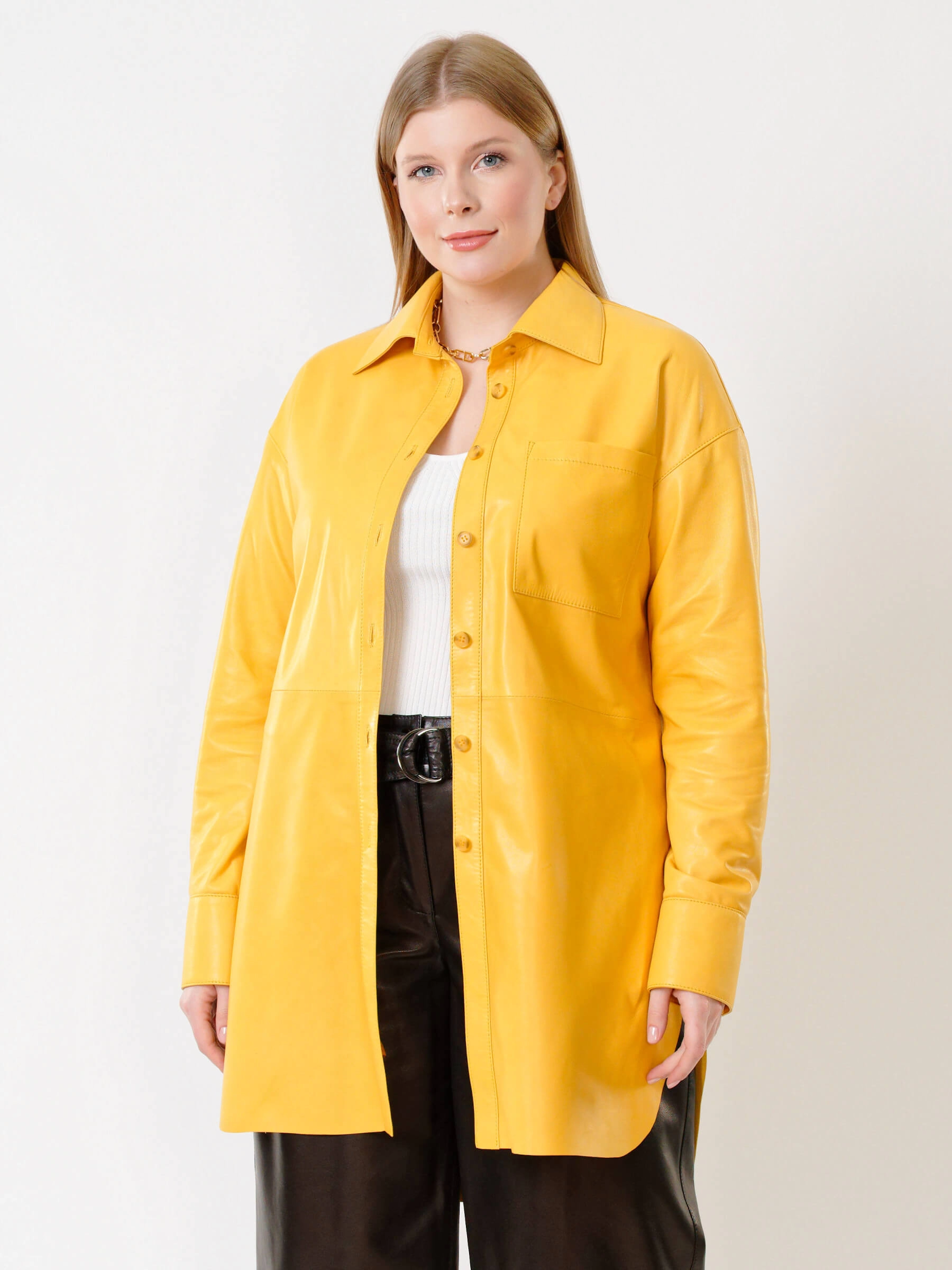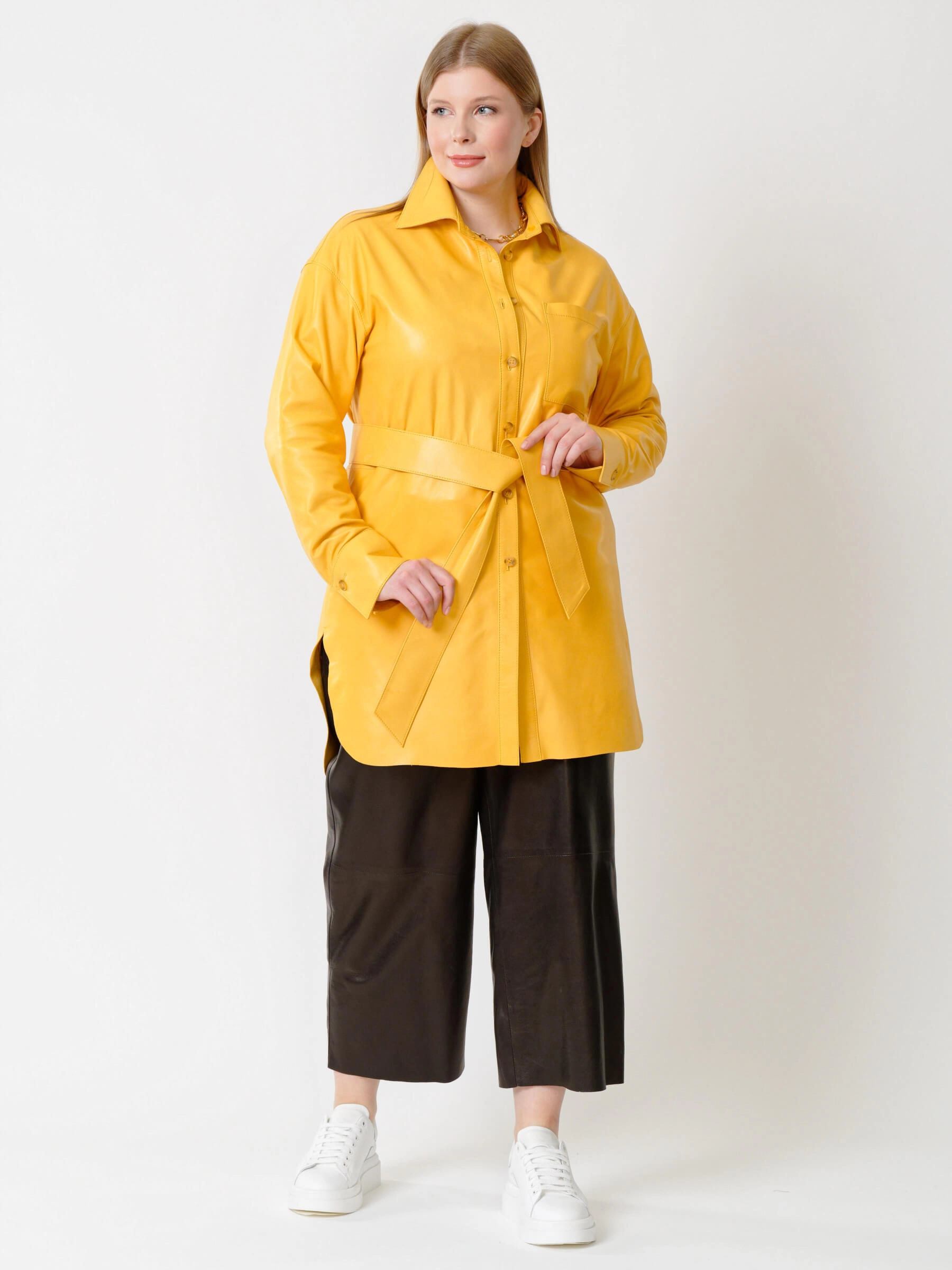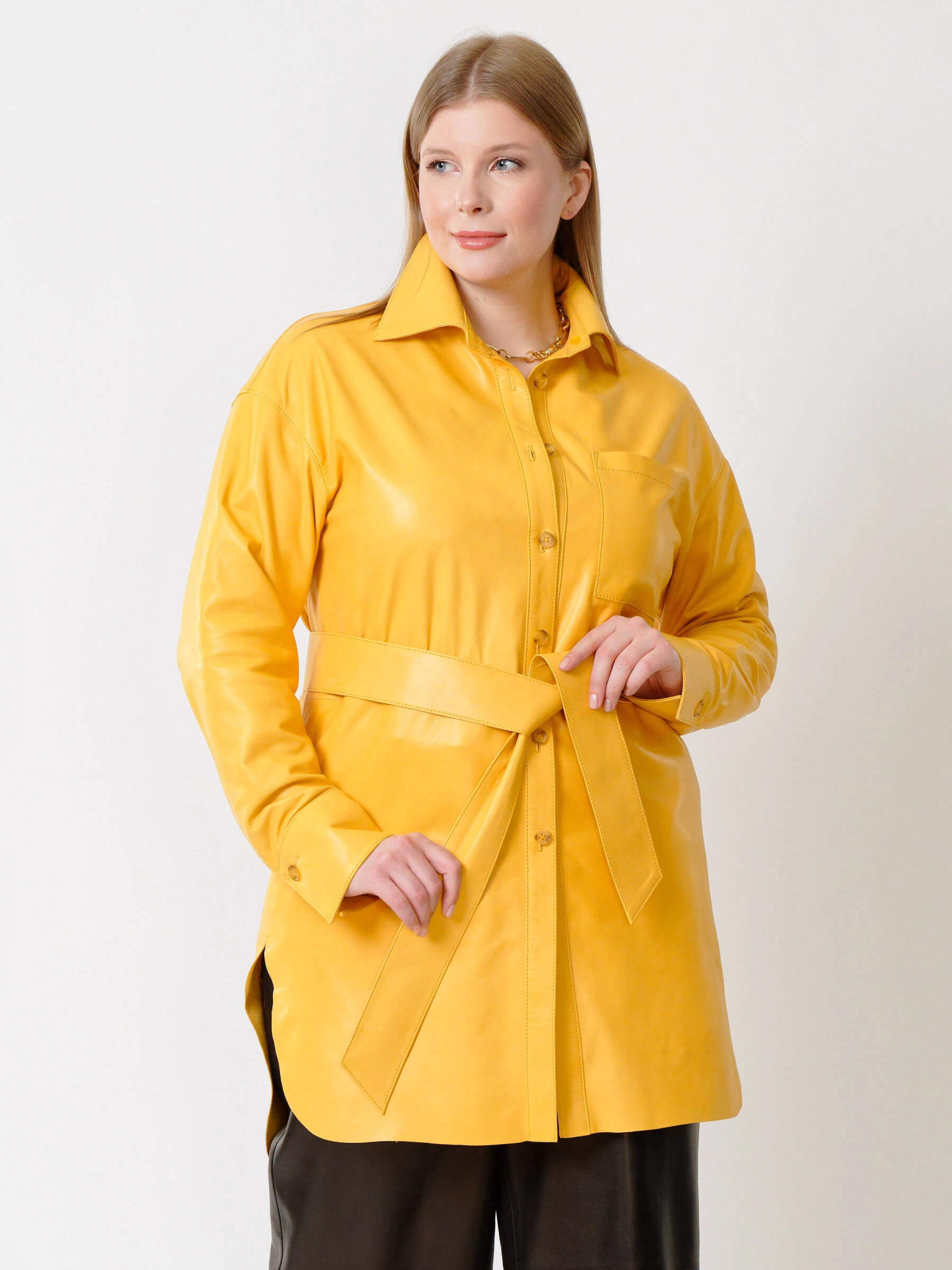 Товар кожаная женская рубашка с поясом из натуральной кожи 01_2, желтая, размер 48, артикул 91402 выполнен из натуральной кожи с застежкой пуговицы. Рассчитан на сезон: весна-лето. Длина изделия 94 см, силуэт свободный.
