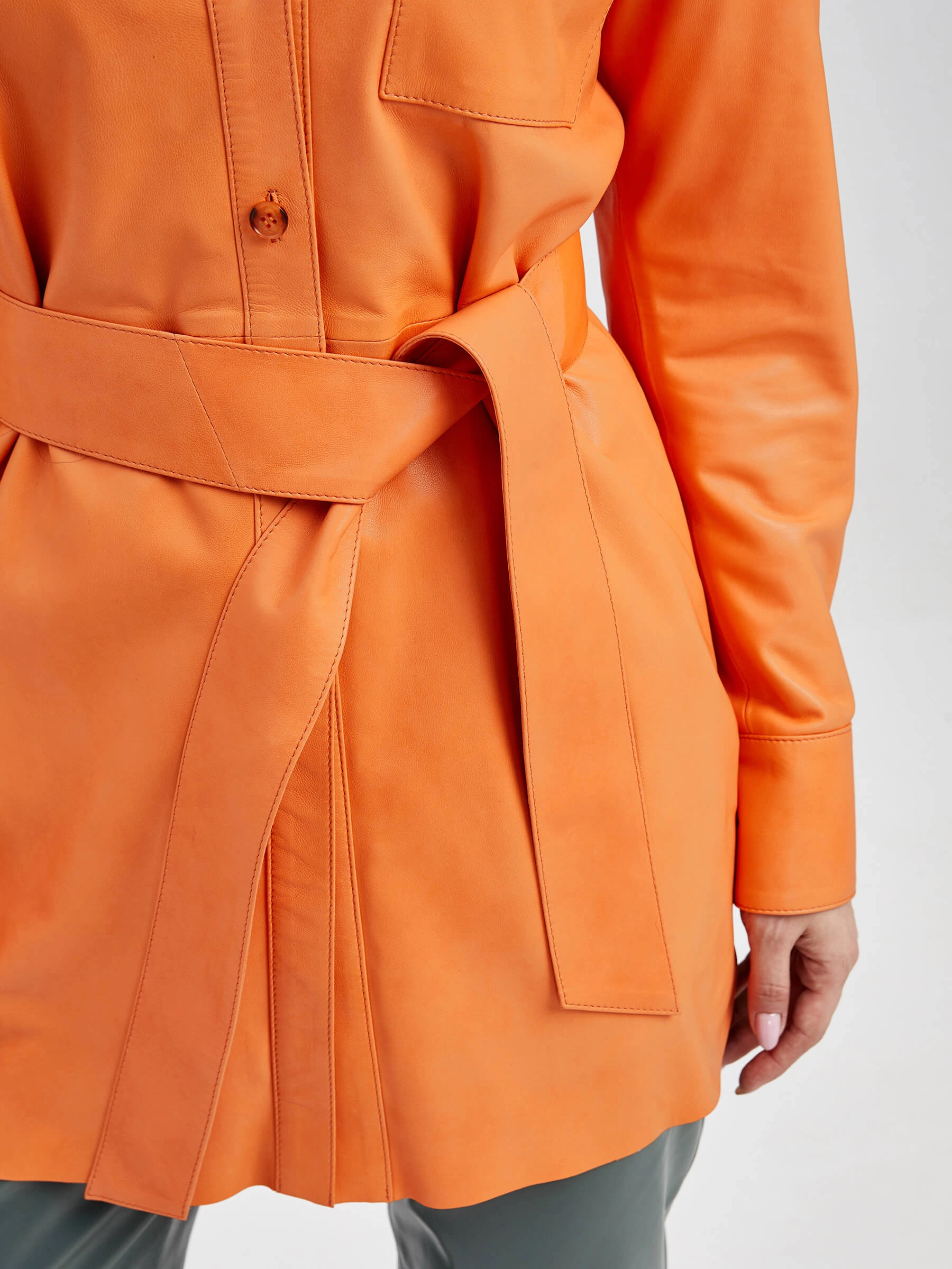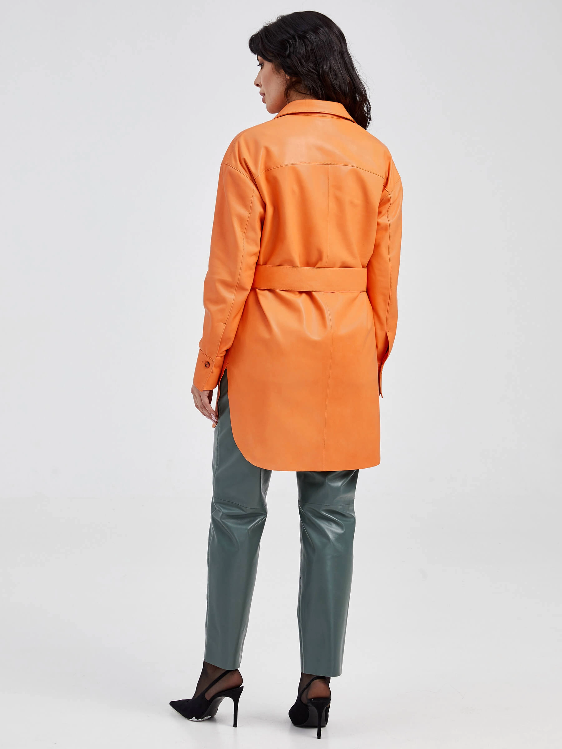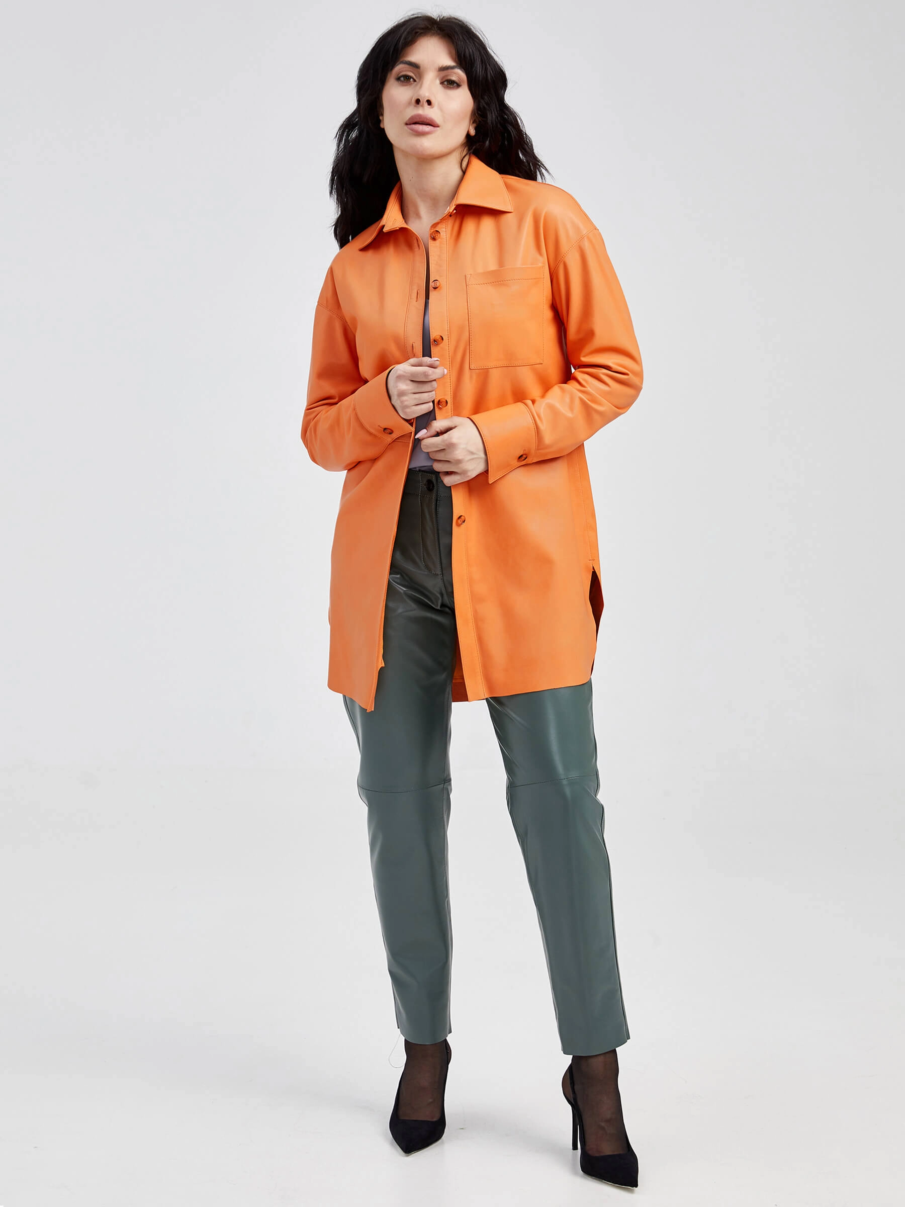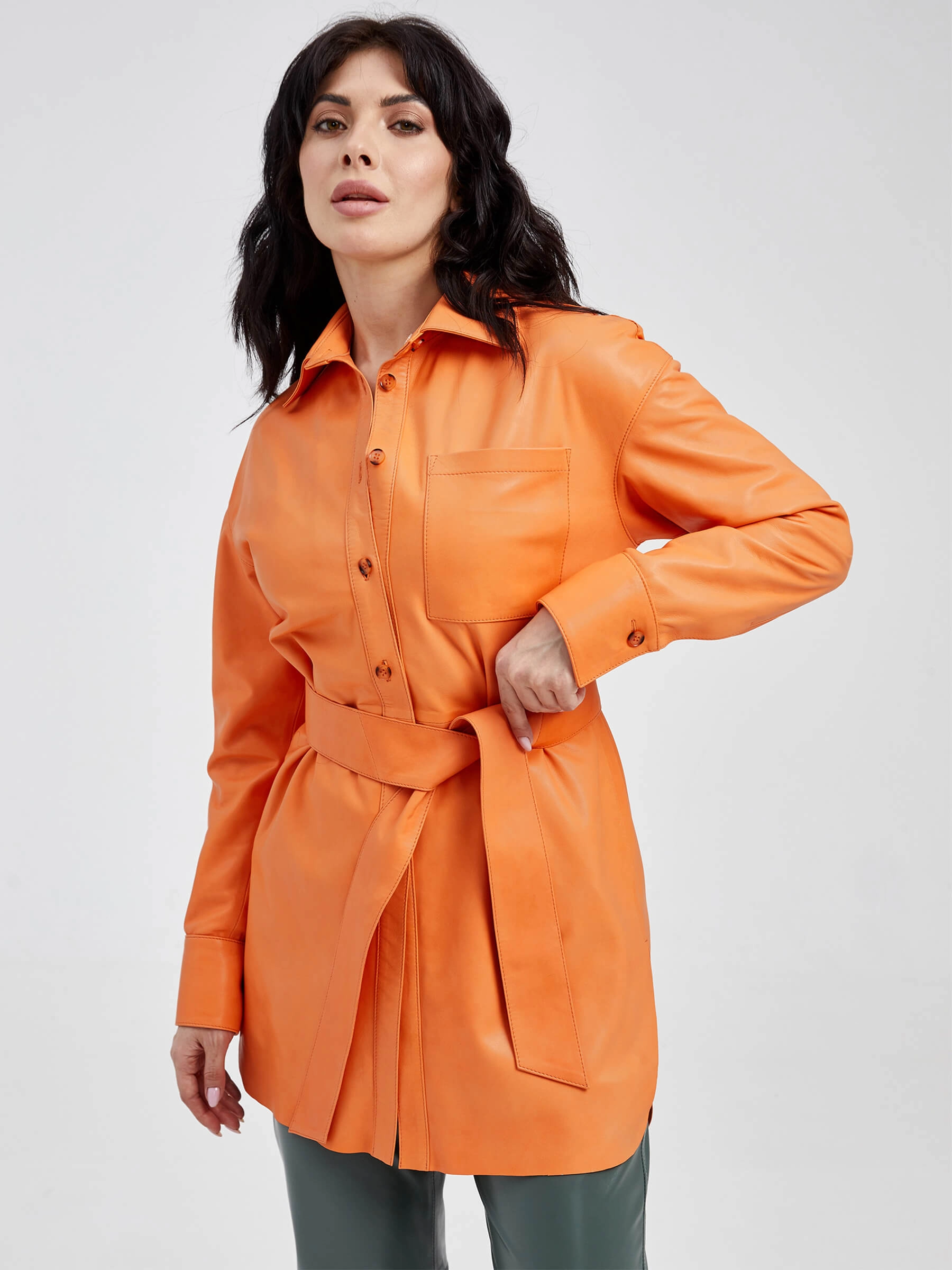 Женская рубашка из мягкой натуральной кожи в сочном оранжевом оттенке — воплощение яркого стиля и практичности. Прямой силуэт с застежкой на пуговицах оформлен элегантным отложным воротником и аккуратными манжетами, а функциональный нагрудный карман и стильные закругленные разрезы по бокам добавляют образу динамики. Широкий кожаный пояс подчеркивает талию, позволяя создавать разные образы — от дерзкого сочетания с кожаными брюками и ботильонами до непринужденного лука с джинсами и кедами. Бархатистая фактура кожи с мягким блеском эффектно играет на свету, подчеркивая насыщенный оранжевый оттенок, при этом обеспечивая комфорт при носке. Удобная посадка, продуманные детали и универсальность делают эту рубашку идеальным выбором для тех, кто любит смелые цветовые акценты и нестандартные решения в повседневном гардеробе. Яркий оранжевый тон придаст энергии вашему образу и станет стильным акцентом в любой сезон.