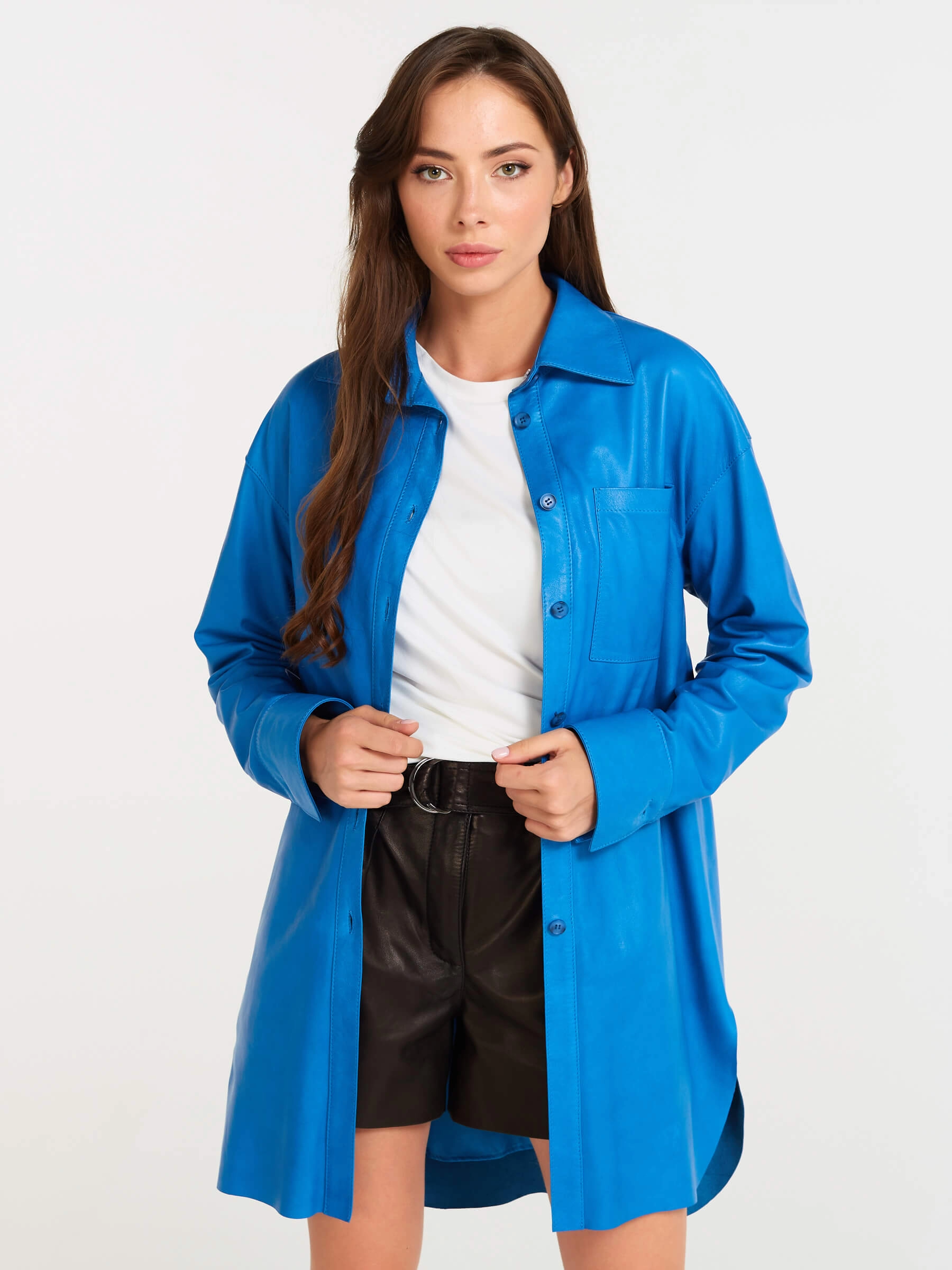 Яркая женская кожаная рубашка насыщенного цвета с прямым силуэтом станет стильным акцентом вашего образа. Модель с застежкой на пуговицах дополнена классическим отложным воротником, манжетами на рукавах и практичным нагрудным карманом. Стильные закругленные боковые разрезы и широкий кожаный пояс добавляют образу динамики и индивидуальности. Эта рубашка – универсальная основа для создания разнообразных луков: сочетайте ее с кожаными брюками и каблуками для дерзкого вечернего образа или носите навыпуск с джинсами и кроссовками для повседневного шика. Благородная фактура натуральной кожи подчеркнет вашу индивидуальность и чувство стиля в любой ситуации.