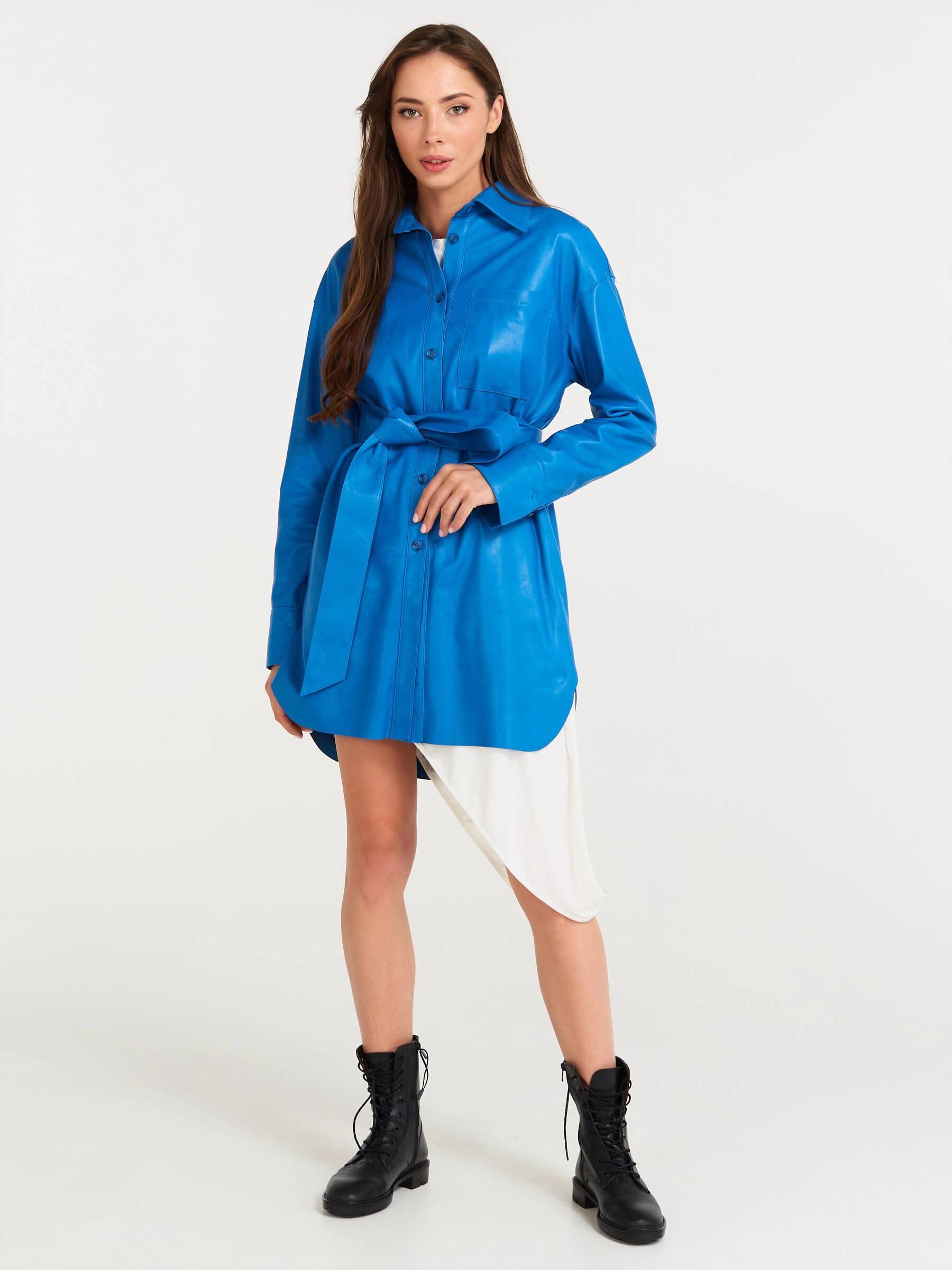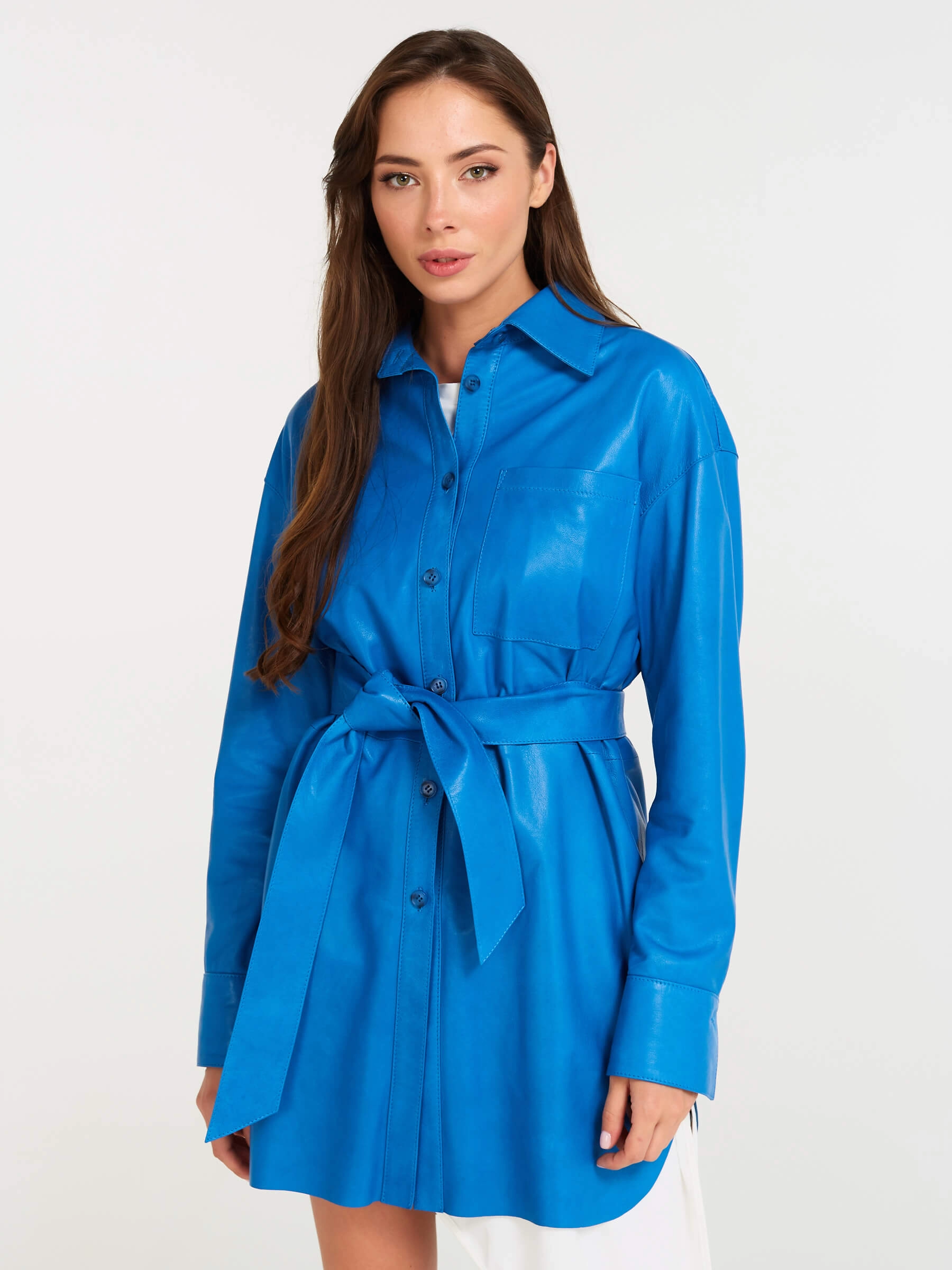 Товар кожаная женская рубашка с поясом из натуральной кожи 01, голубая, размер 48, артикул 90480 выполнен из натуральной кожи с застежкой пуговицы. Рассчитан на сезон: весна-лето. Длина изделия 94 см, силуэт свободный.